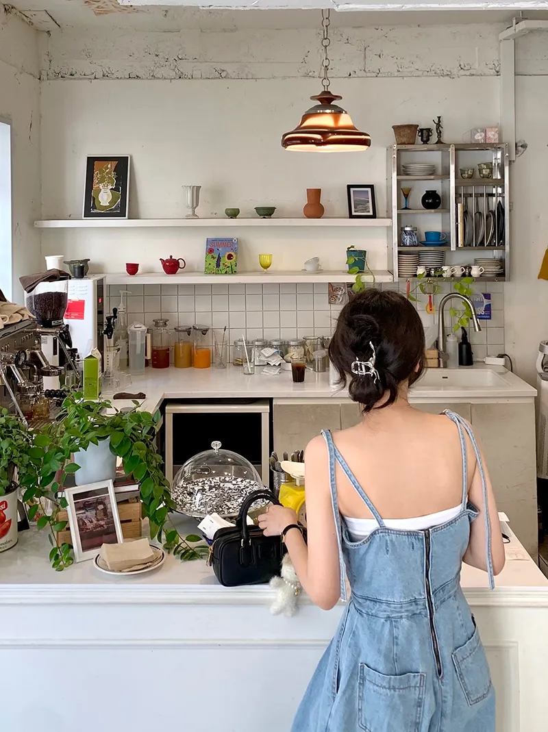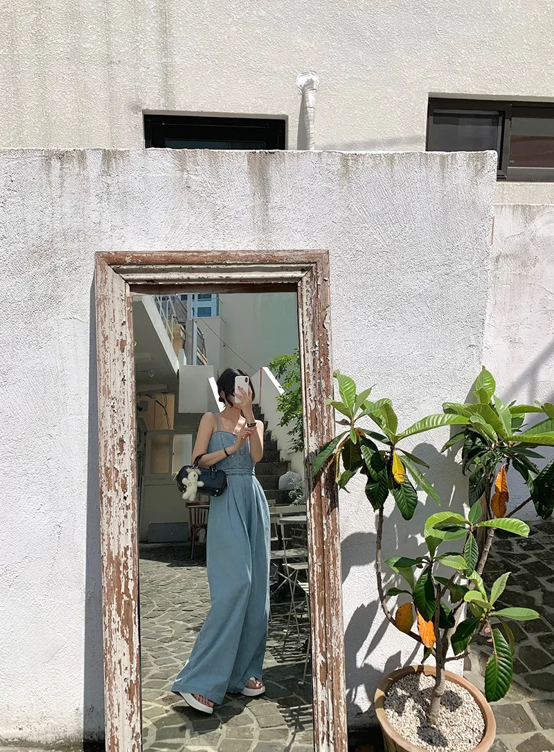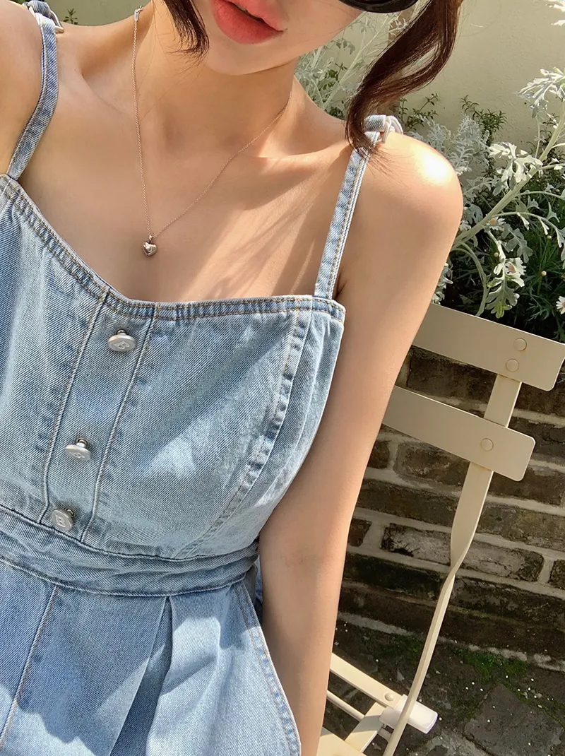 復古方領後拉鍊高腰顯瘦牛仔連身褲