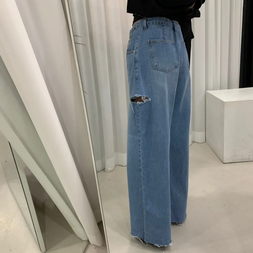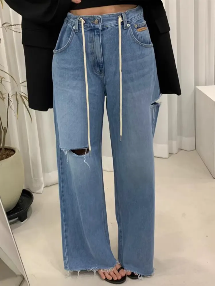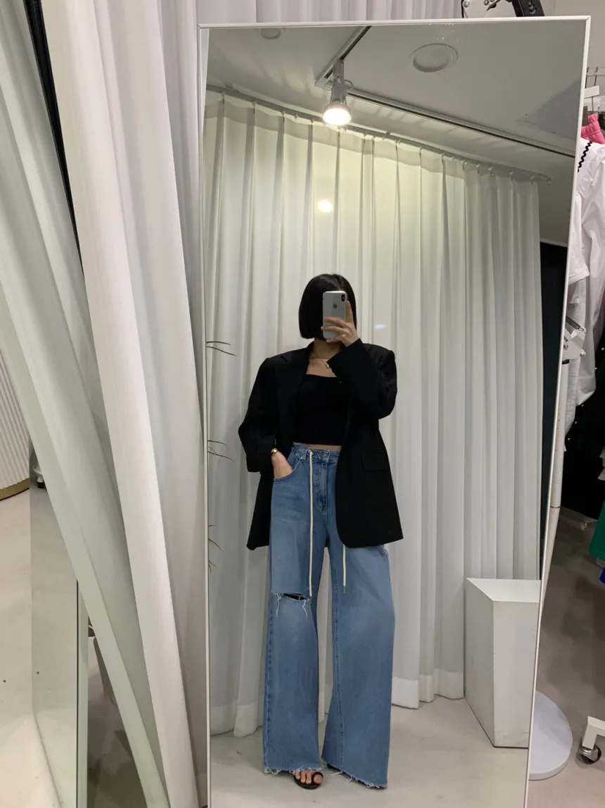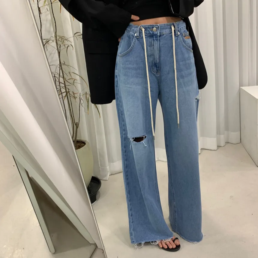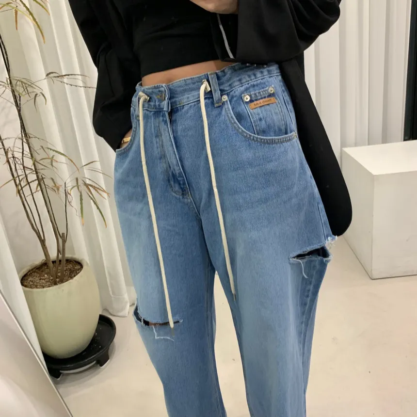 高腰抽繩側破洞牛仔褲