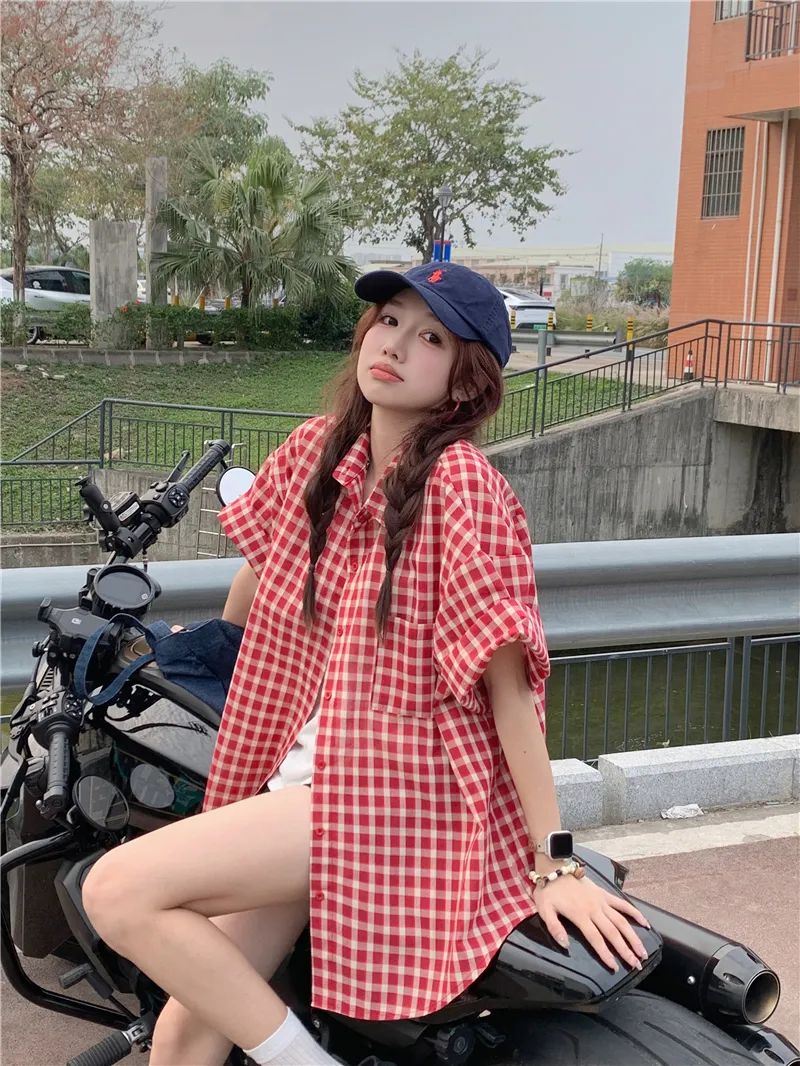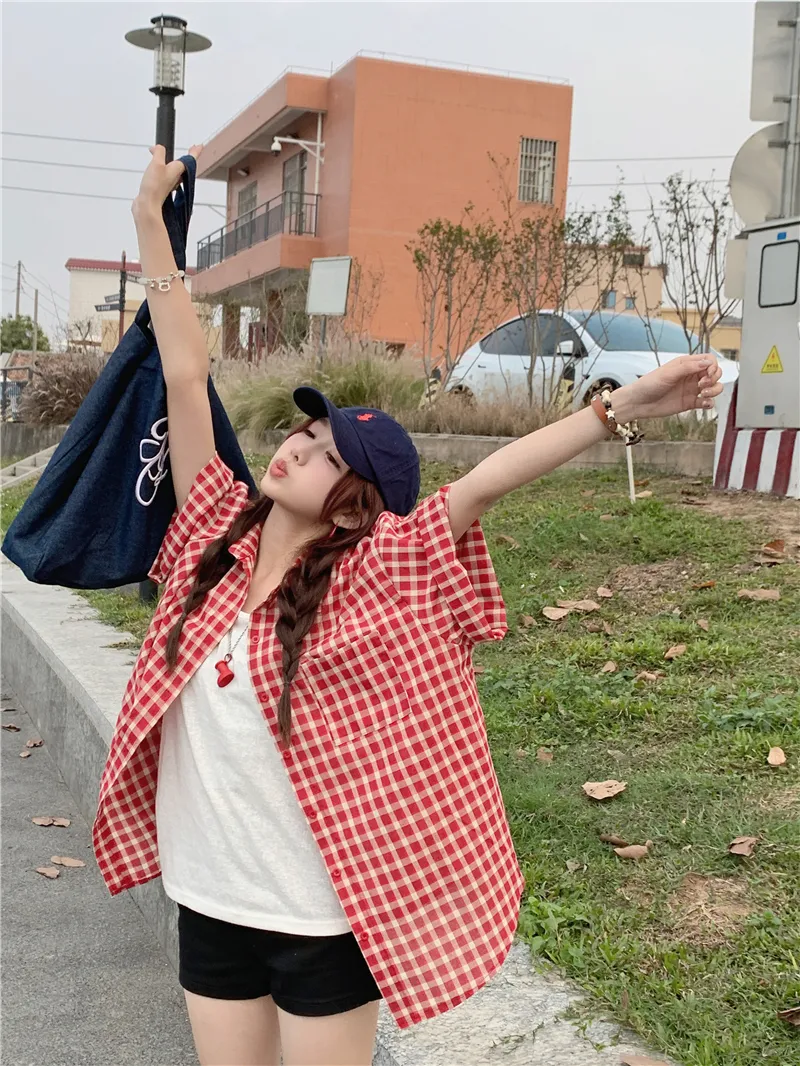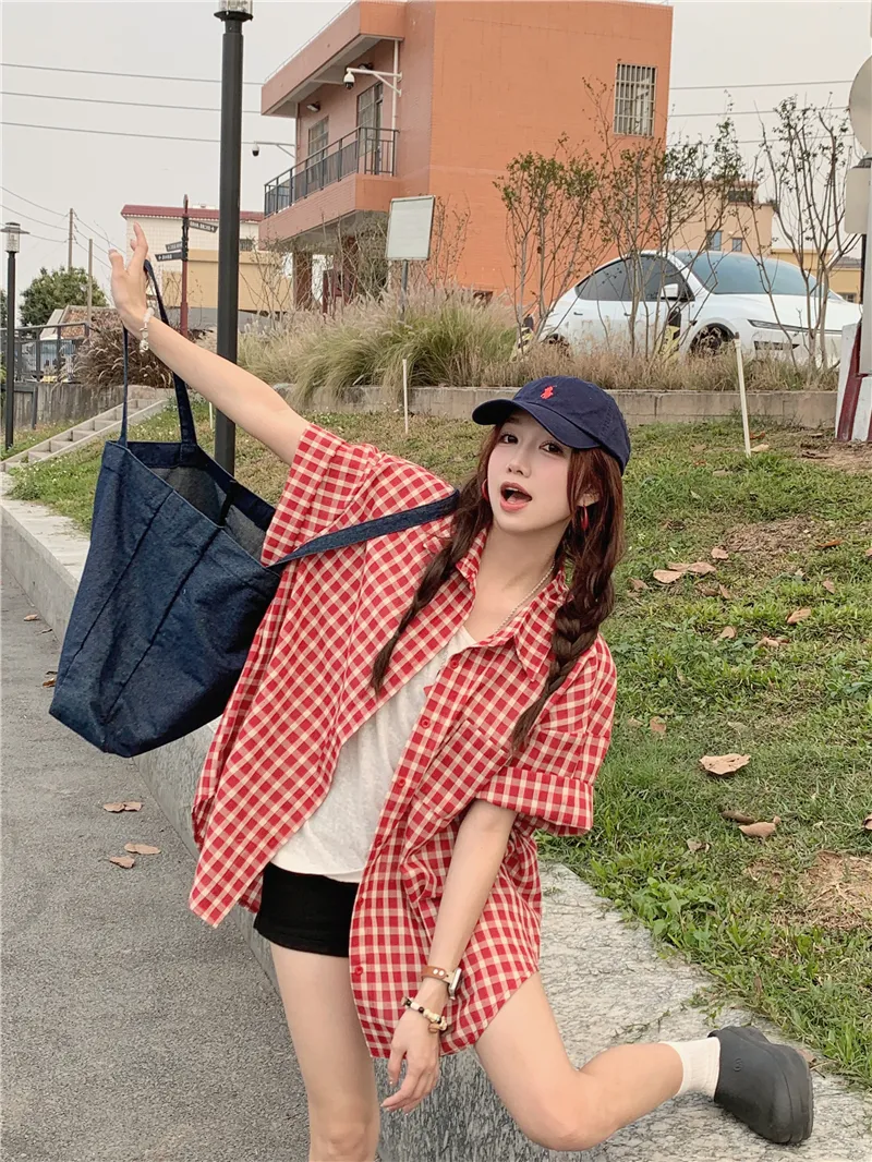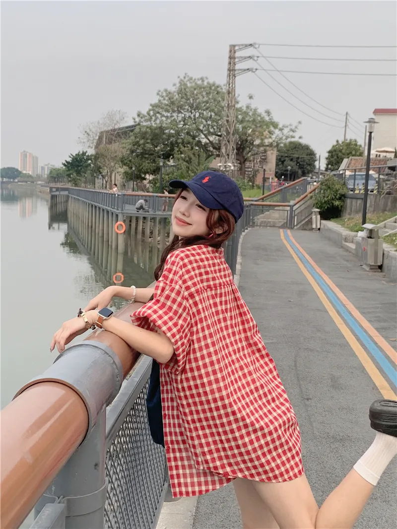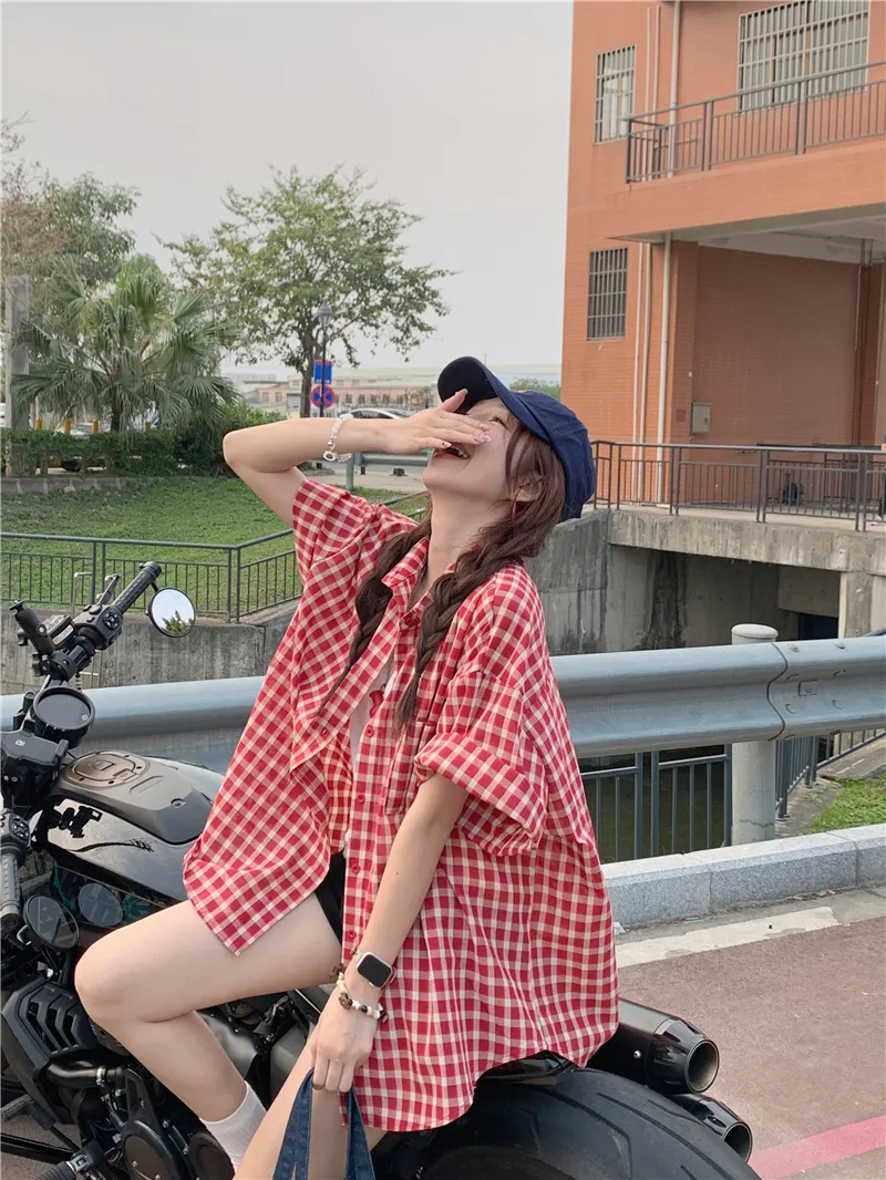 夏日慵懶俏皮紅色格子襯衫