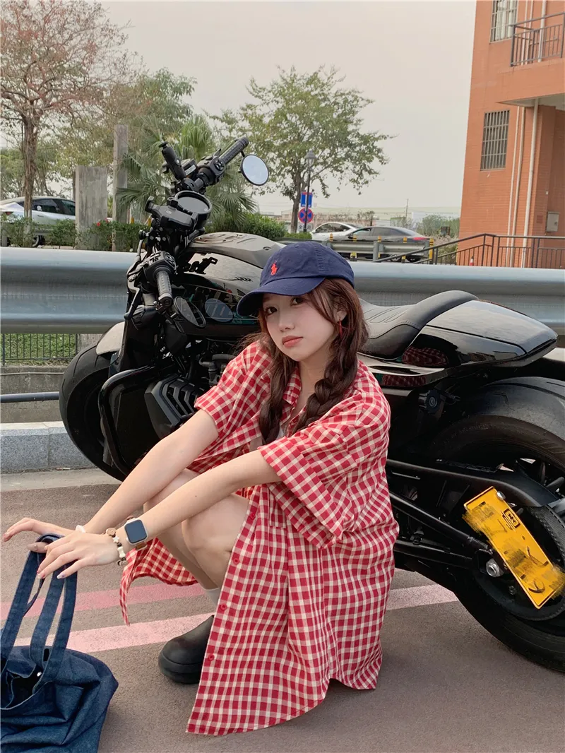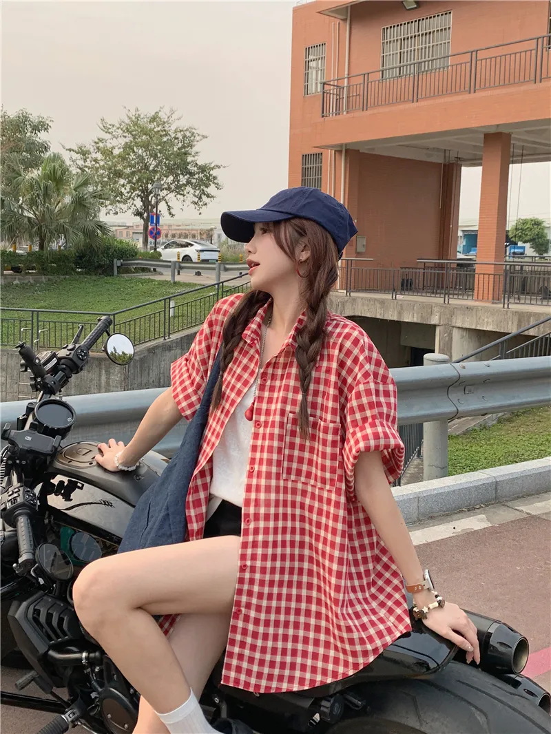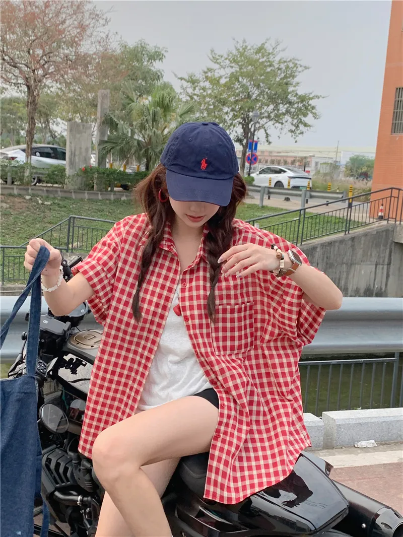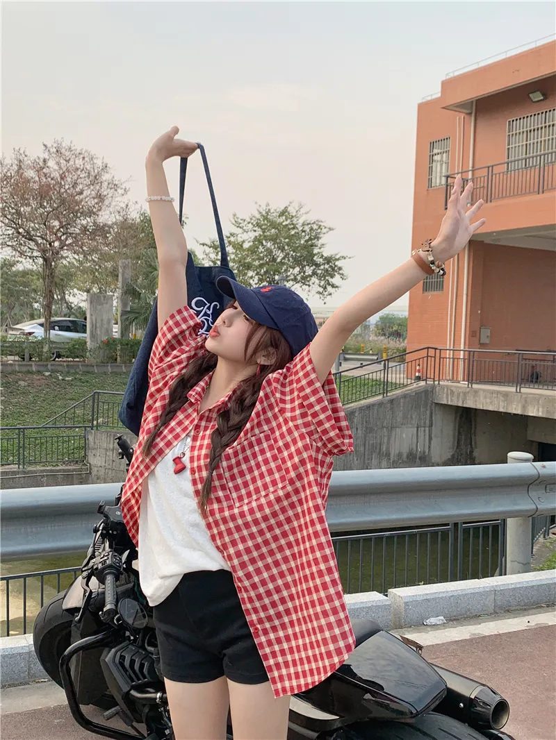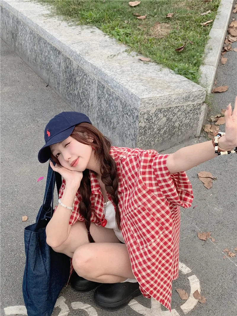夏日慵懶俏皮紅色格子襯衫
