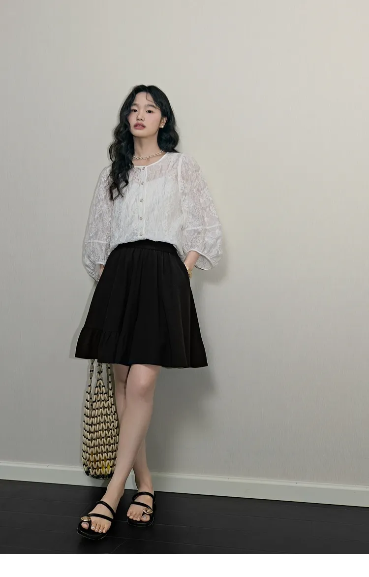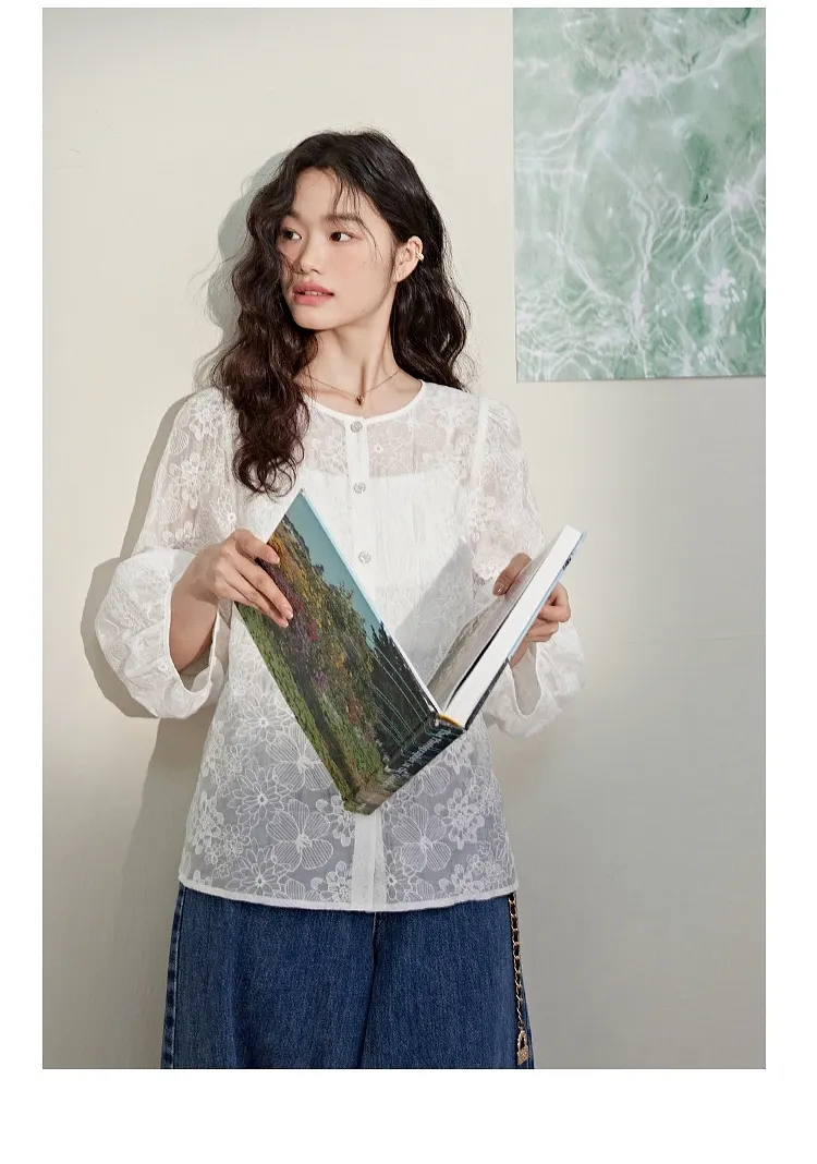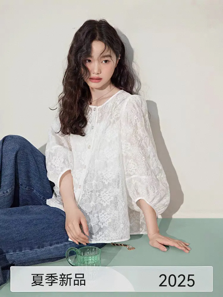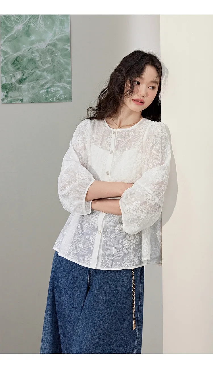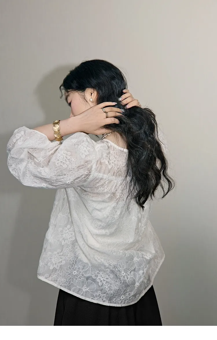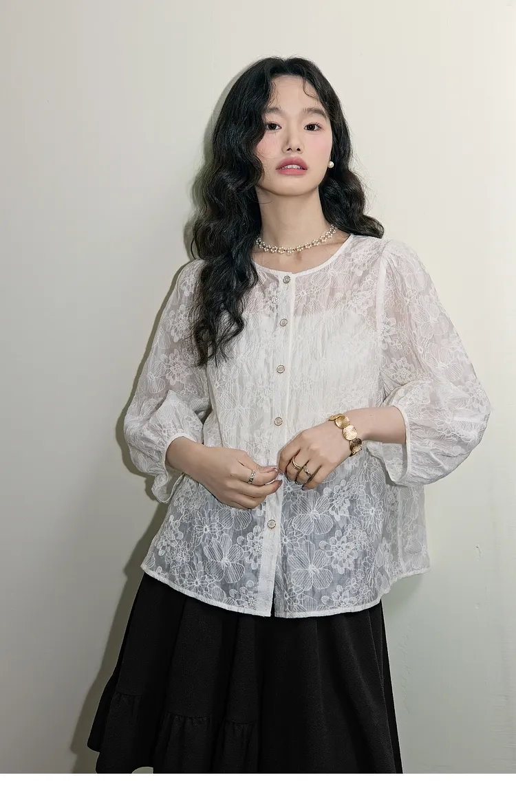 蕾絲浪漫天絲七分袖薄衫