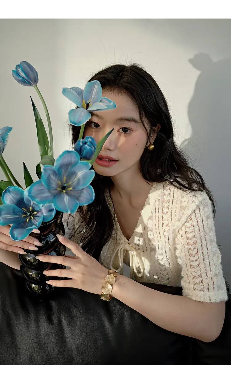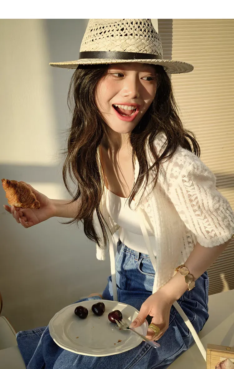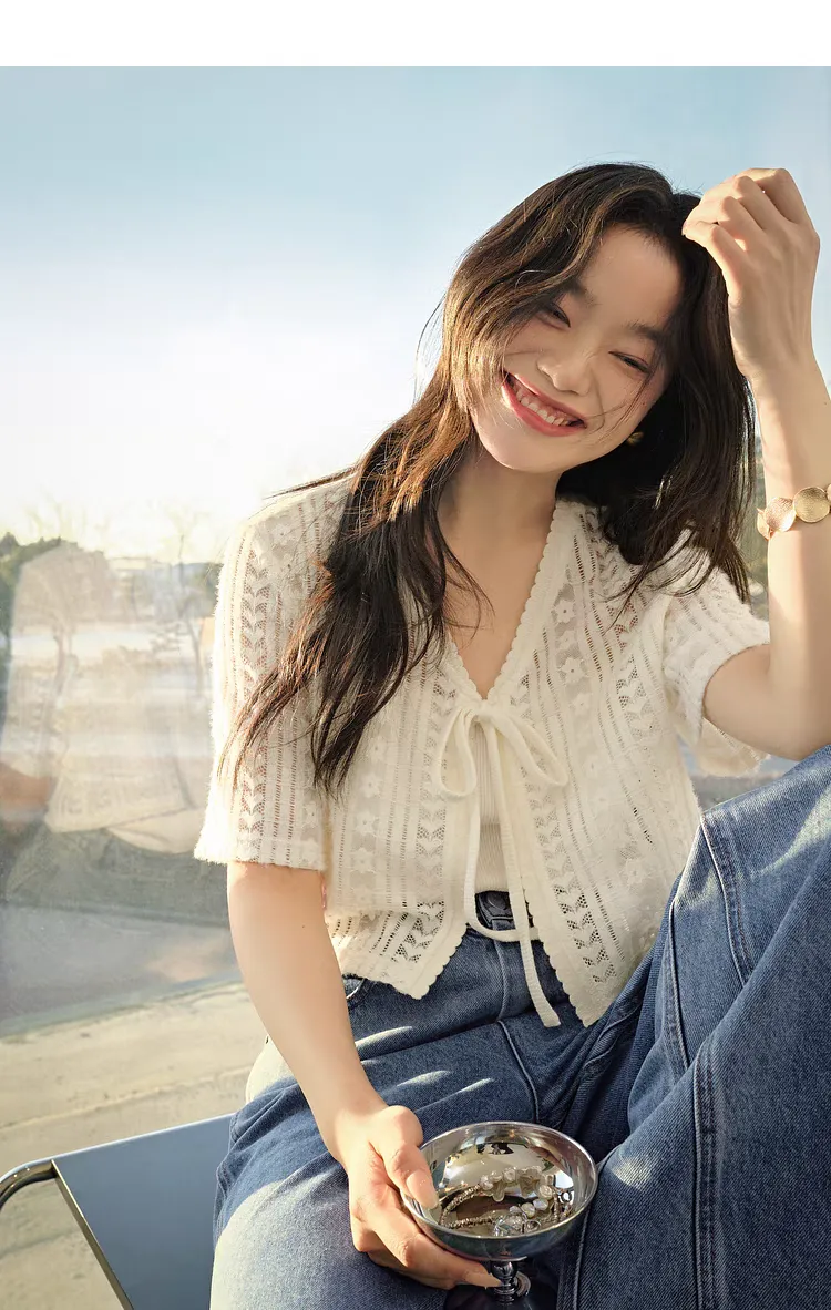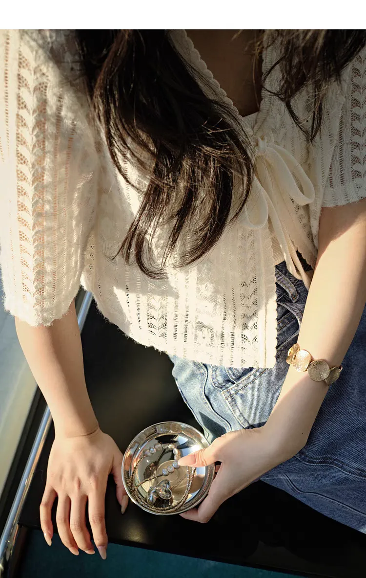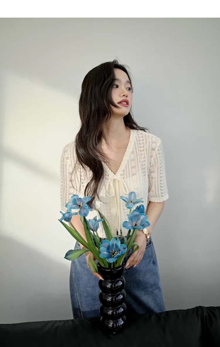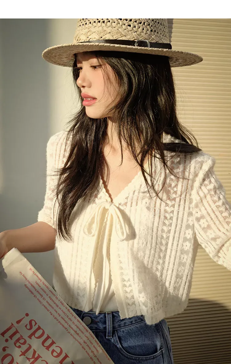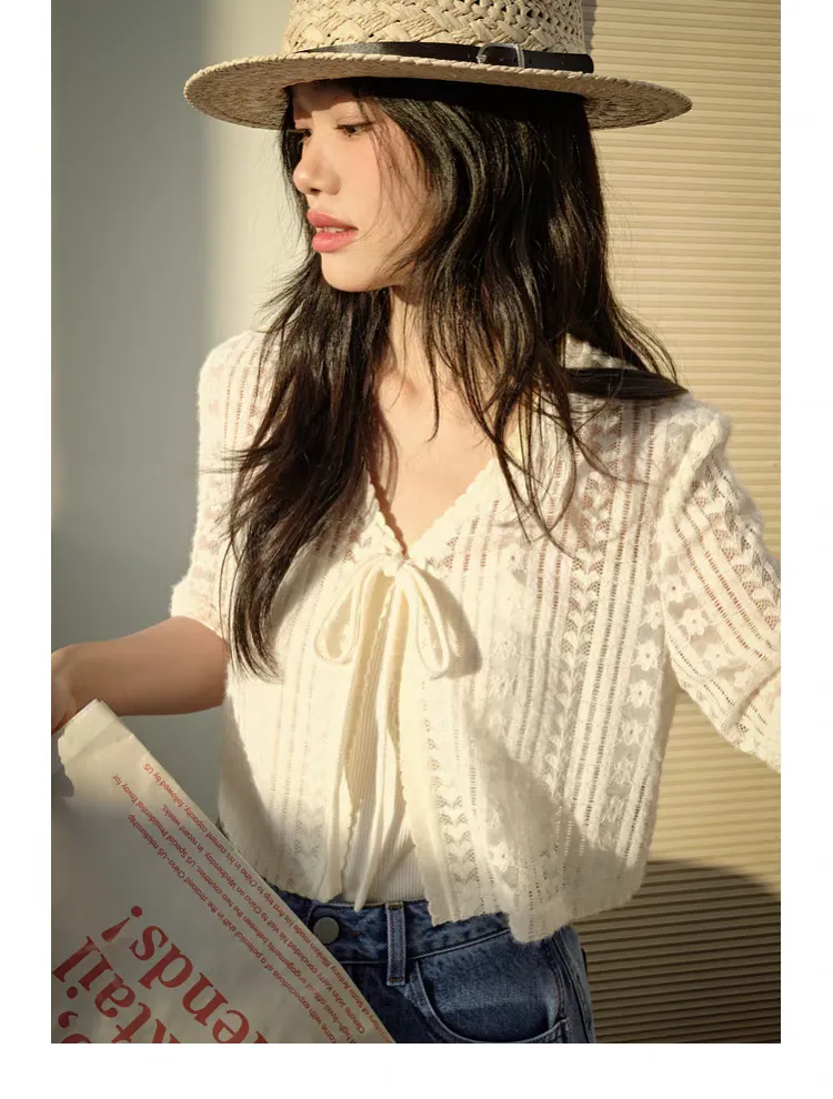 V領短款蕾絲綁帶罩衫