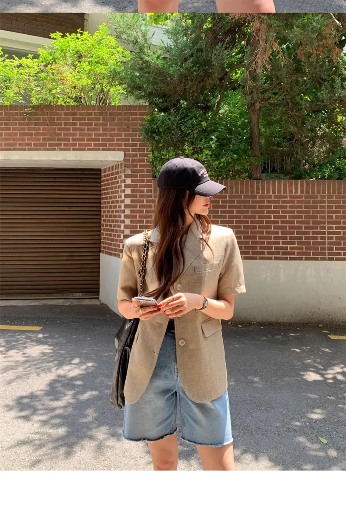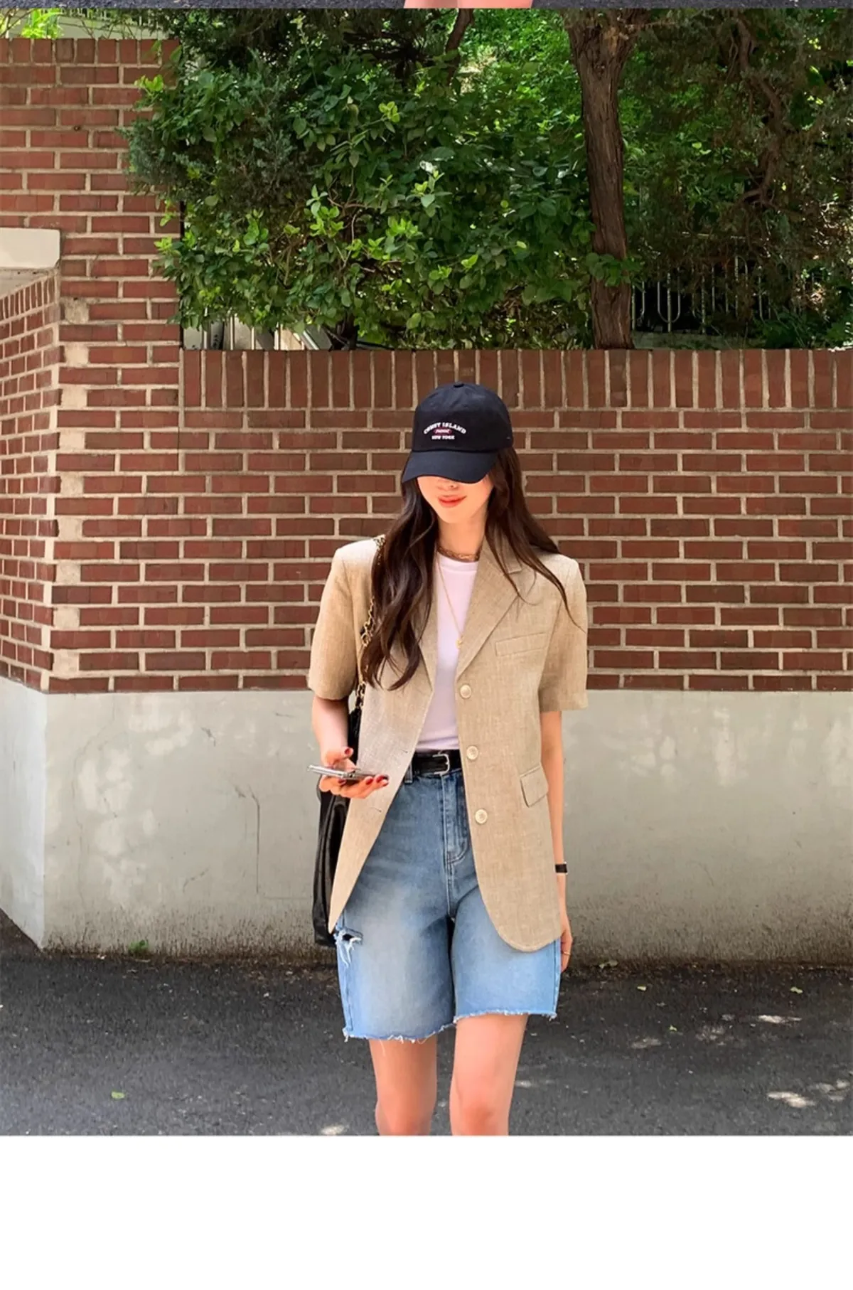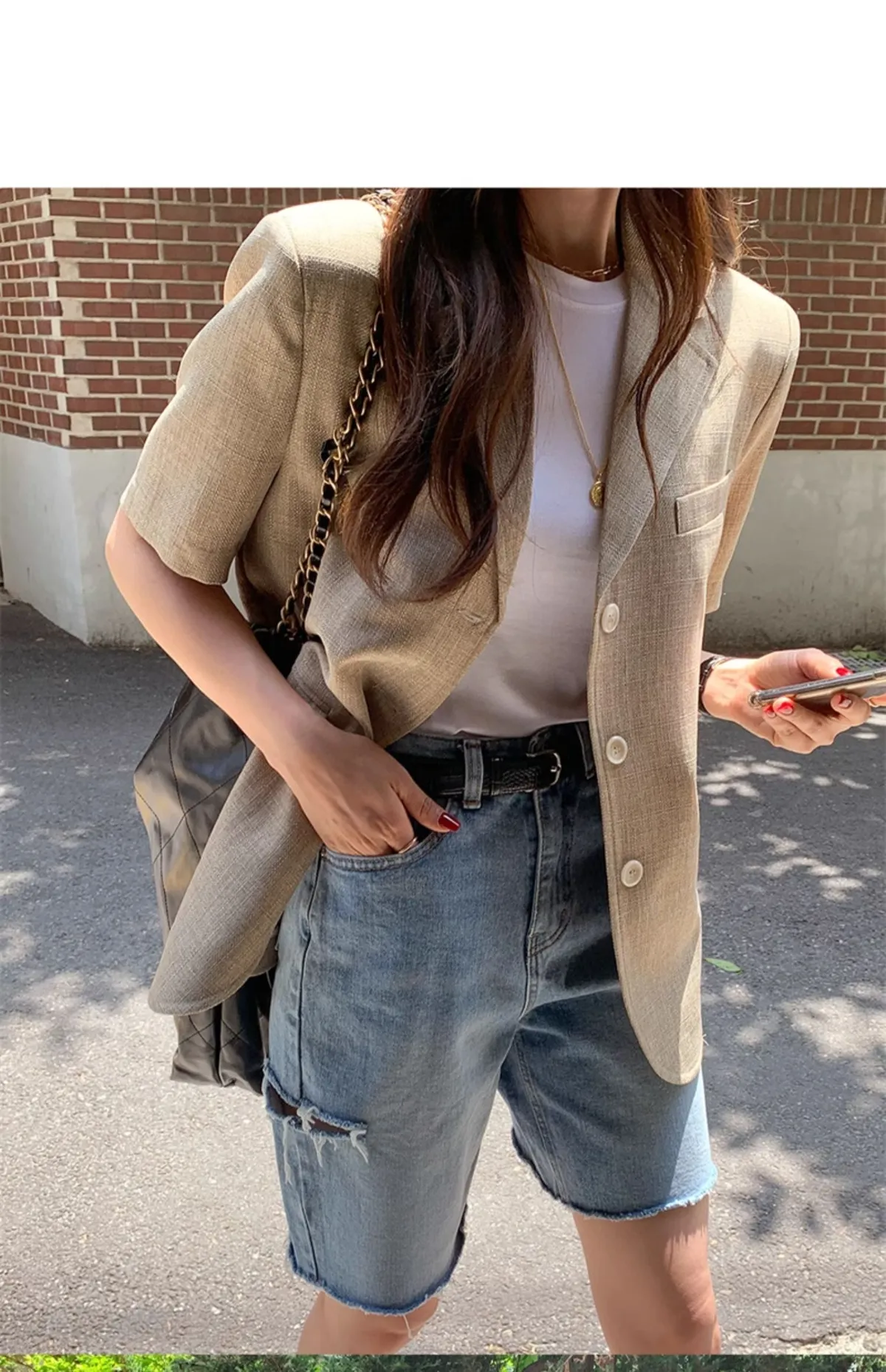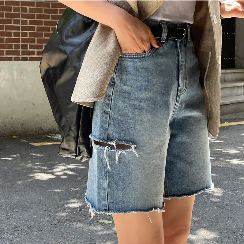 高腰顯瘦側邊破洞五分牛仔褲