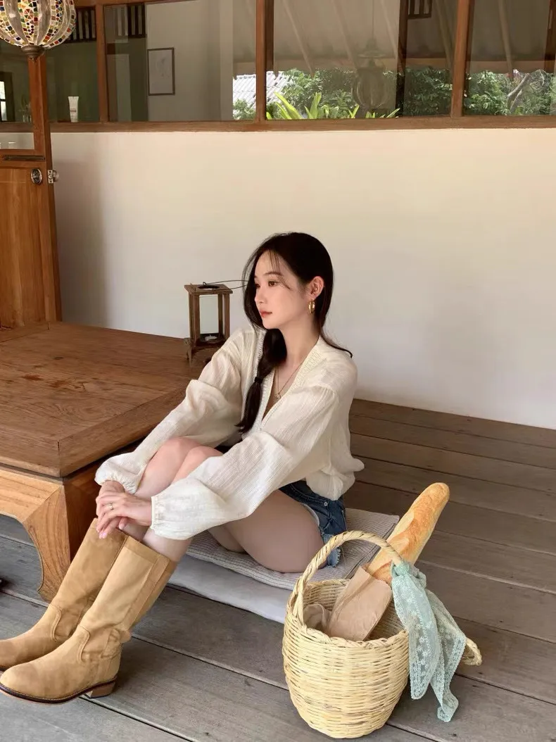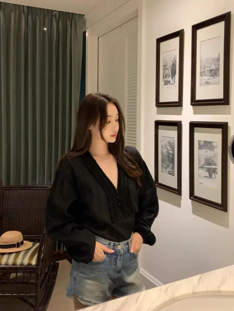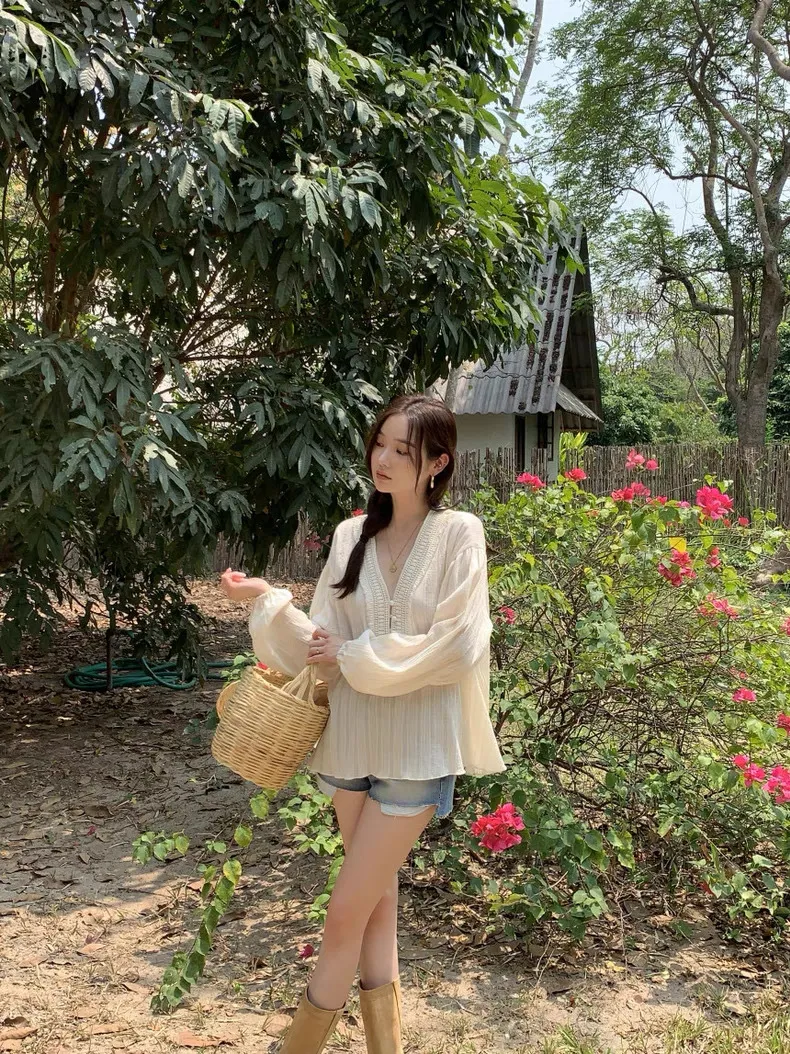 法式浪漫V領肌理紋布釦上衣