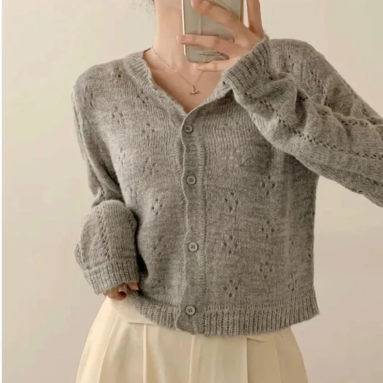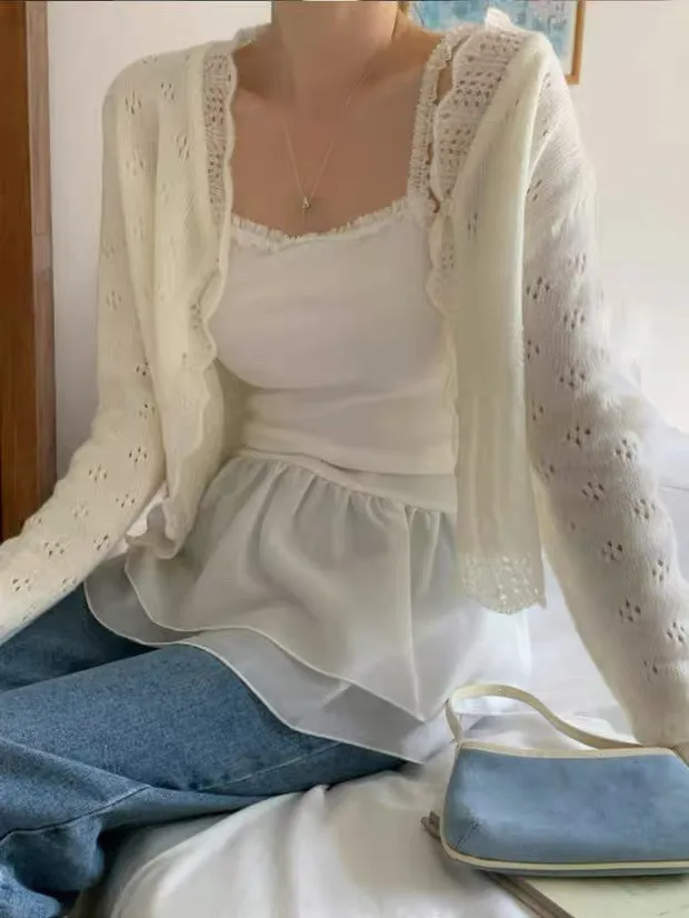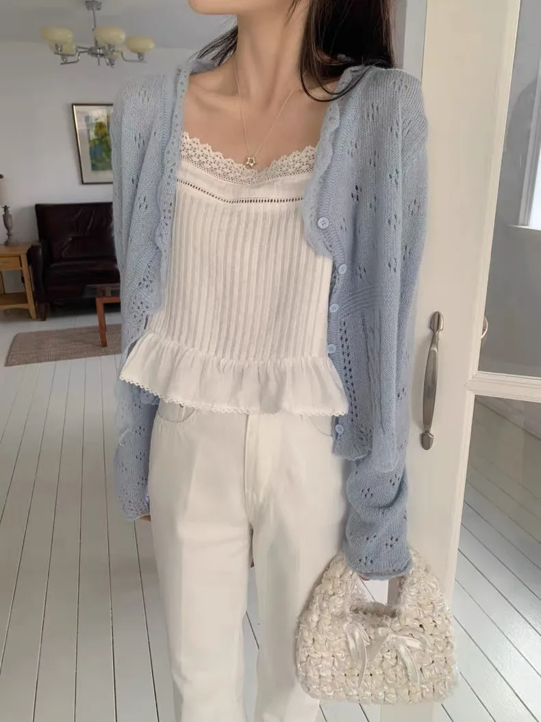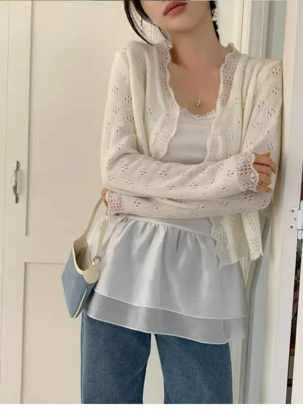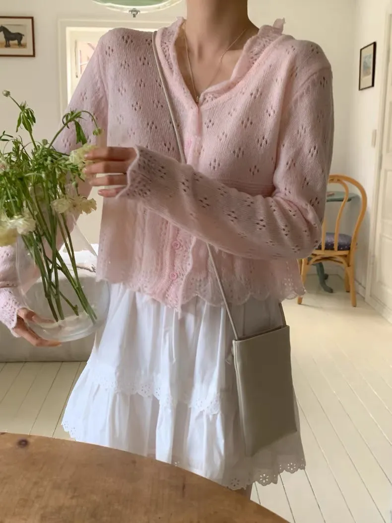 法式溫柔v領緹花鏤空軟糯針織開衫