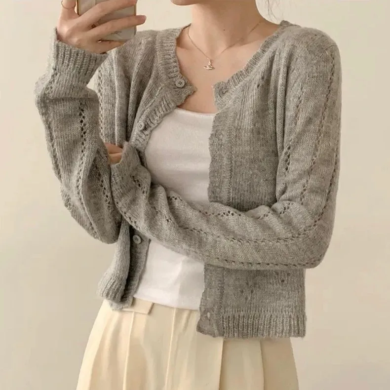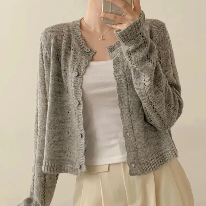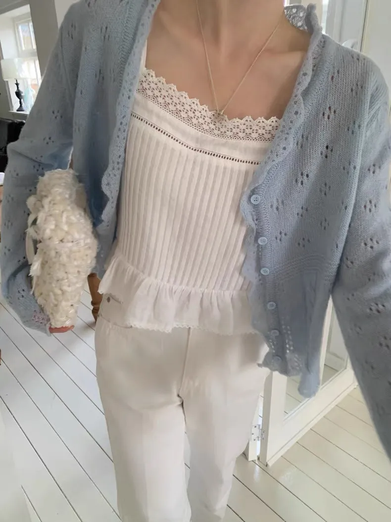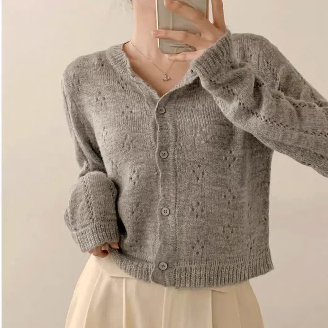 法式溫柔v領緹花鏤空軟糯針織開衫