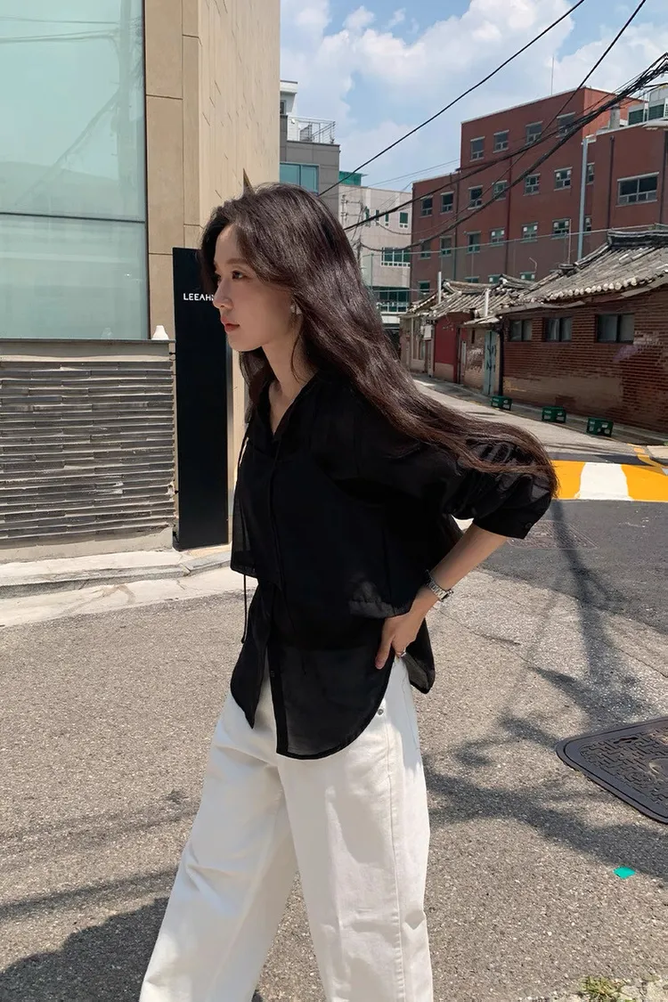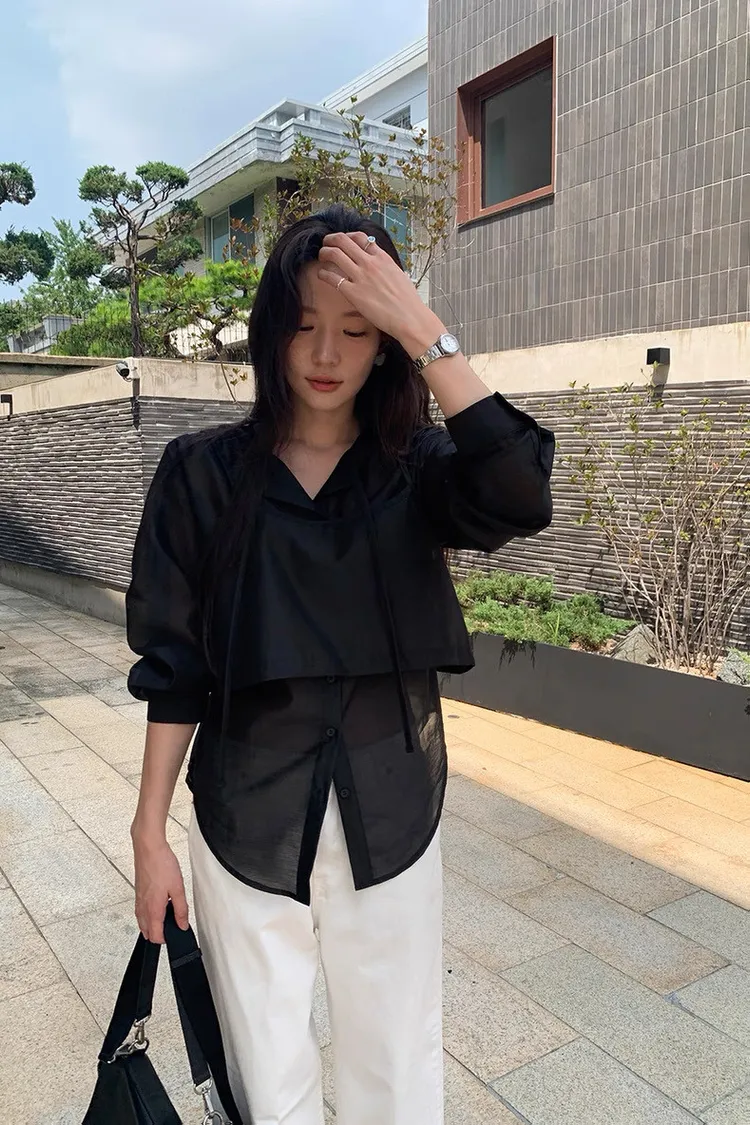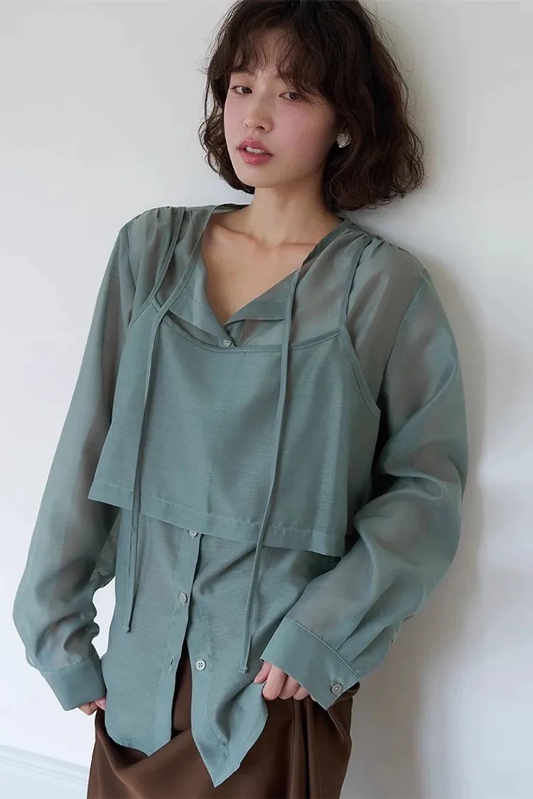 復古寬鬆雪紡透膚襯衫+疊穿小背心兩件套
