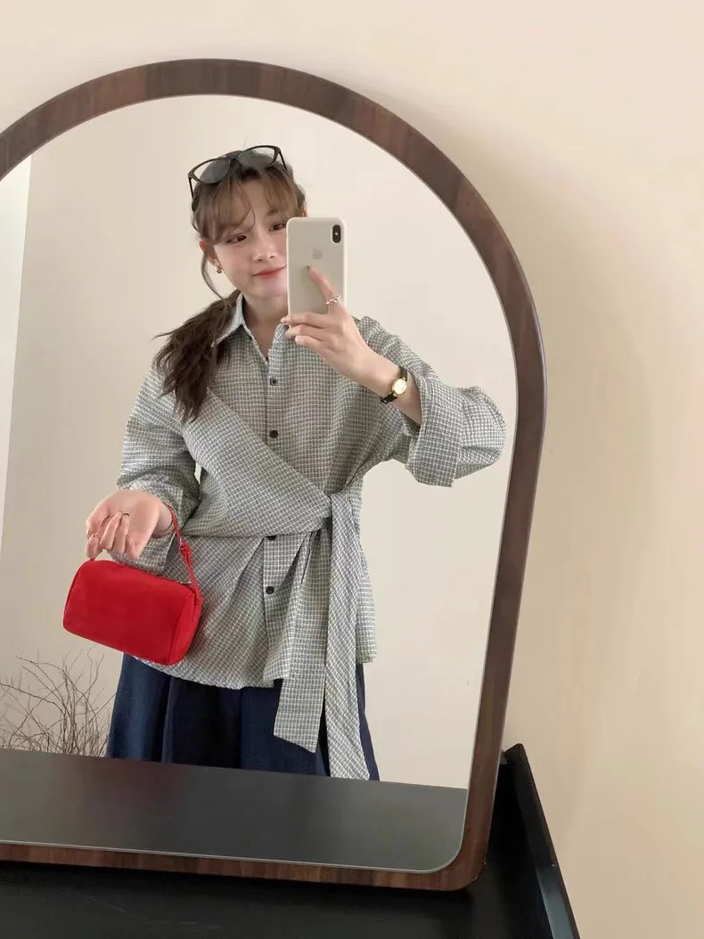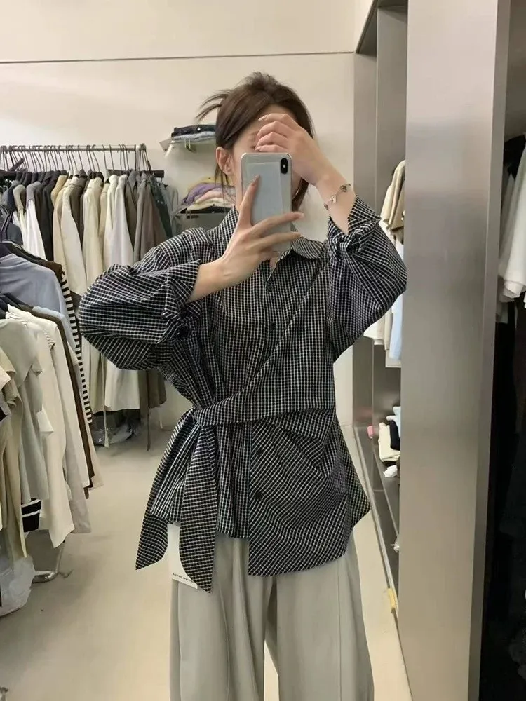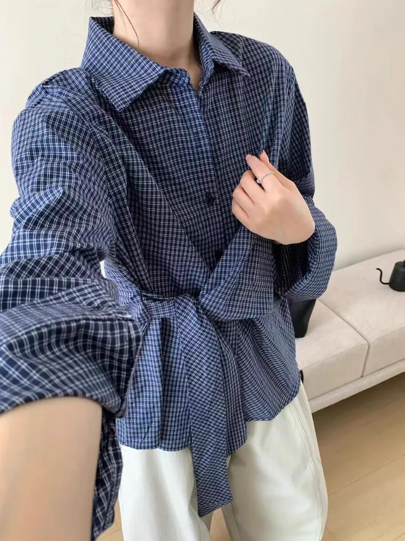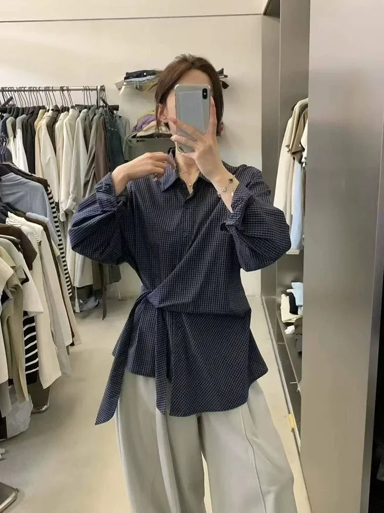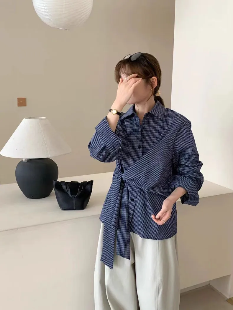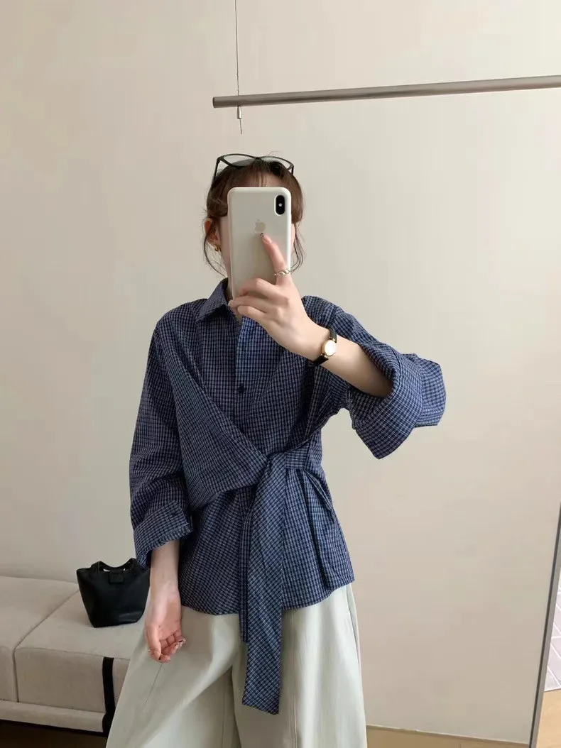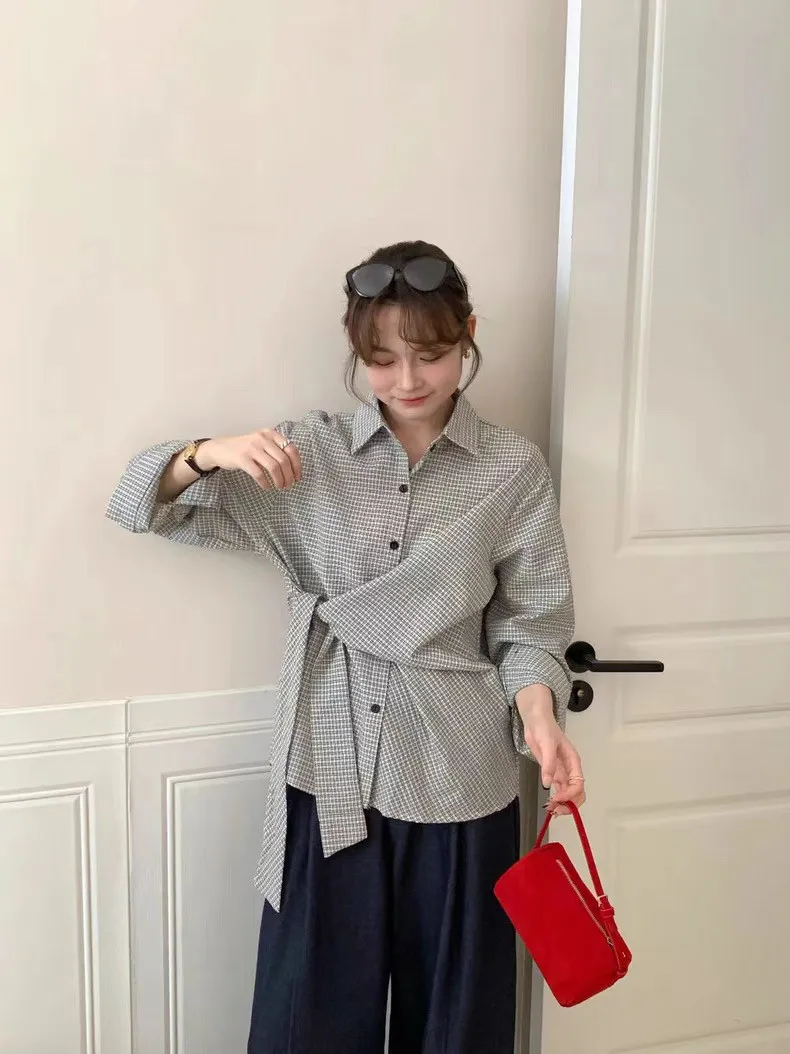 復古小眾不規則綁帶收腰長袖格紋襯衫