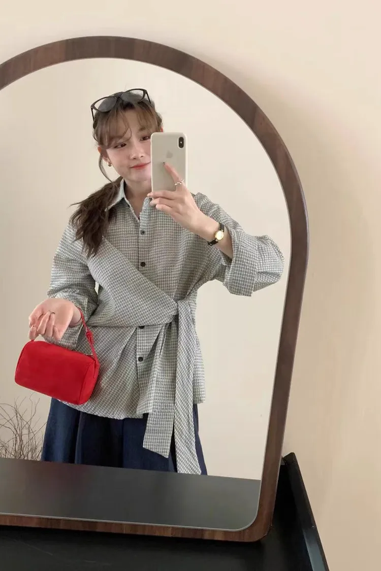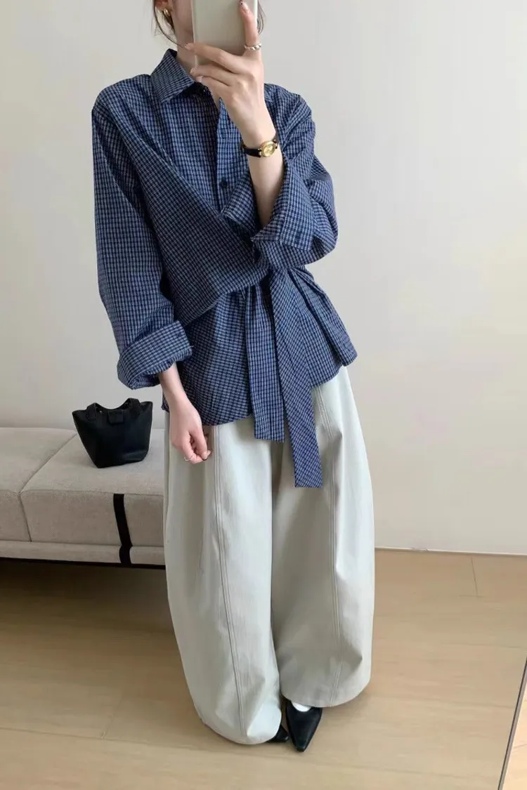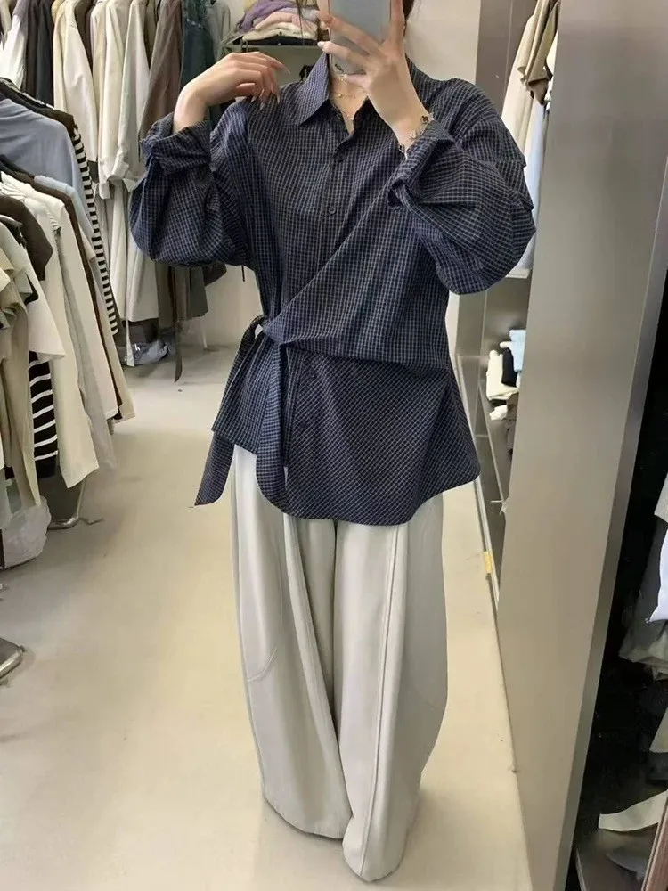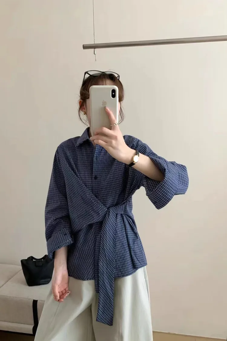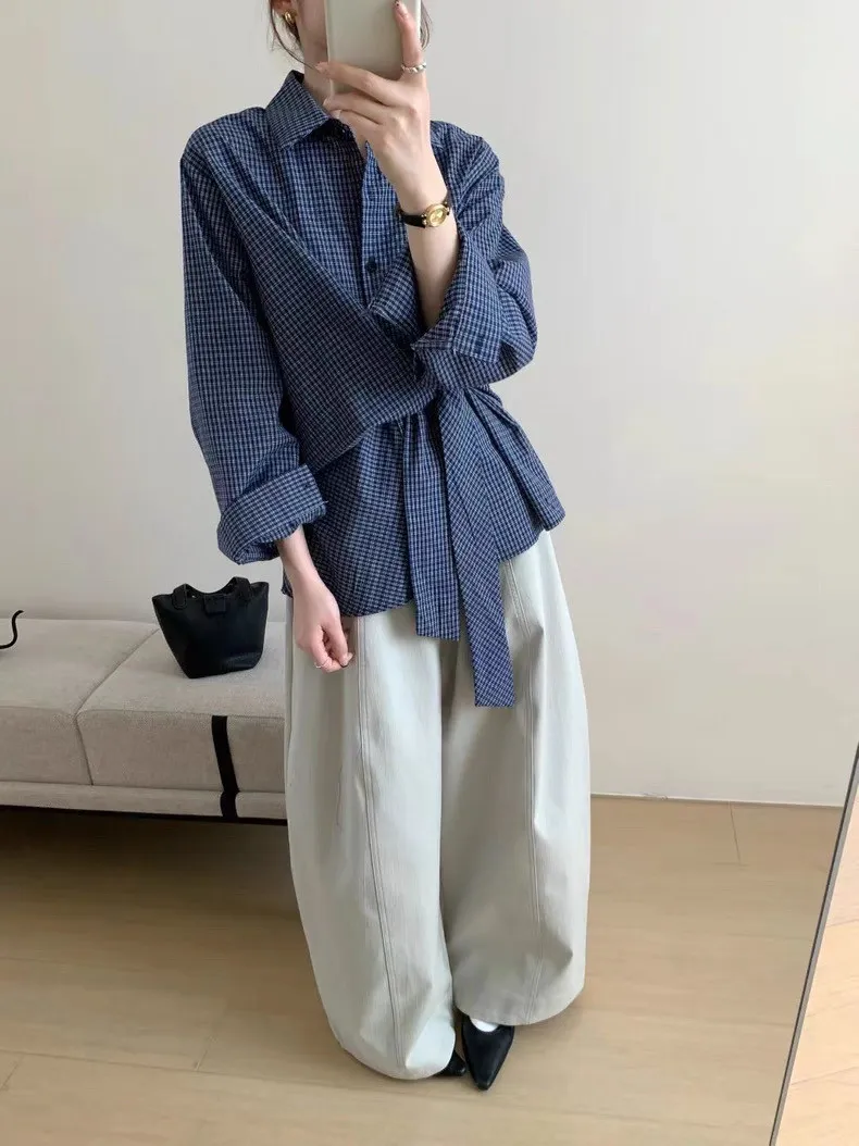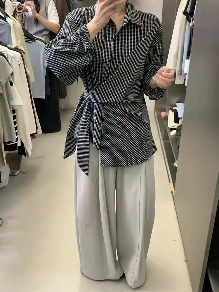 復古小眾不規則綁帶收腰長袖格紋襯衫