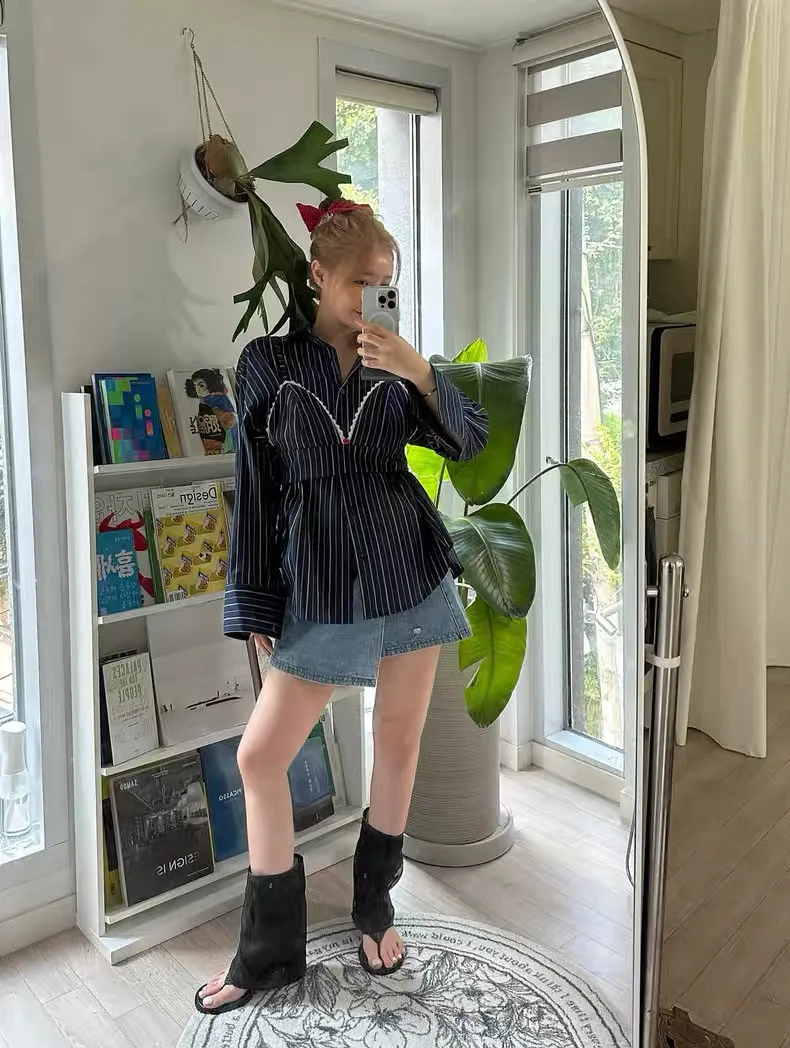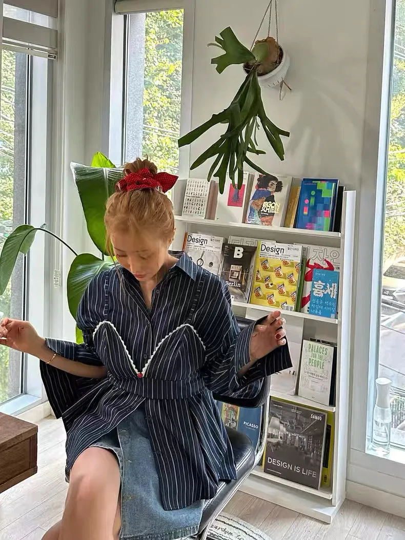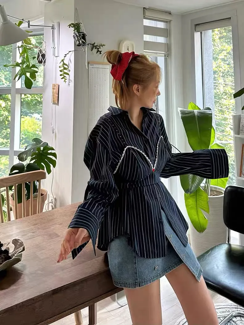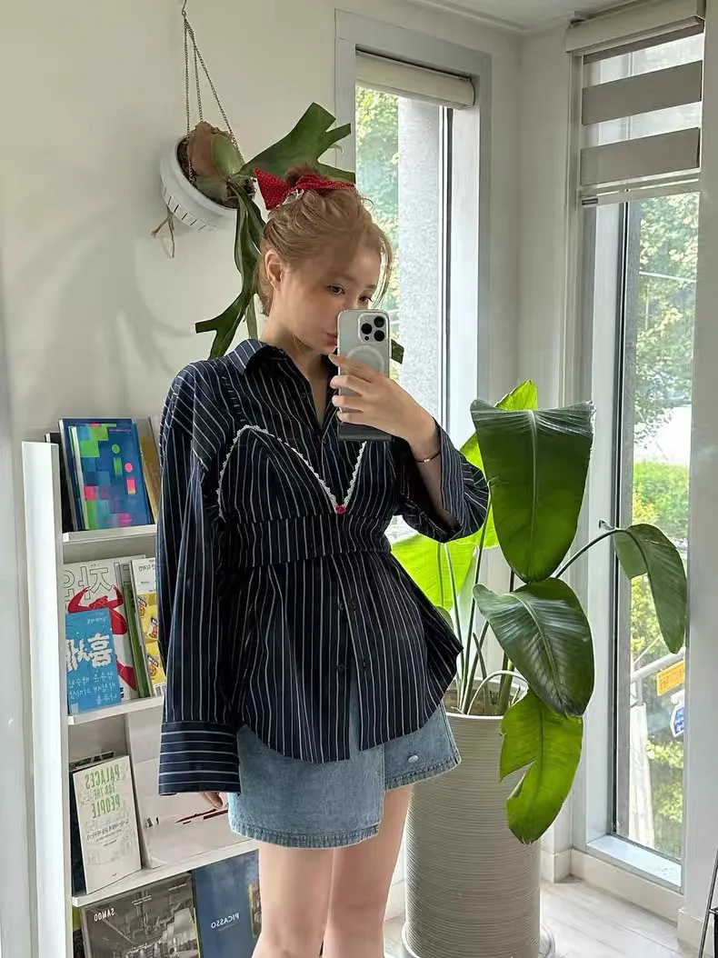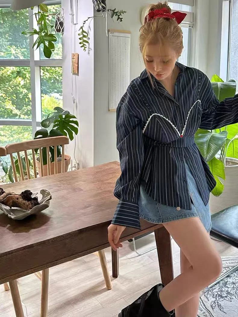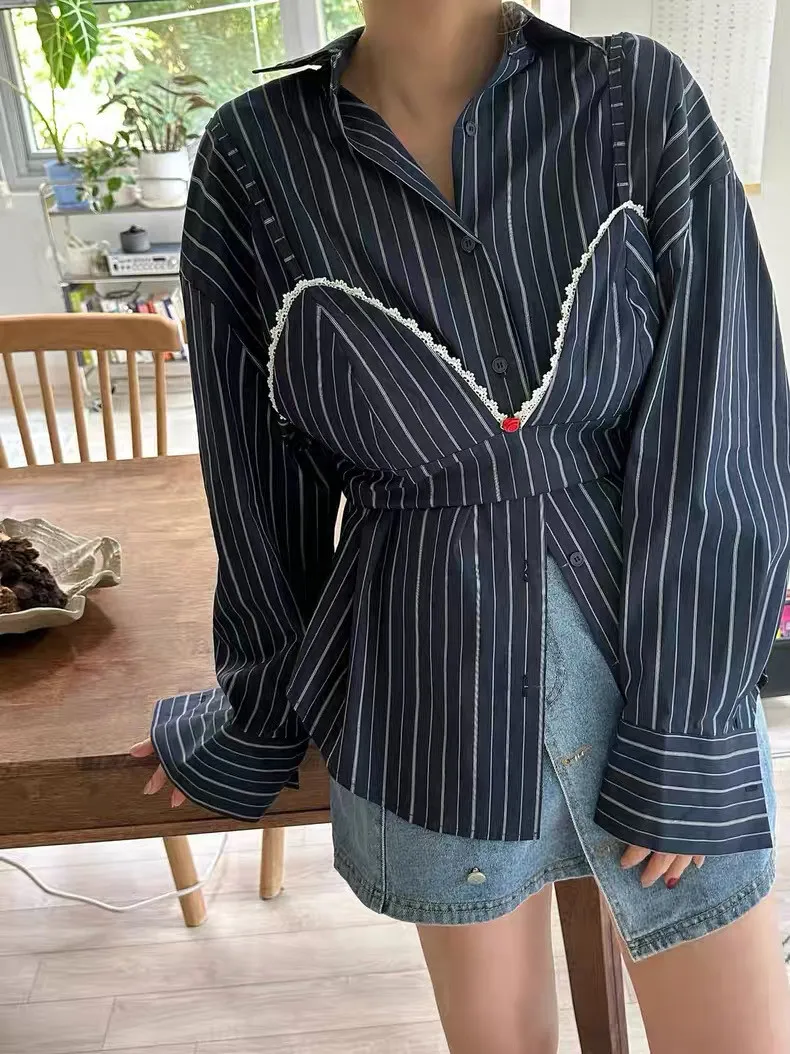 復古設計蕾絲滾邊條紋長袖襯衫兩件套