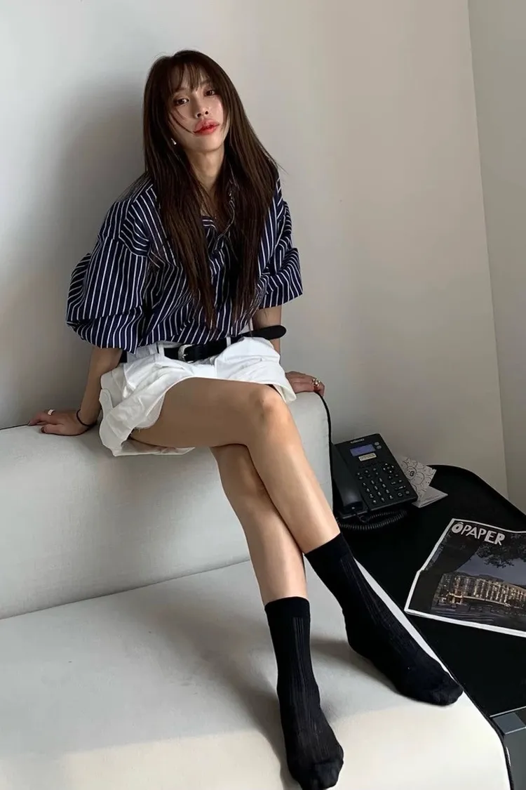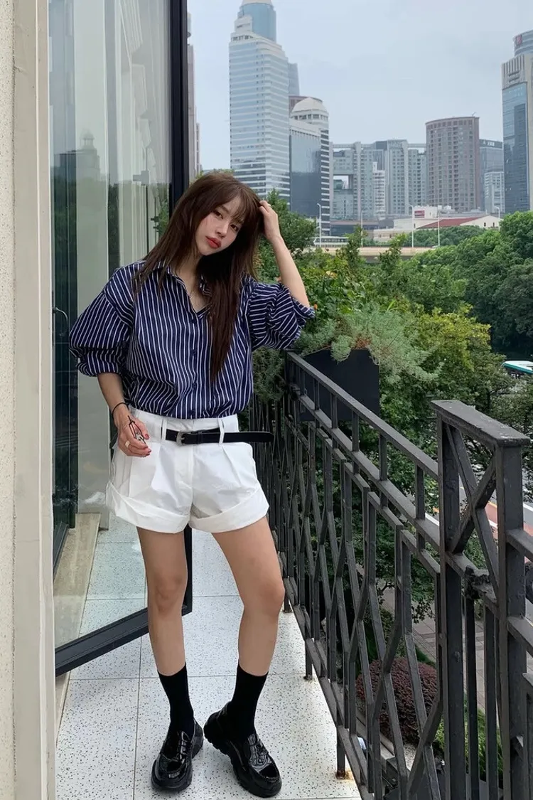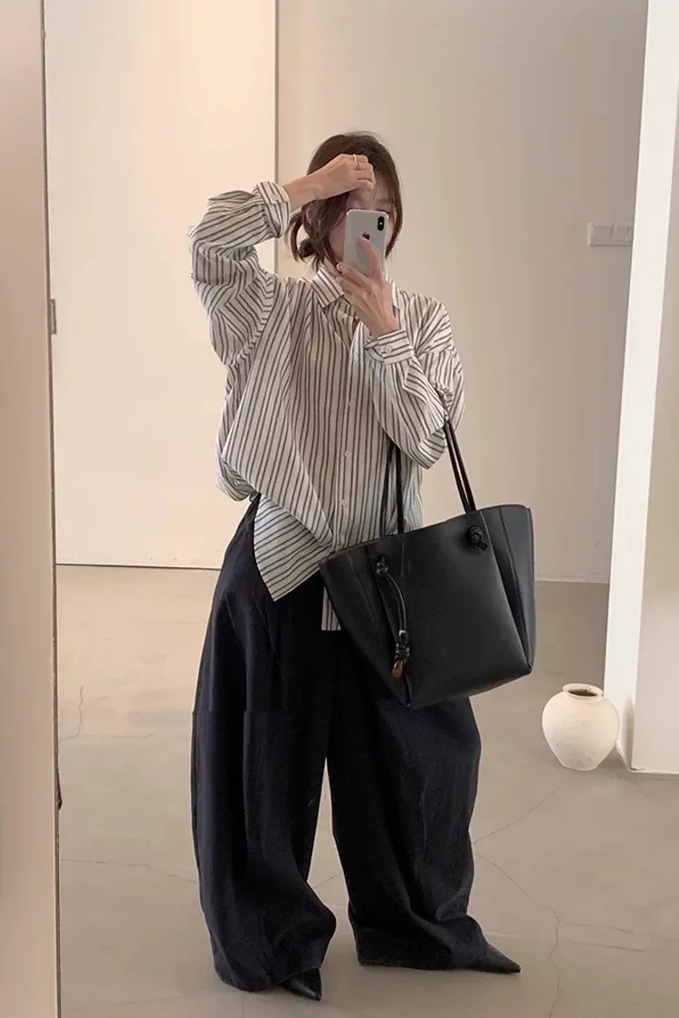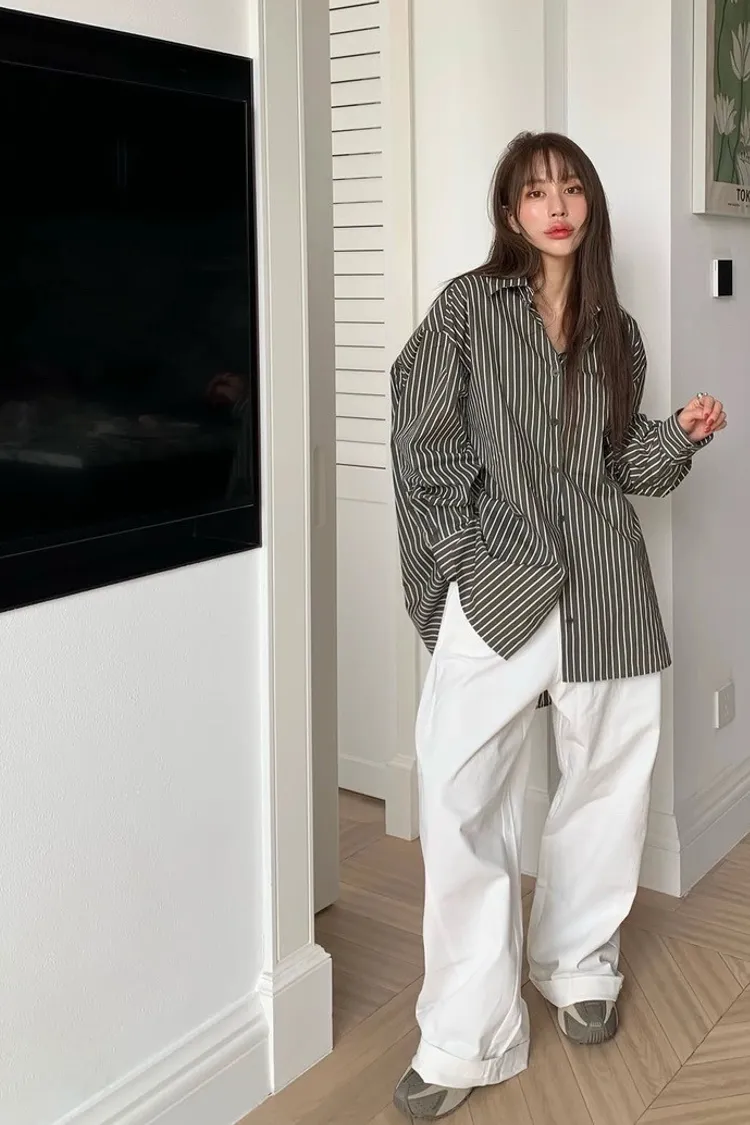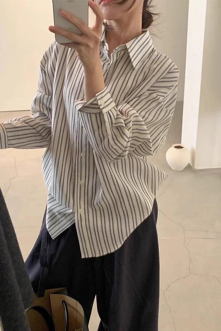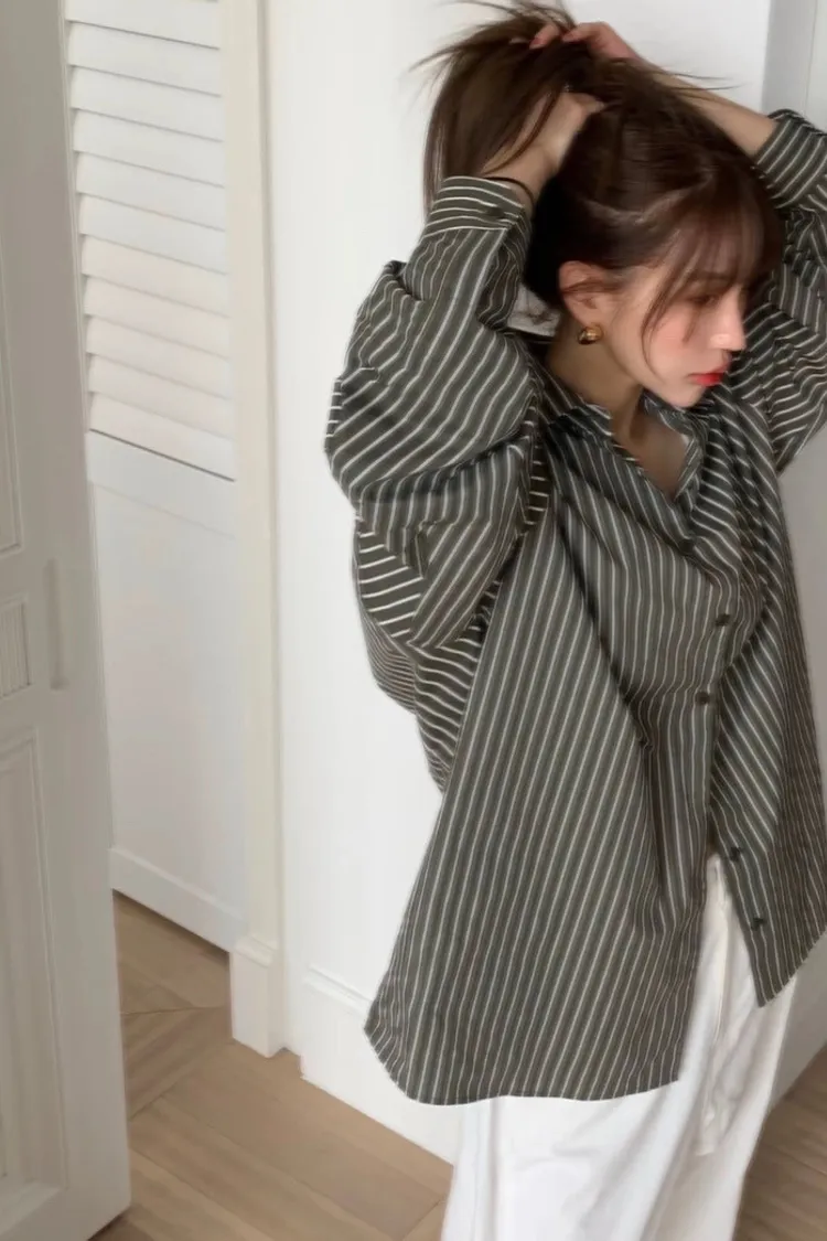 滿滿法式慵懶寬鬆條紋長袖襯衫