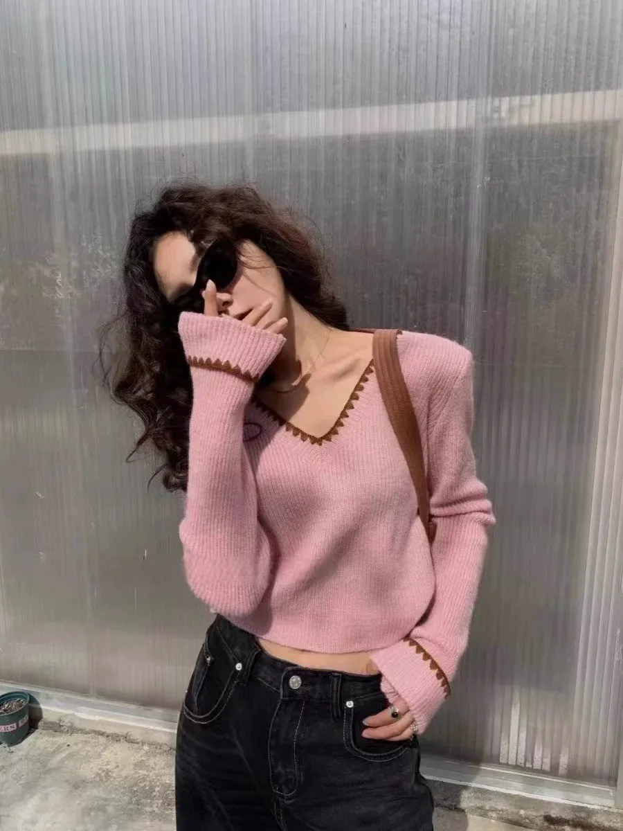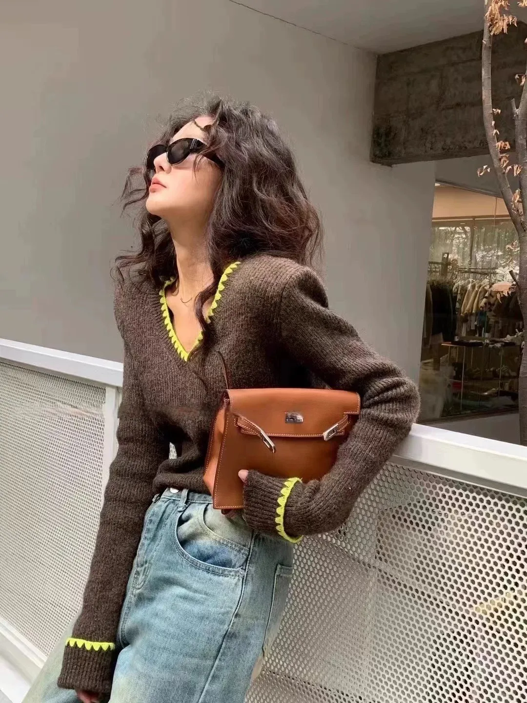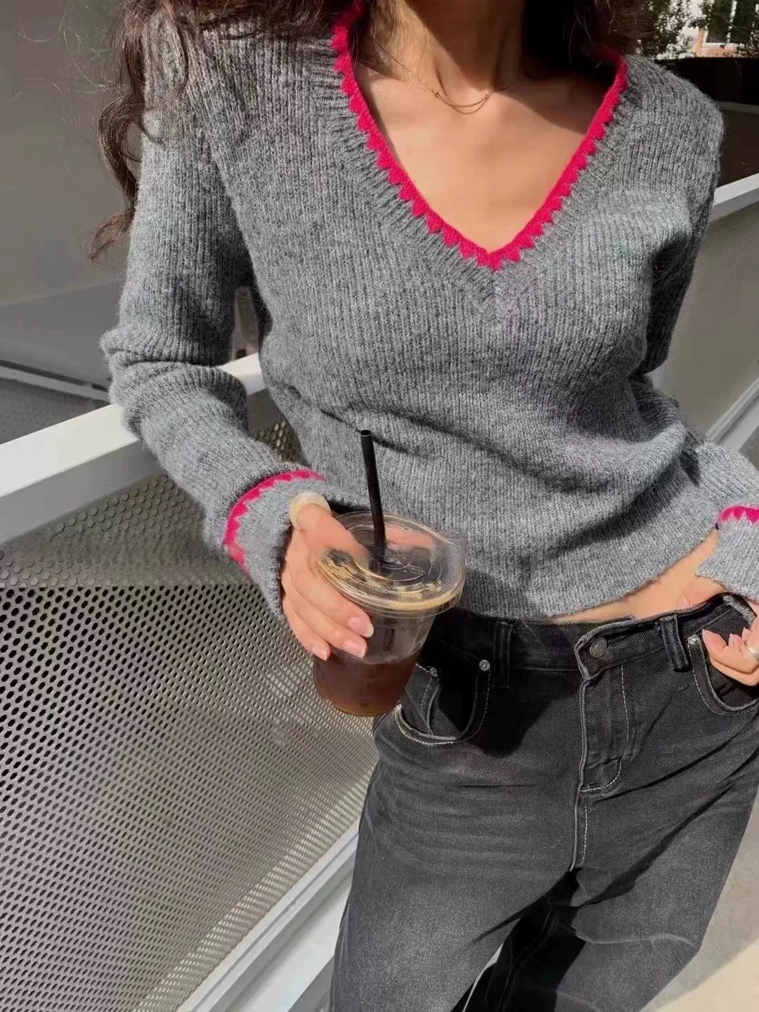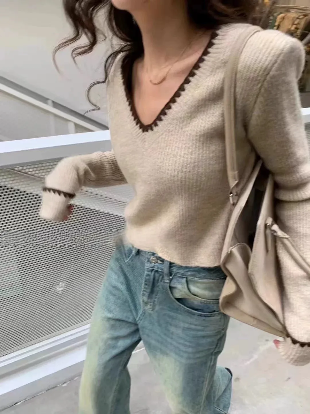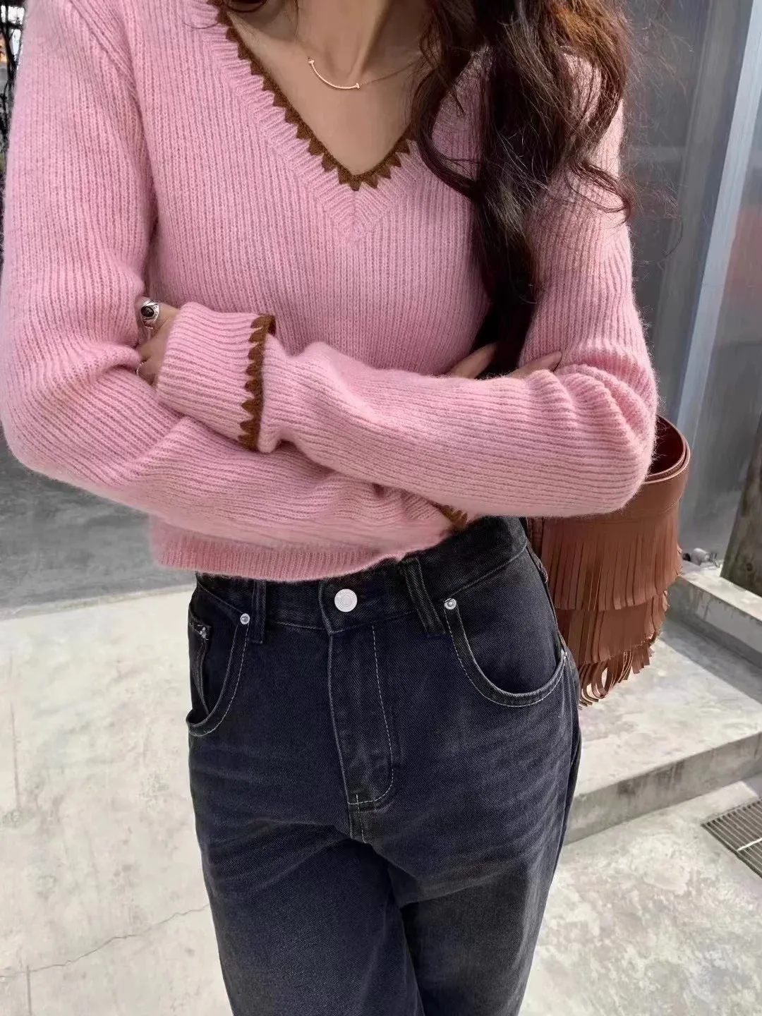 美拉德撞色v領設計感滾邊軟糯針織衫