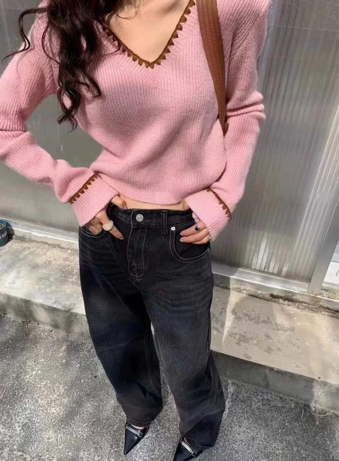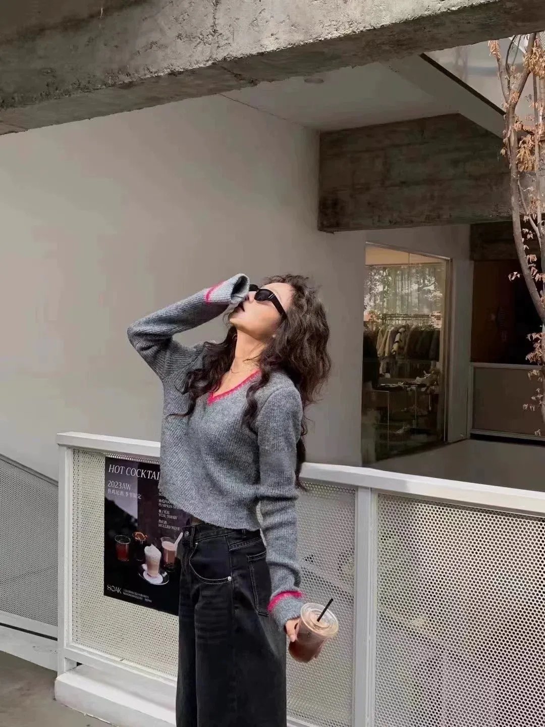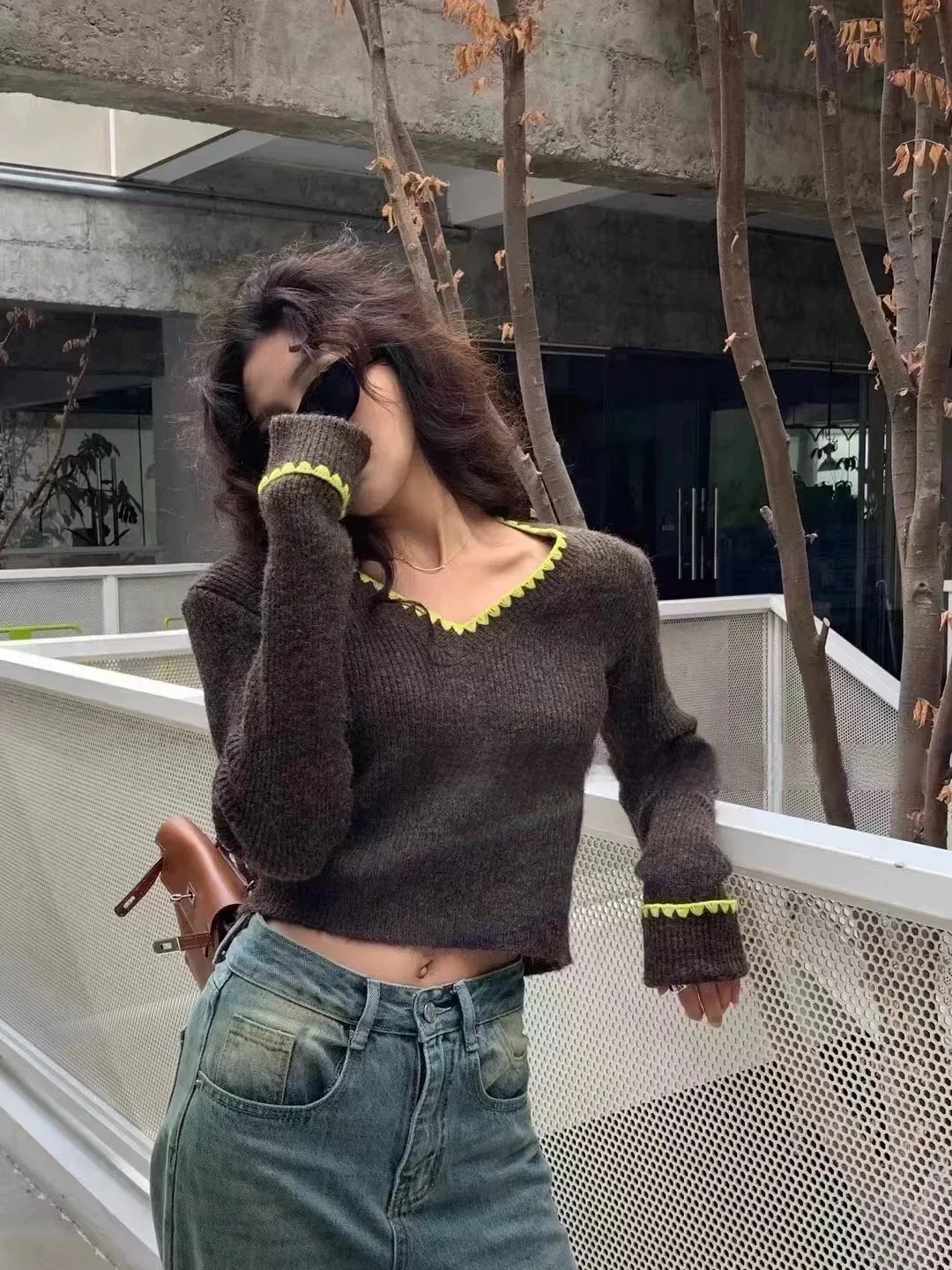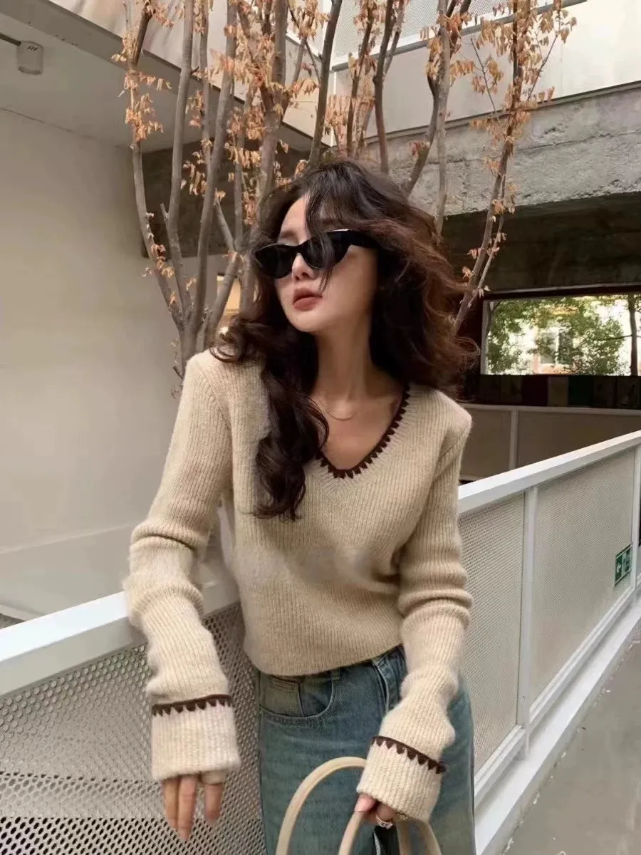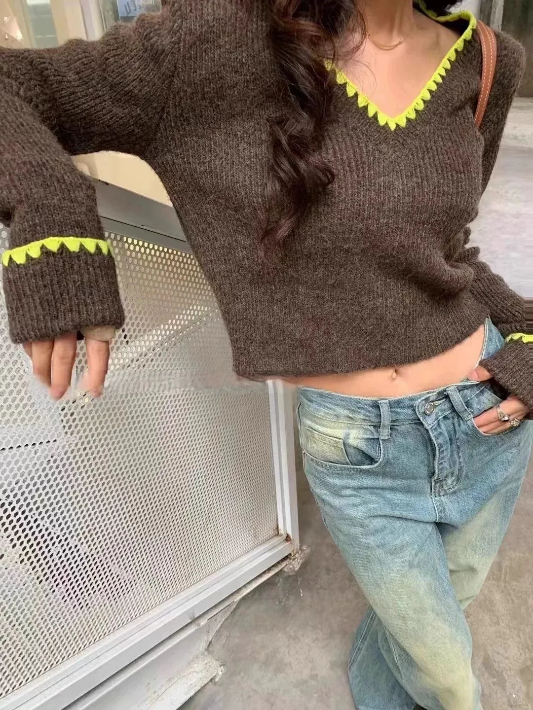 美拉德撞色v領設計感滾邊軟糯針織衫