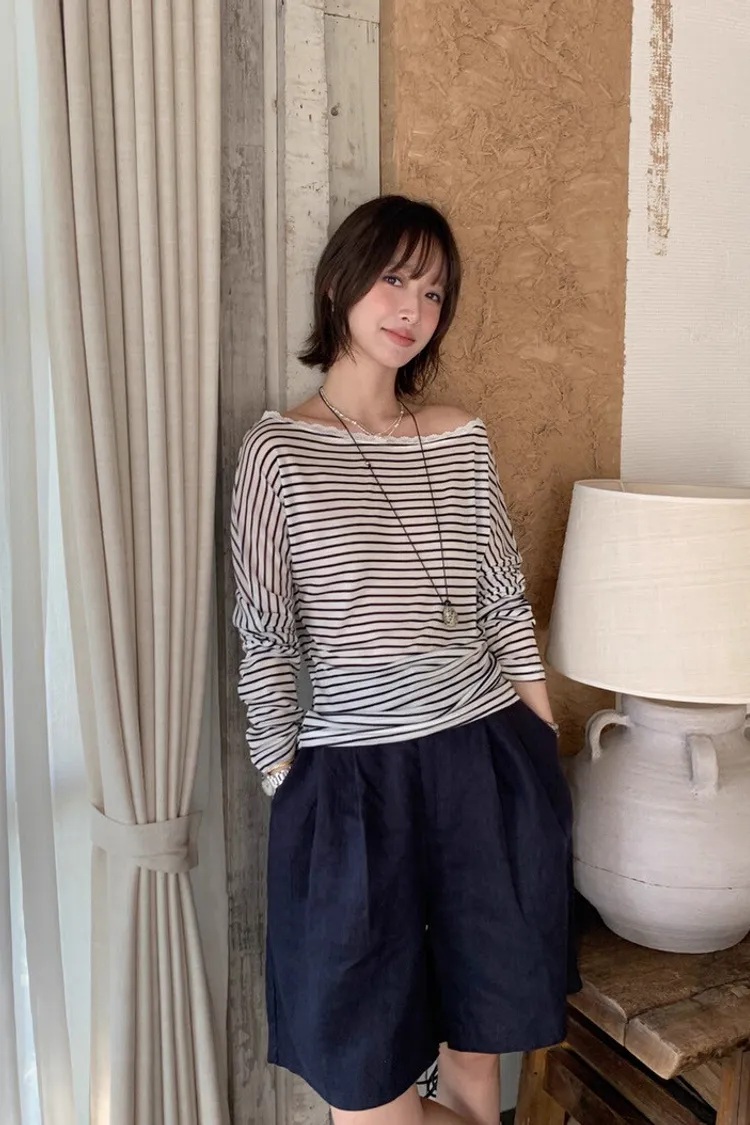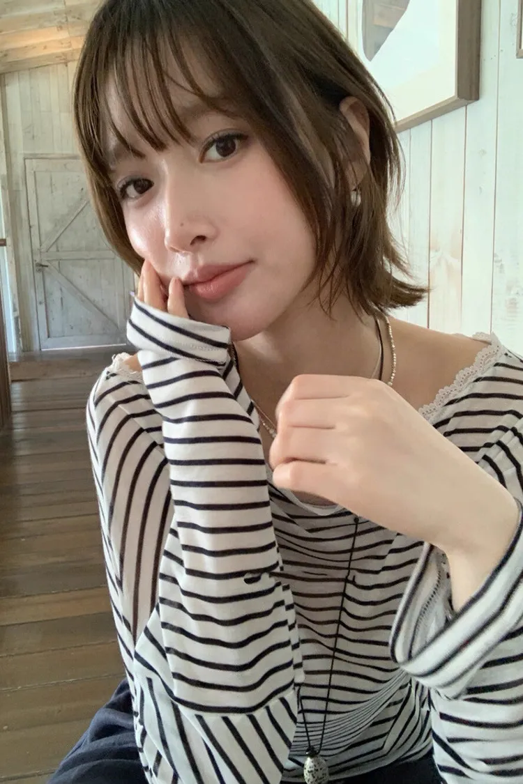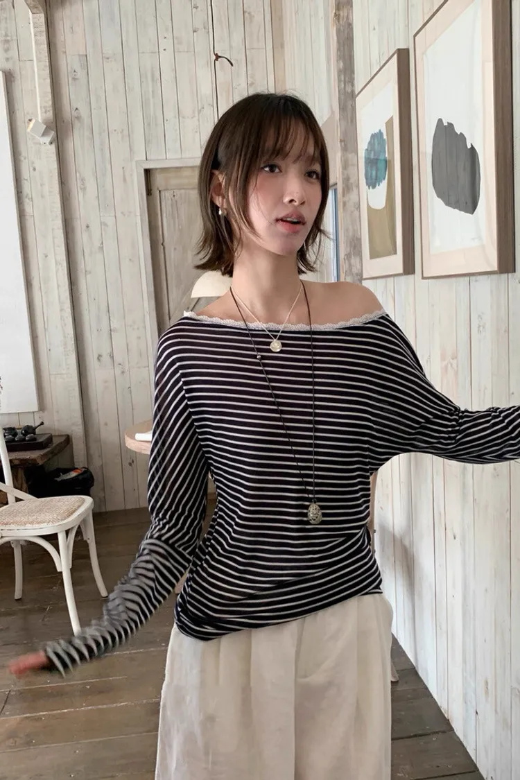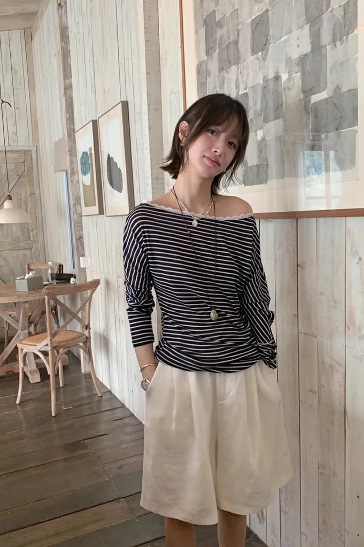 日系風格減齡滾邊蕾絲條紋斜肩tee