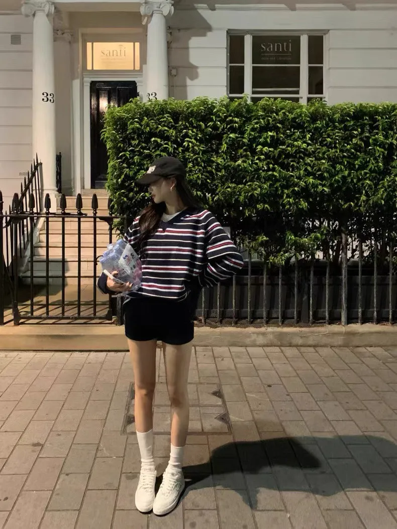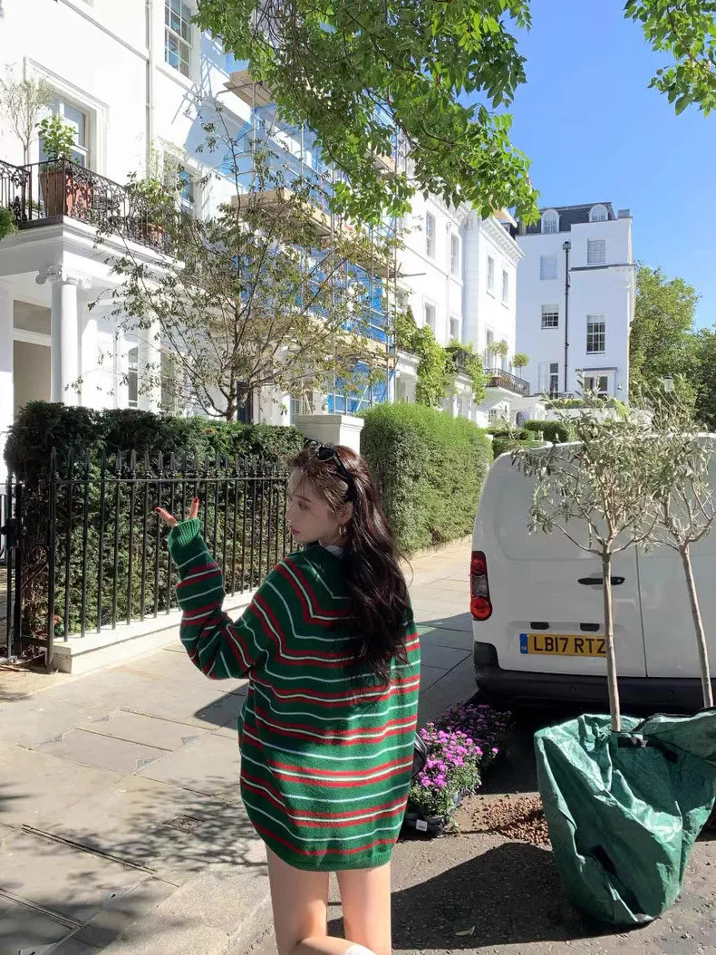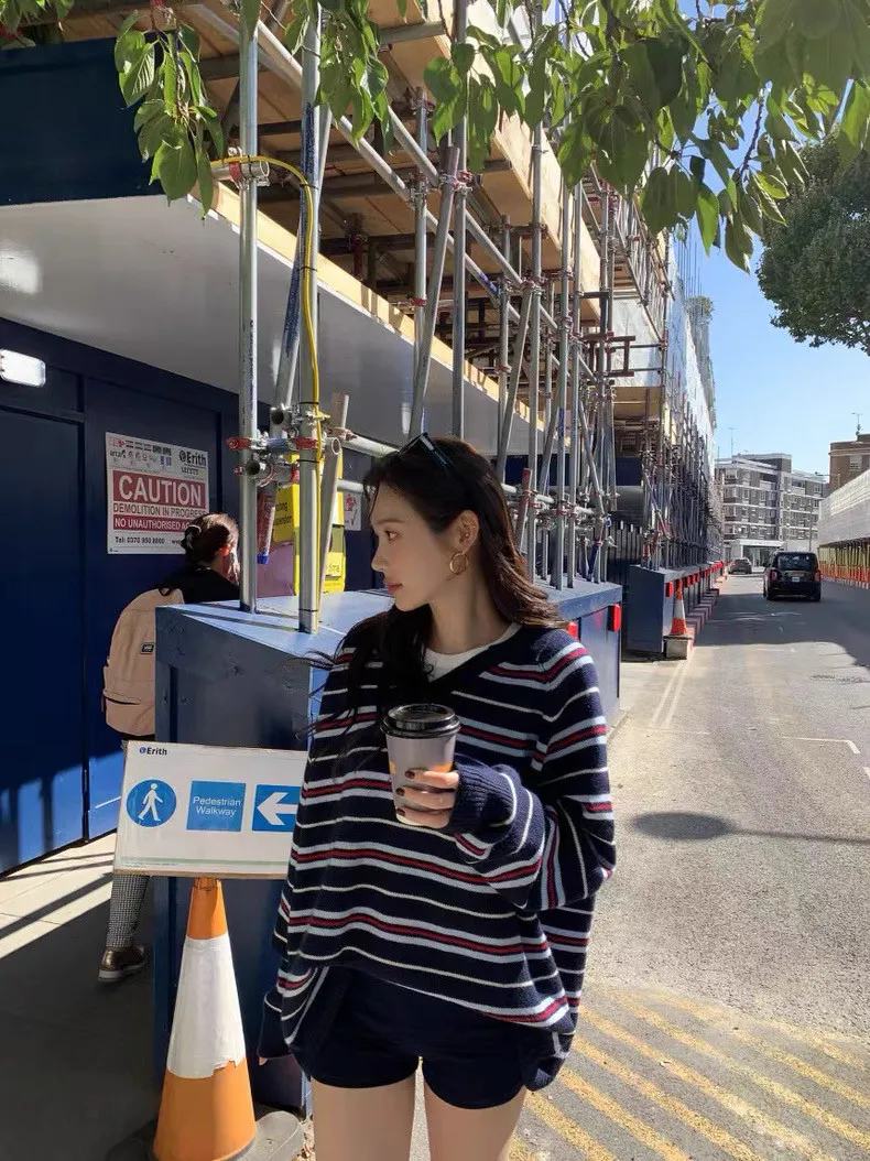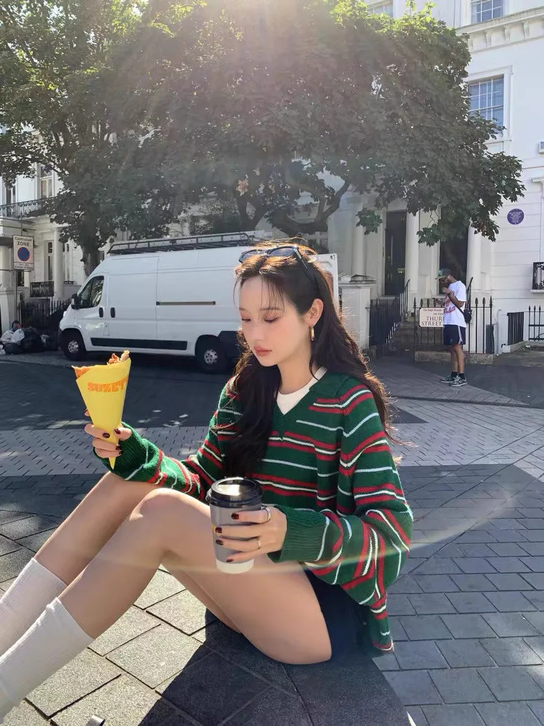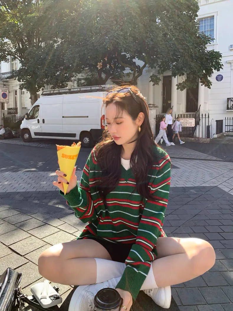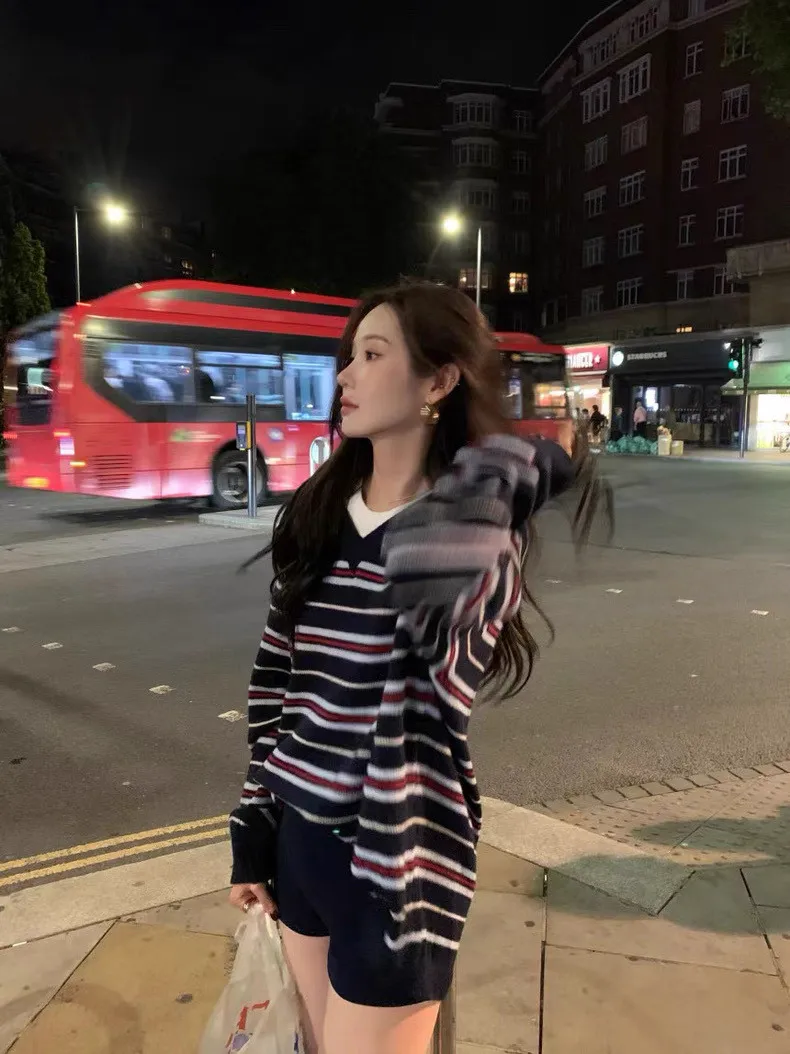 韓國復古小眾v領條紋軟糯針織衫