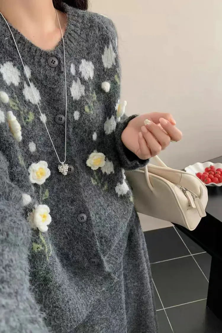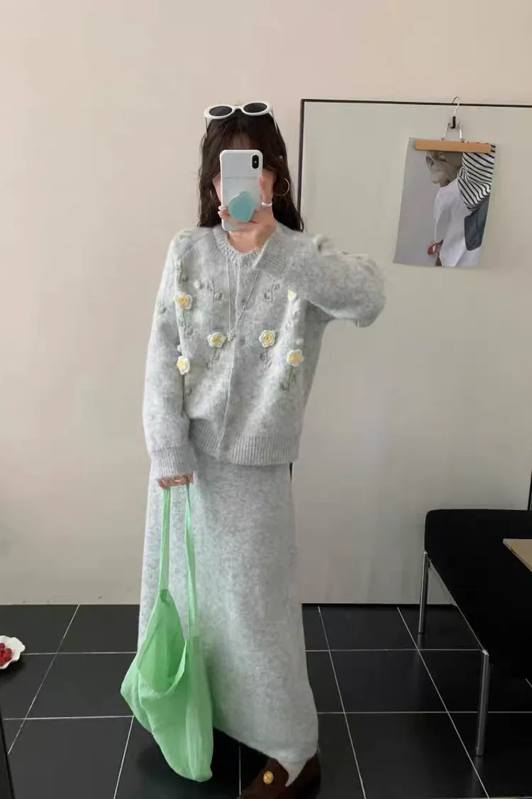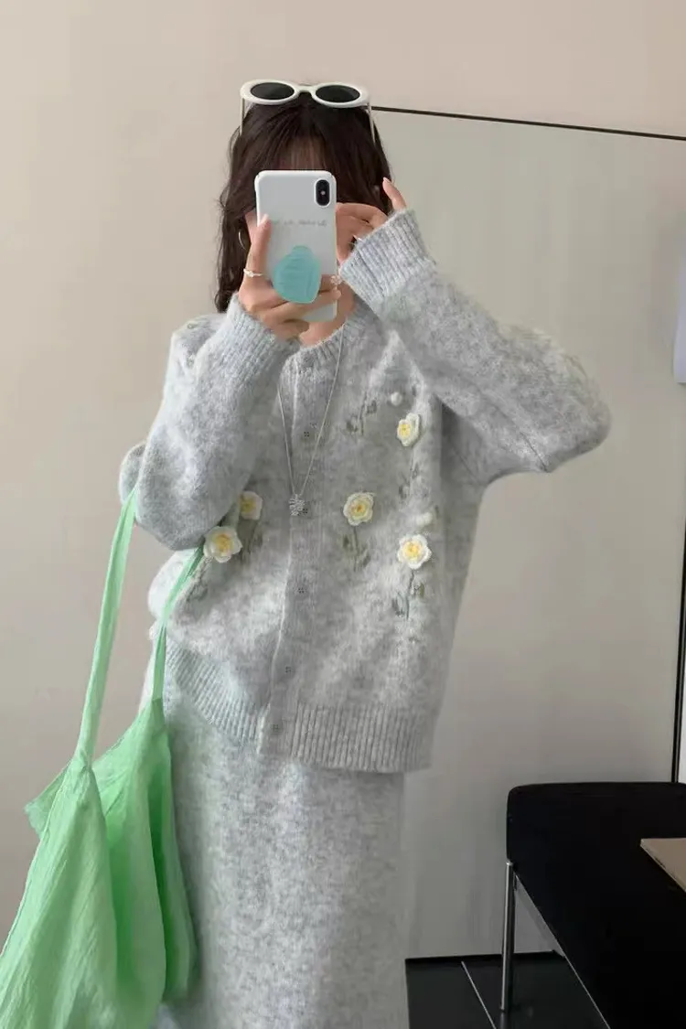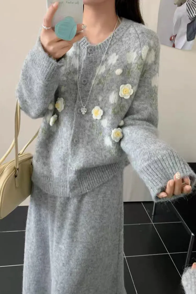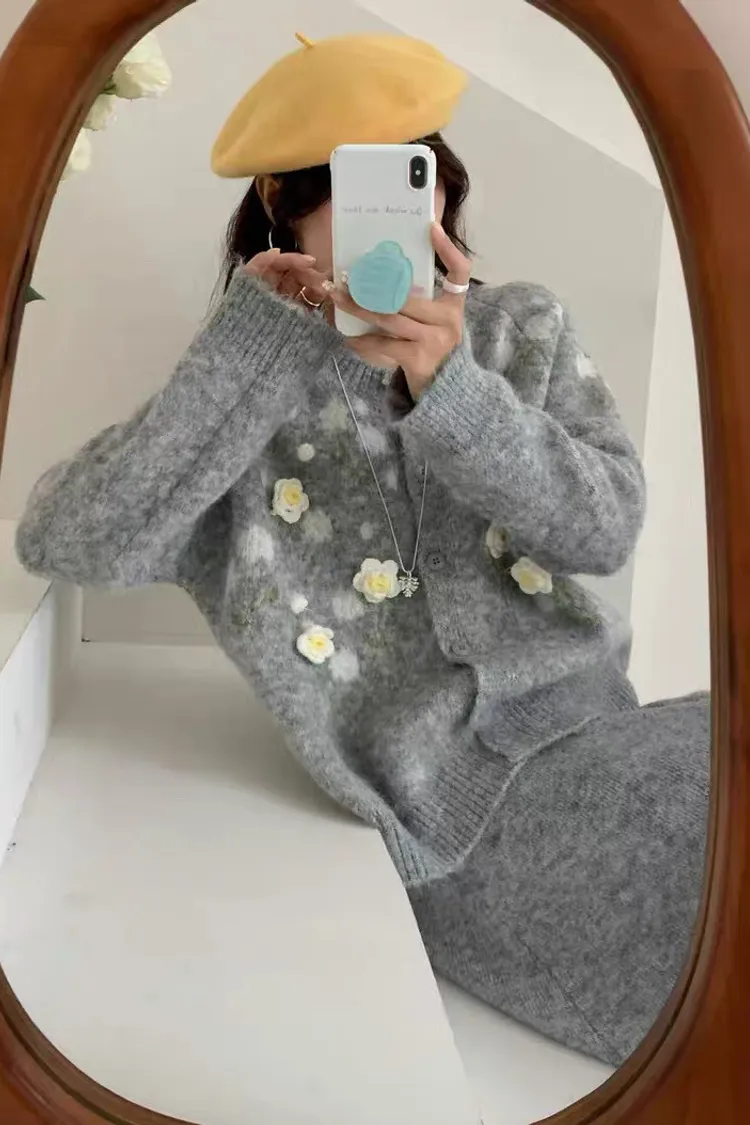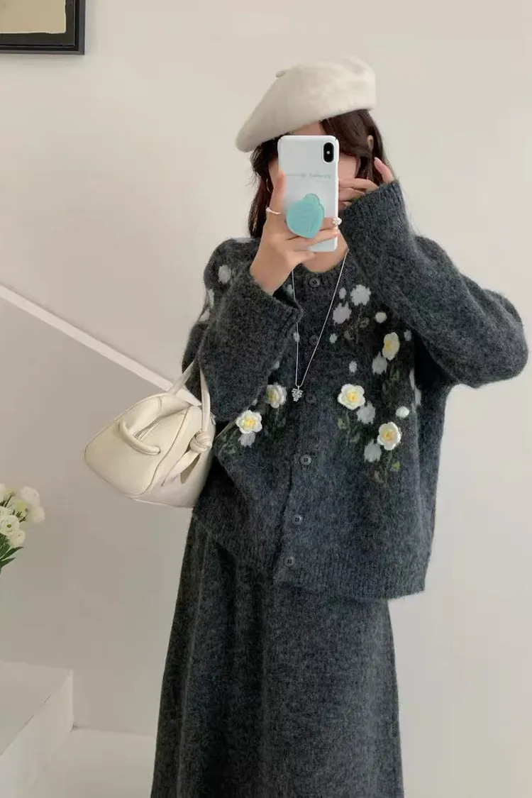 秋天最溫柔立體刺繡花朵針織毛衣套裝