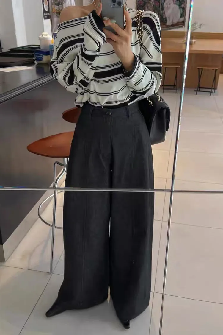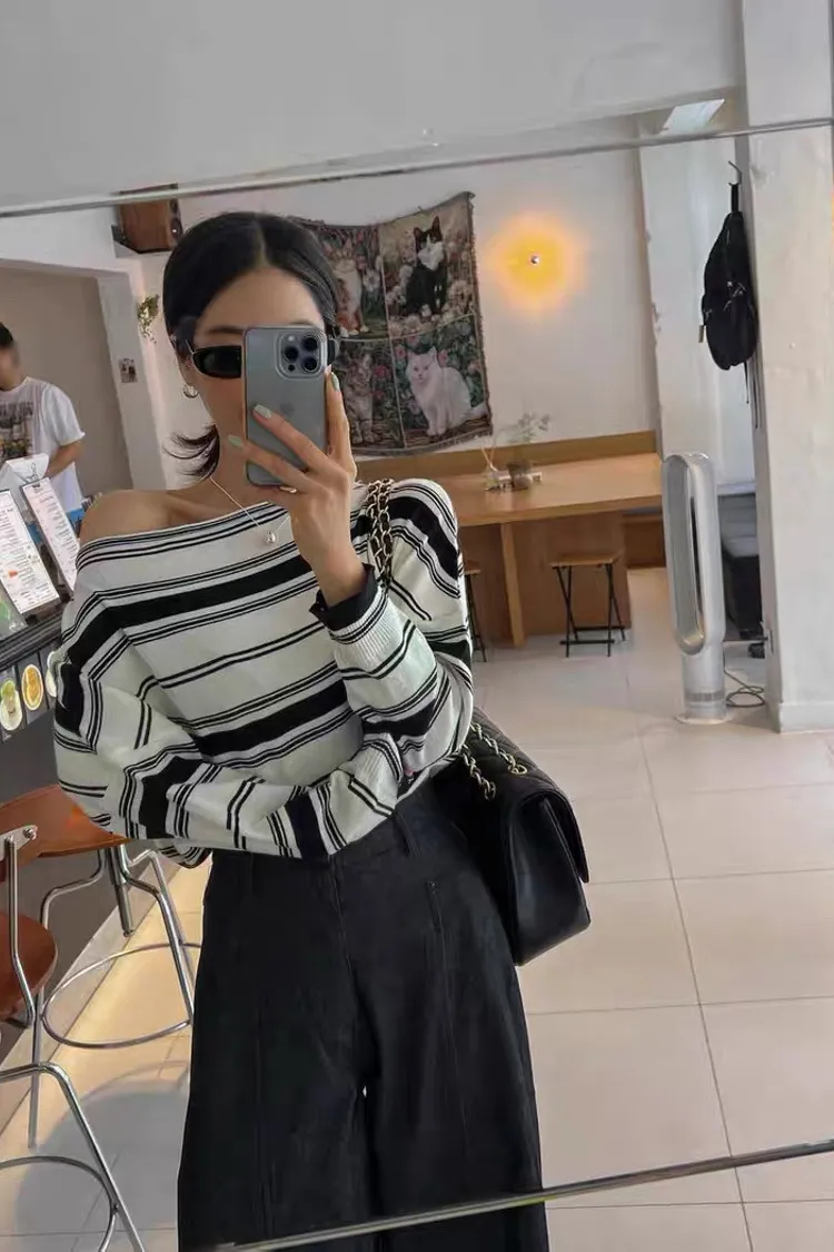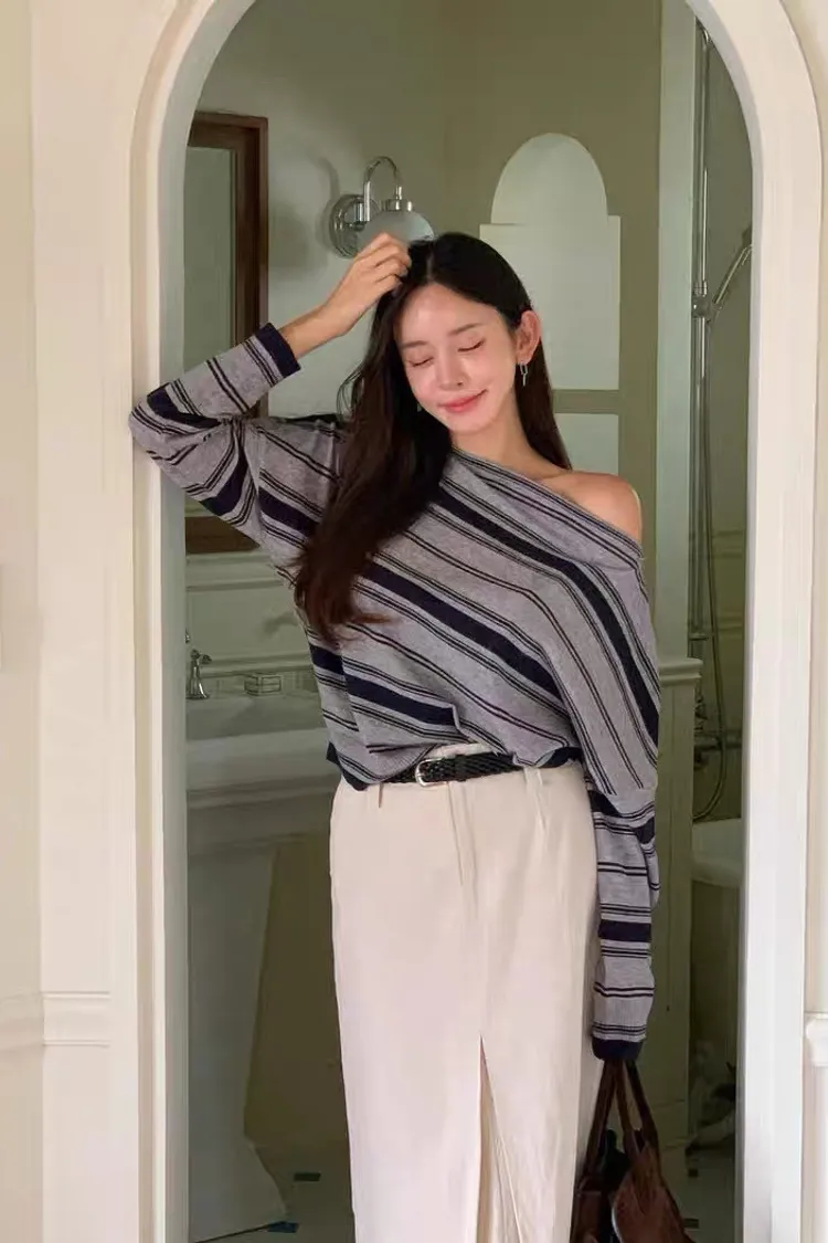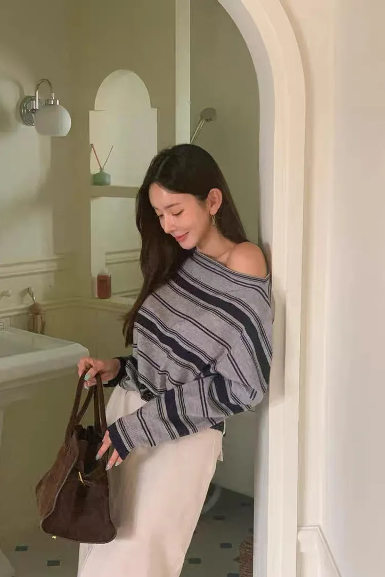 秋天復古條紋設計感一字領薄針織衫