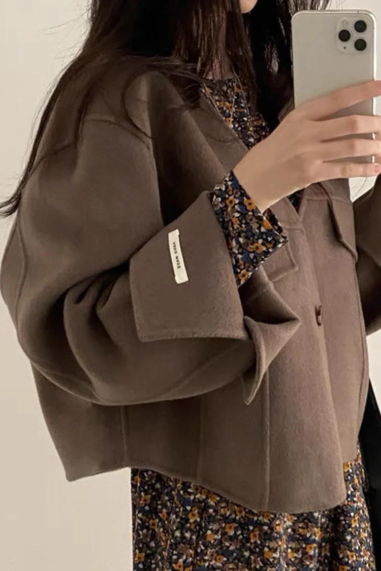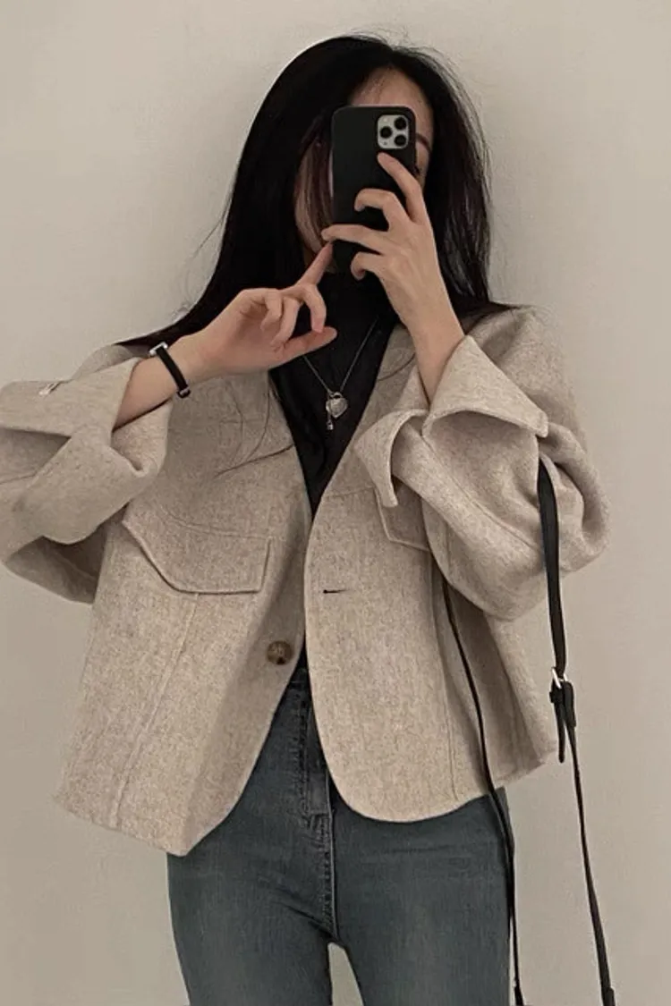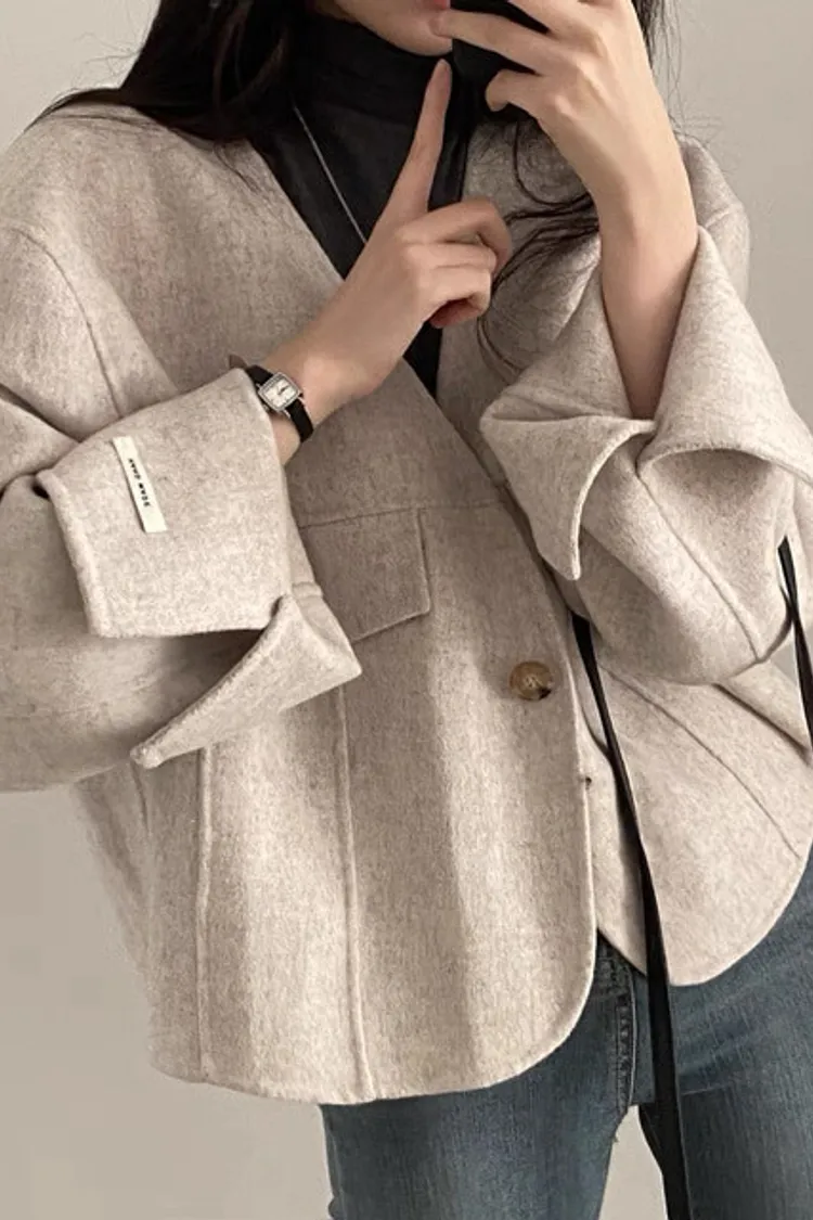 法式氣質大v領單釦毛呢短版外套
