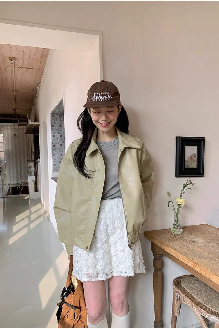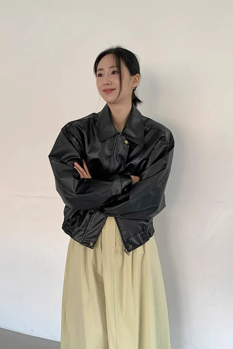 率性翻領寬鬆休閒PU皮衣夾克外套