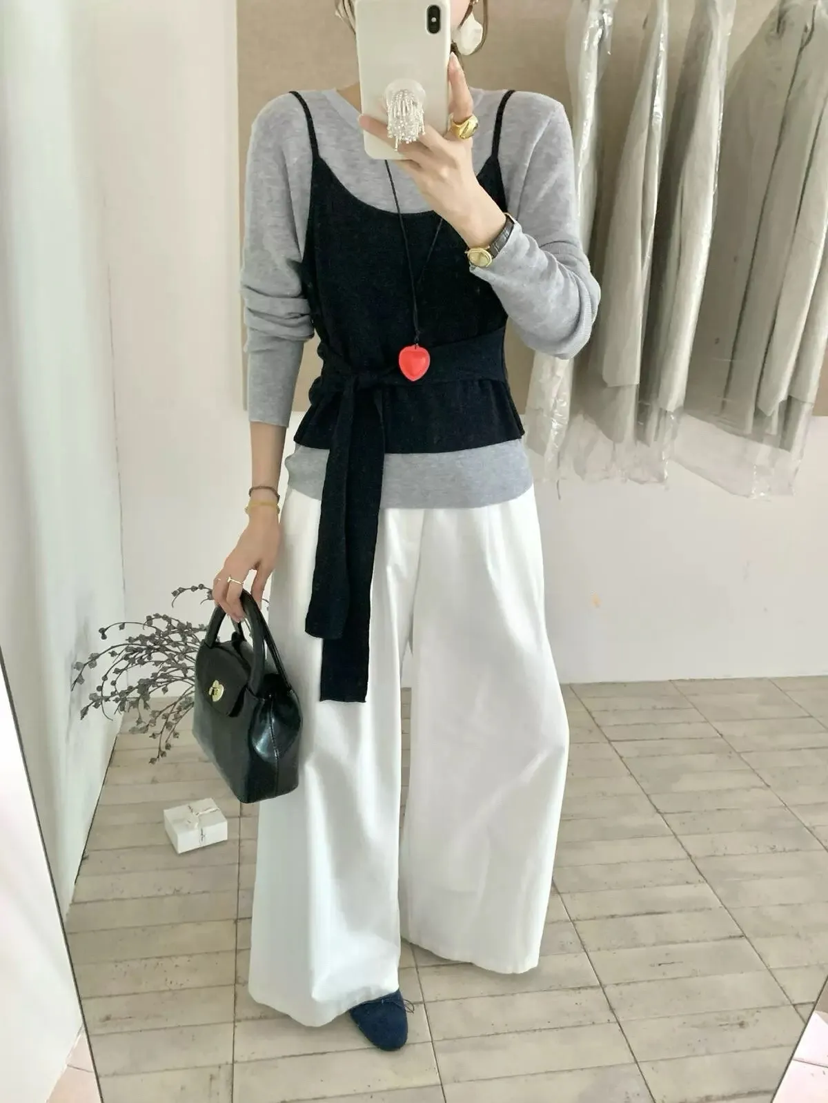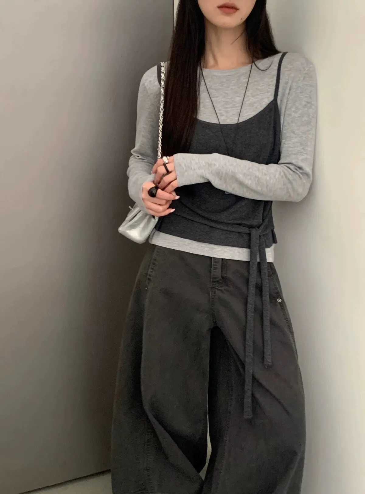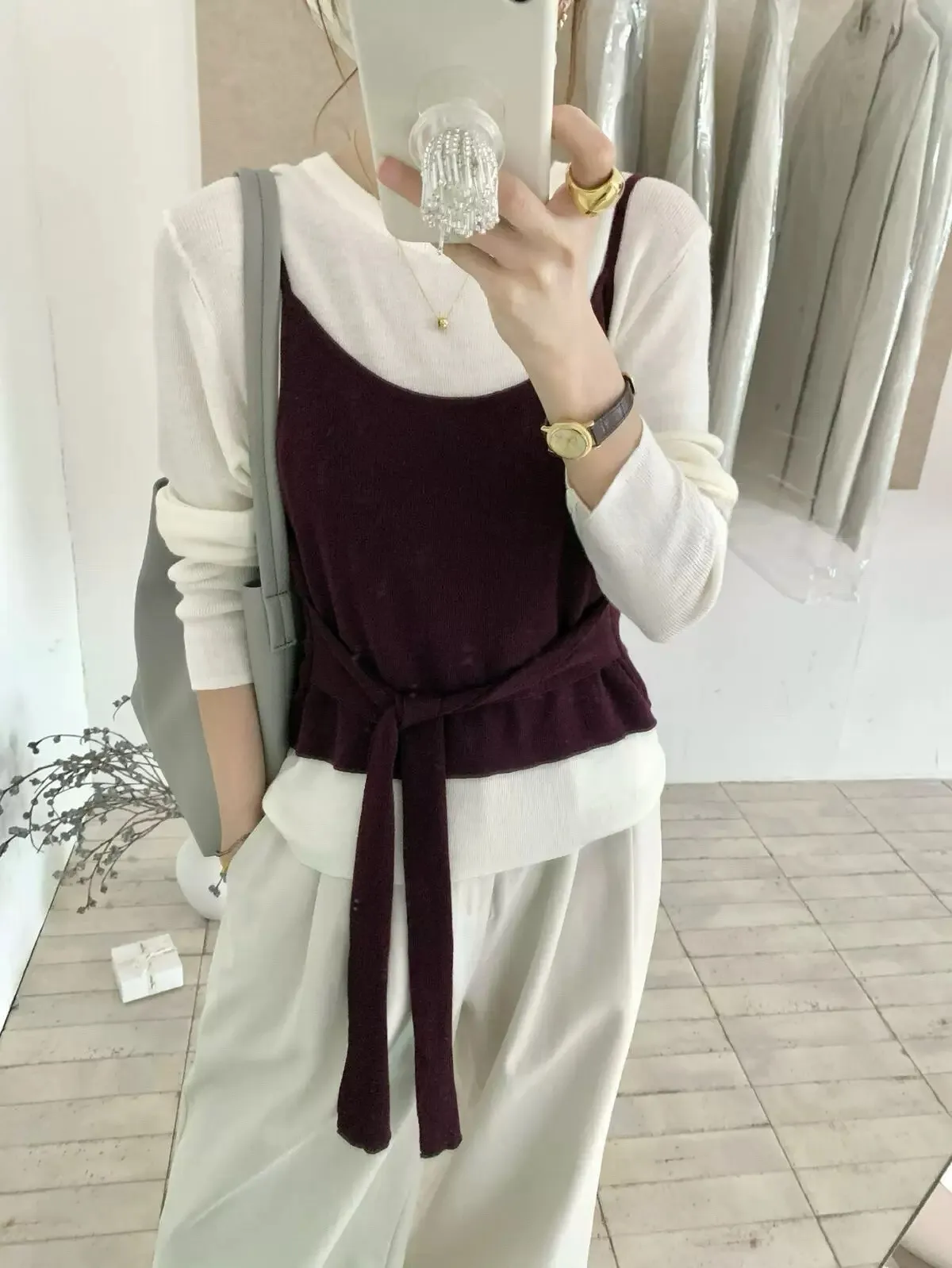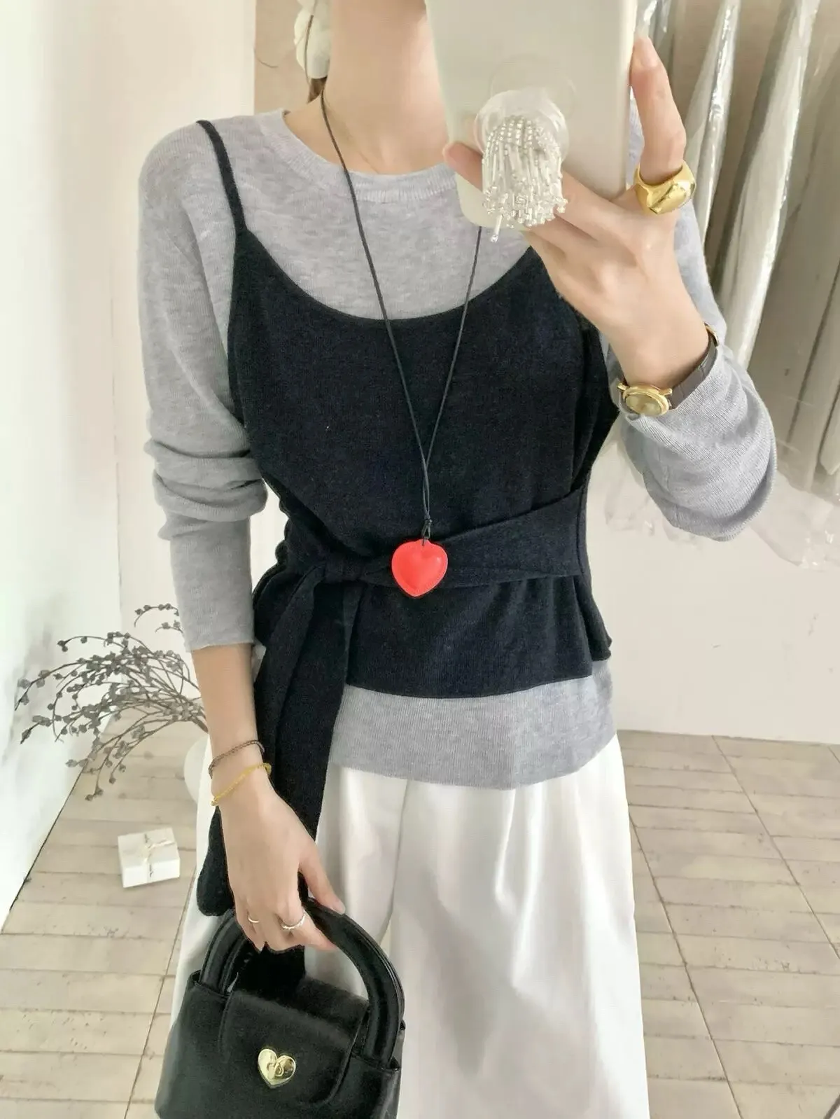 慵懶日常假兩件撞色綁帶針織衫