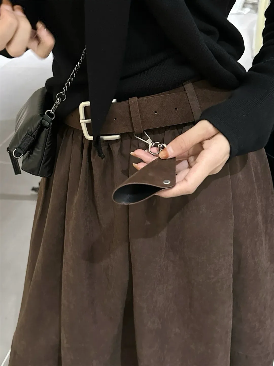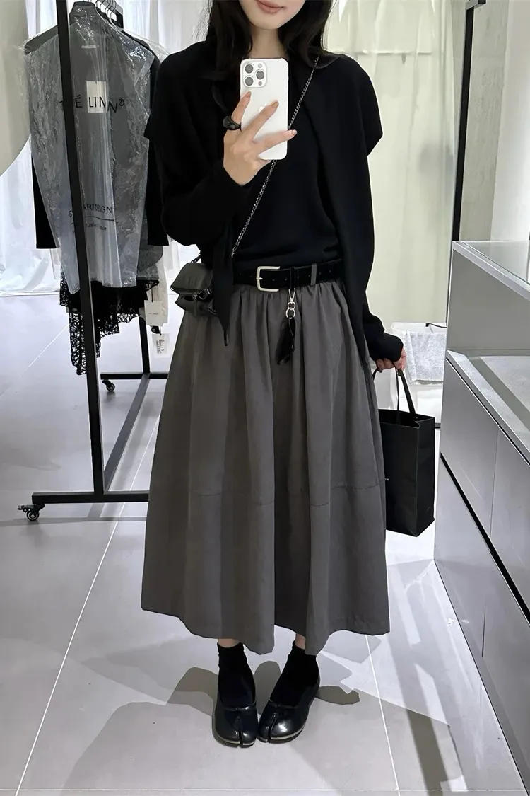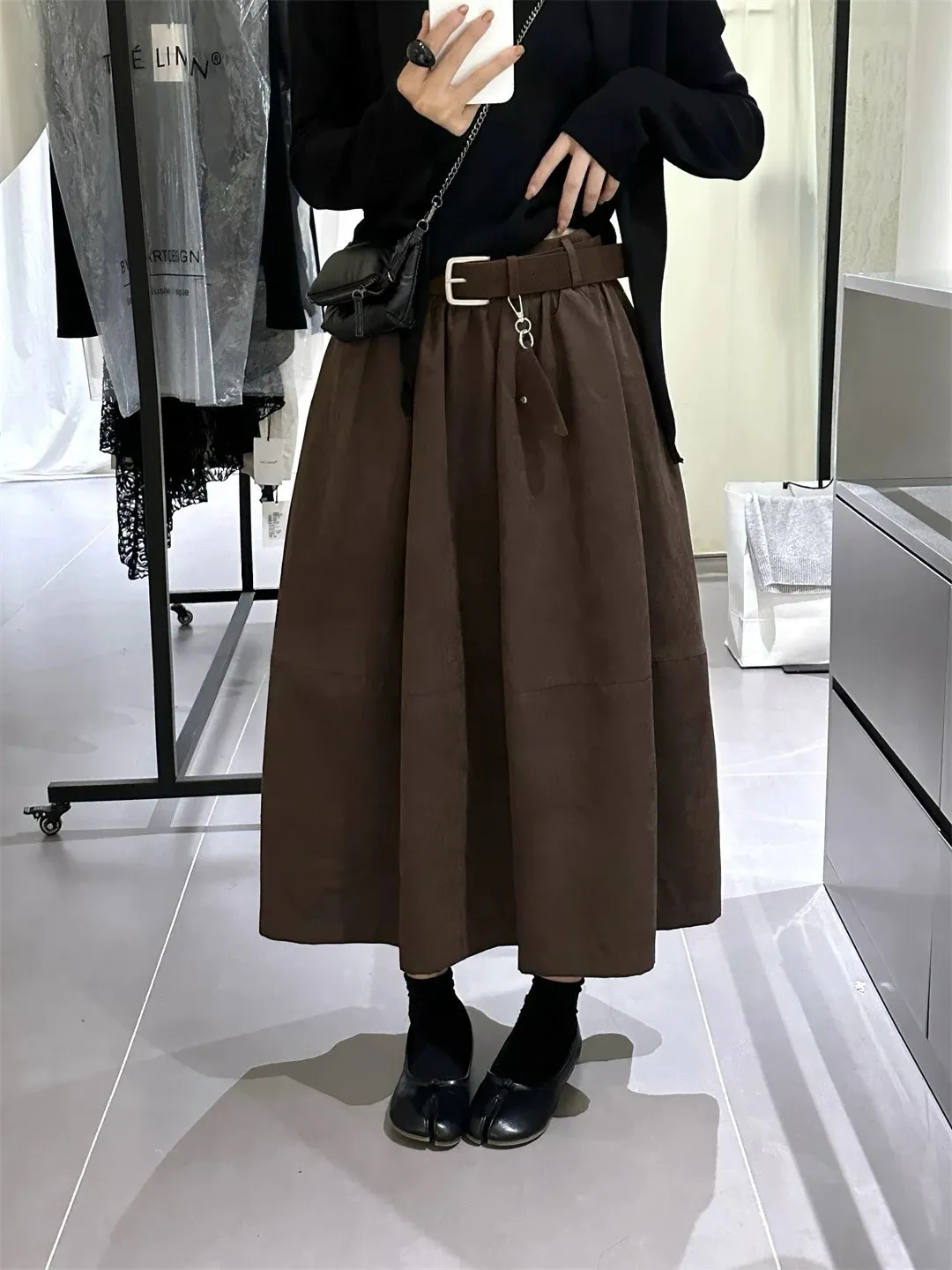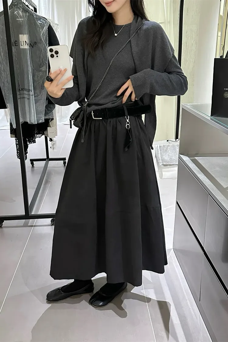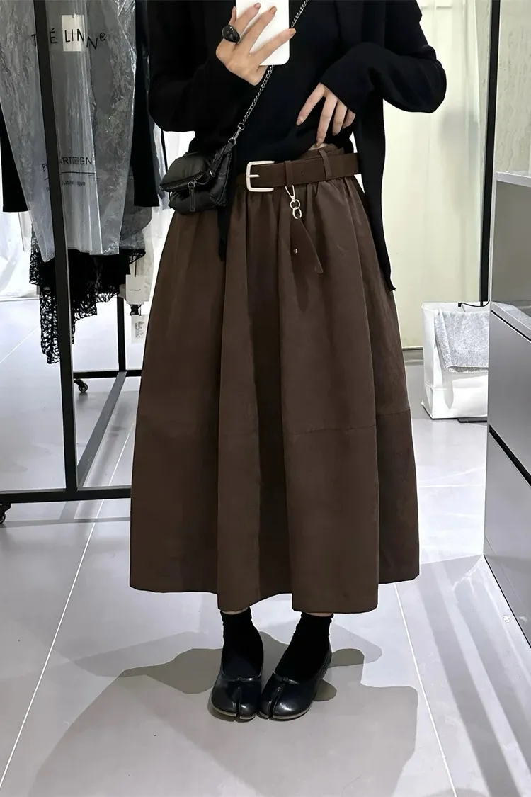 高腰顯瘦微皮絨A字傘裙(附皮帶)