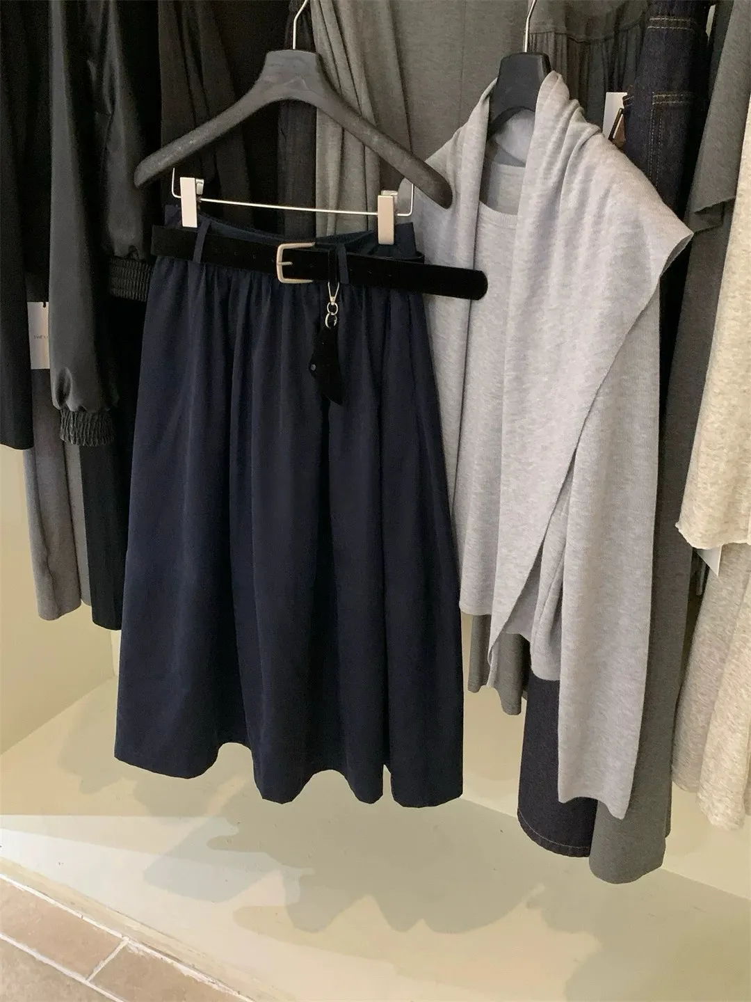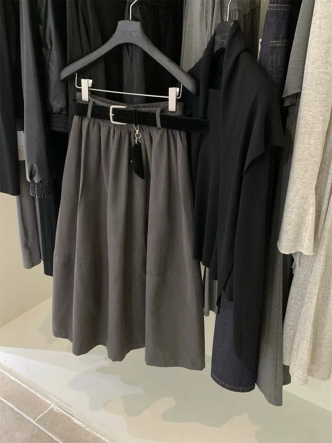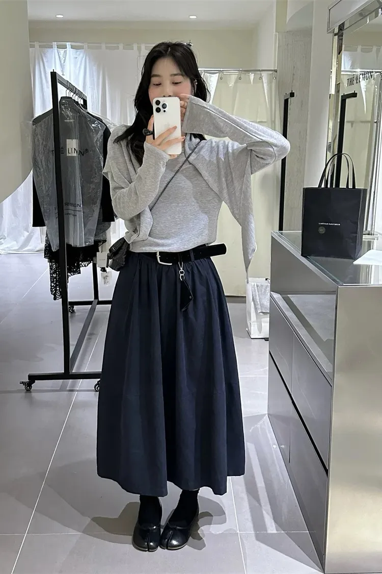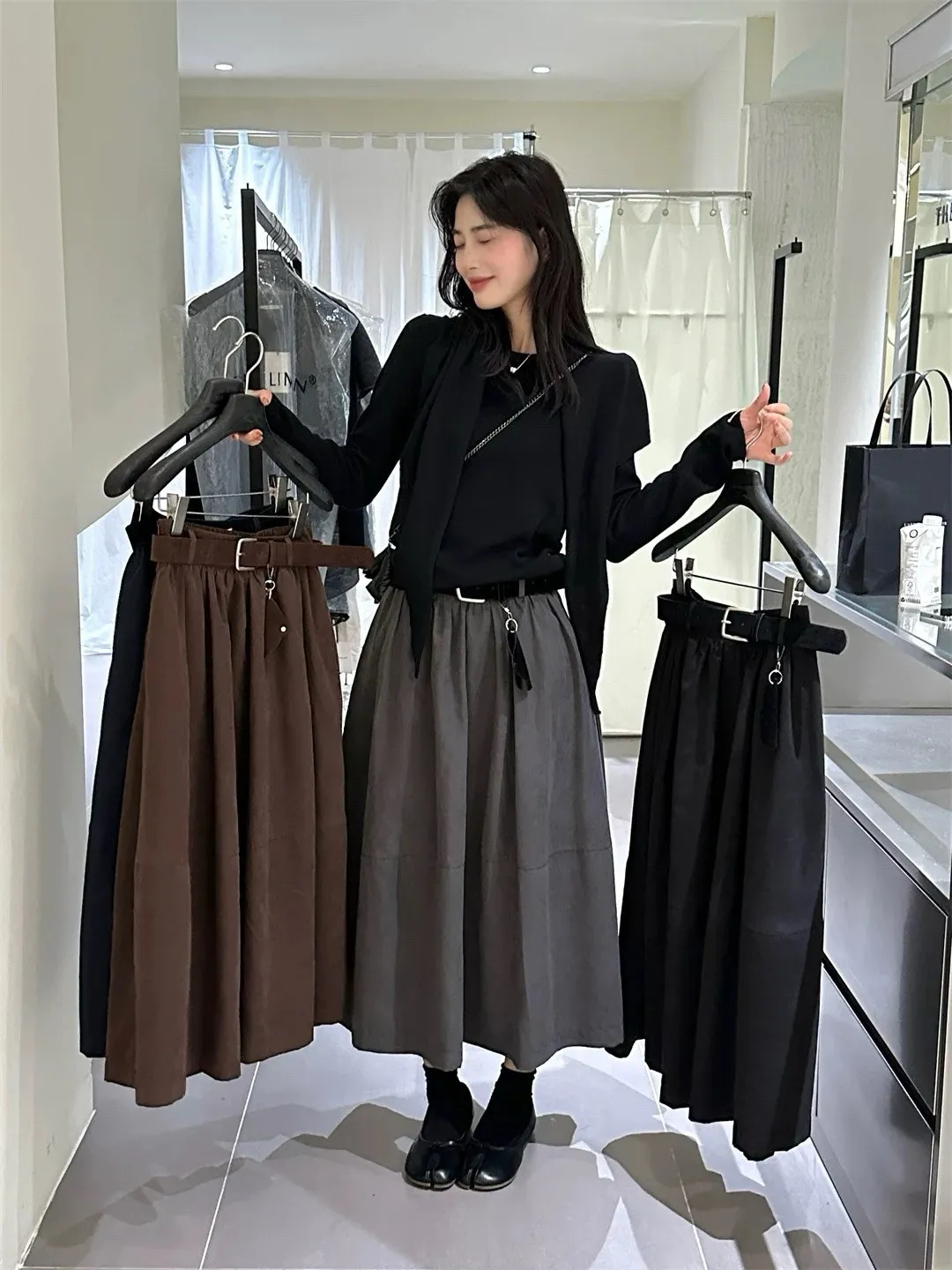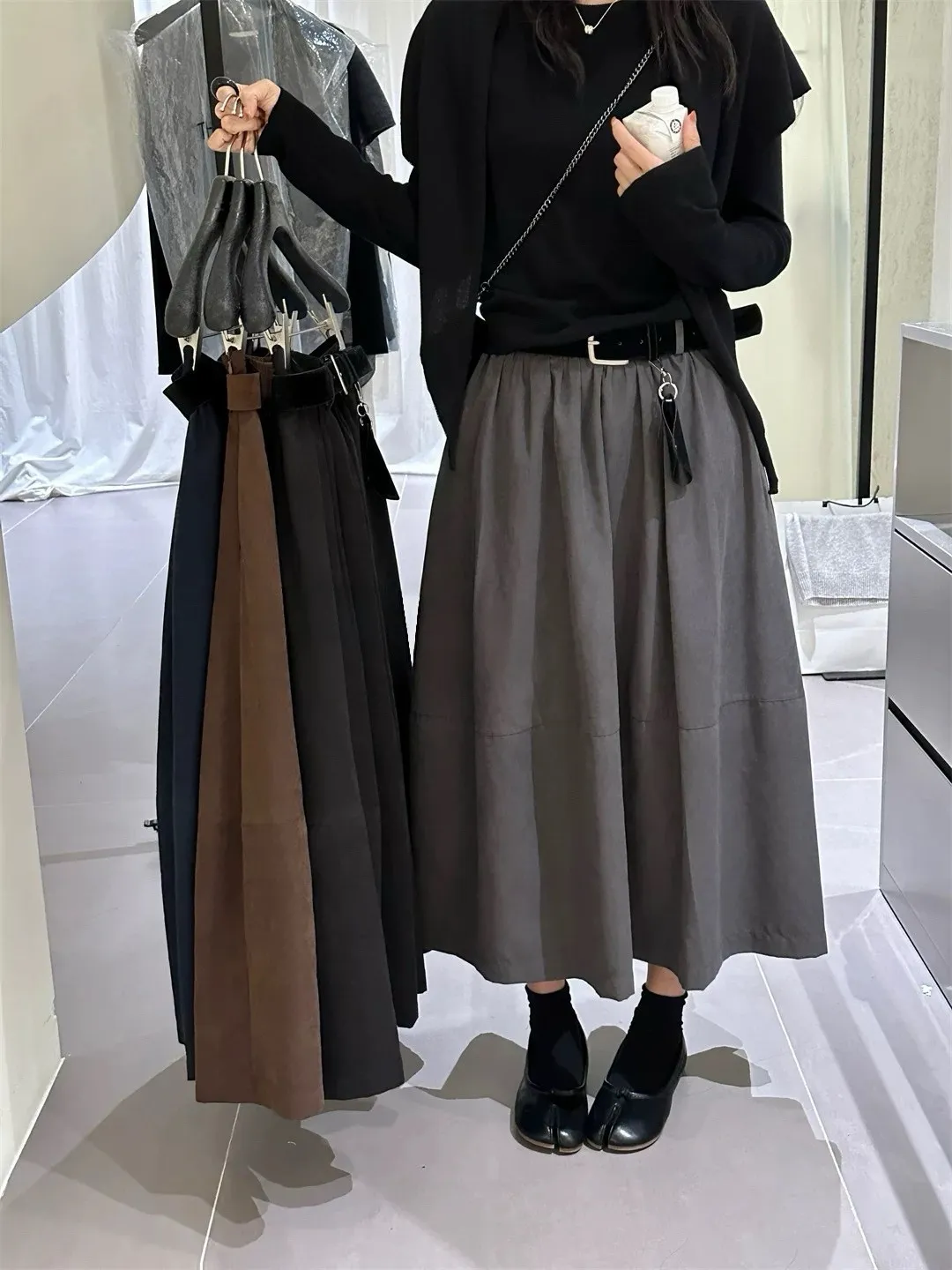 高腰顯瘦微皮絨A字傘裙(附皮帶)