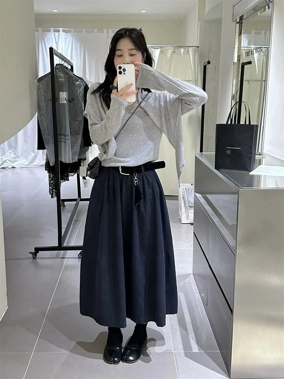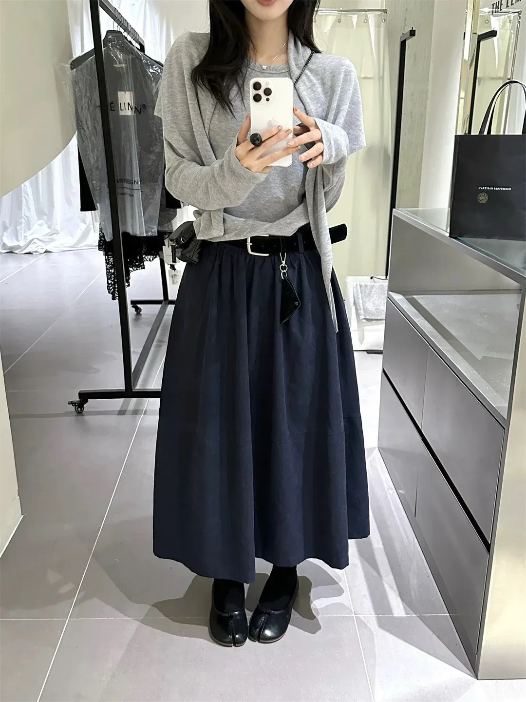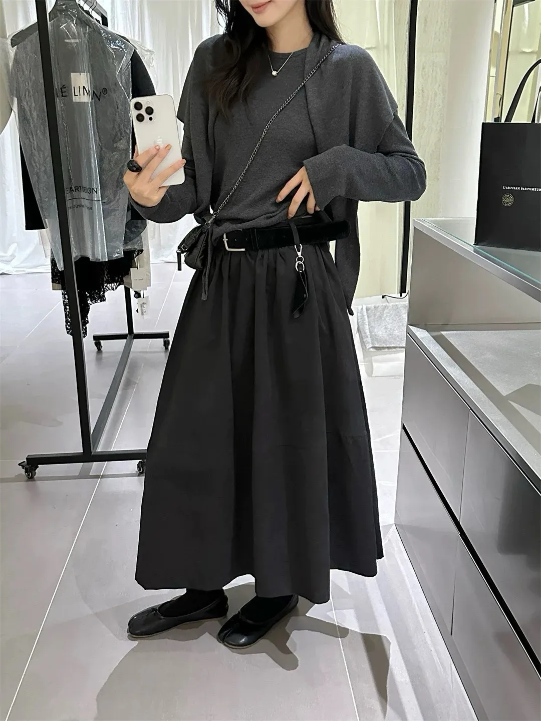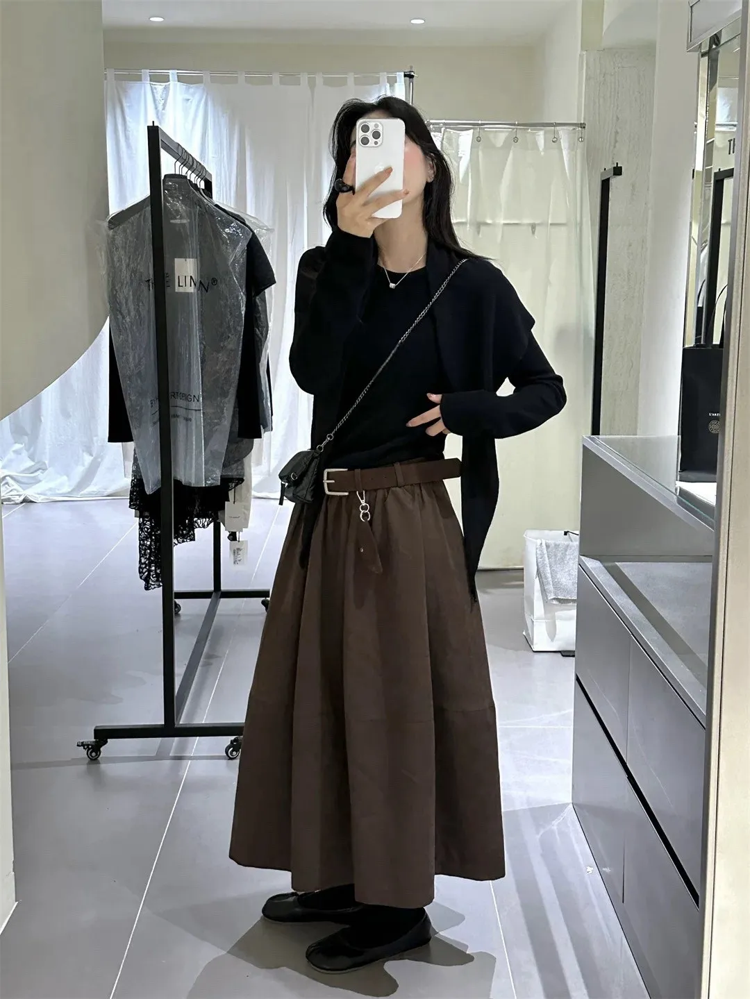 高腰顯瘦微皮絨A字傘裙(附皮帶)