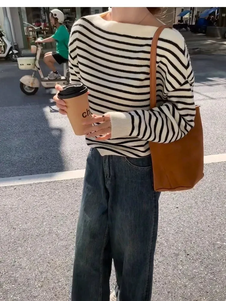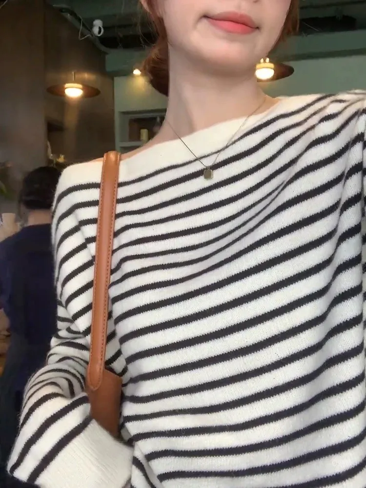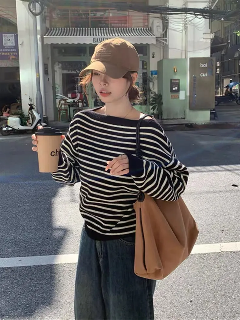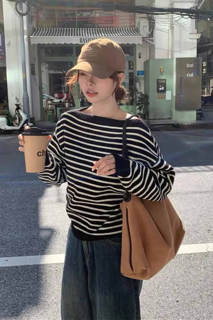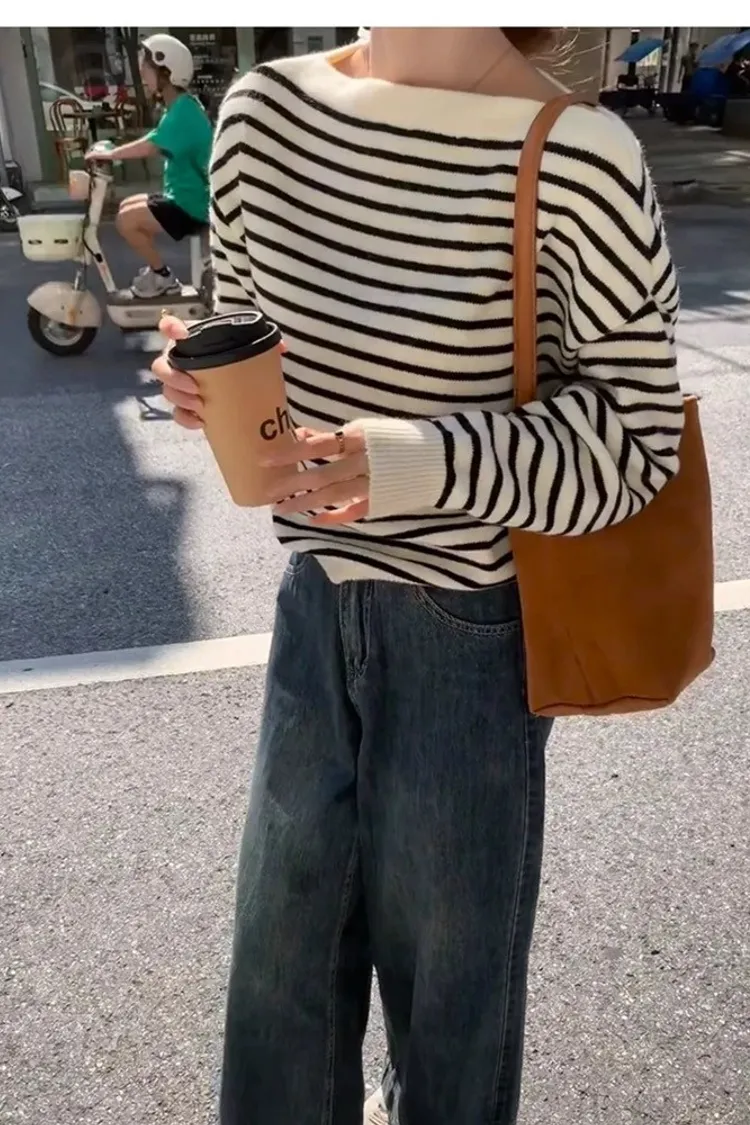 慵懶感一字領黑白條紋長袖針織上衣