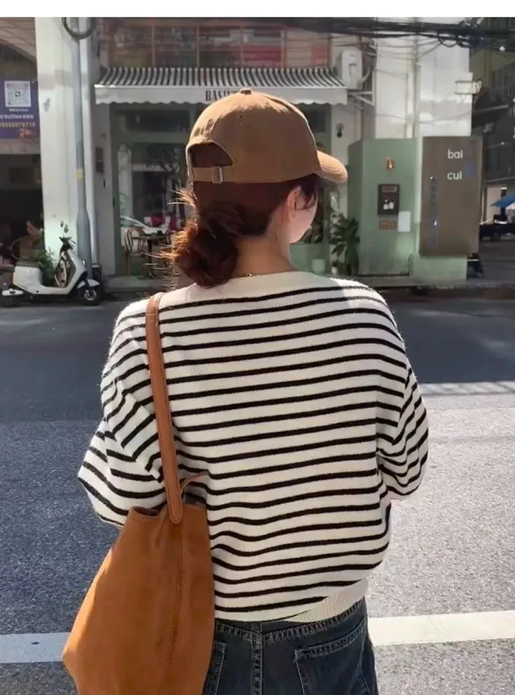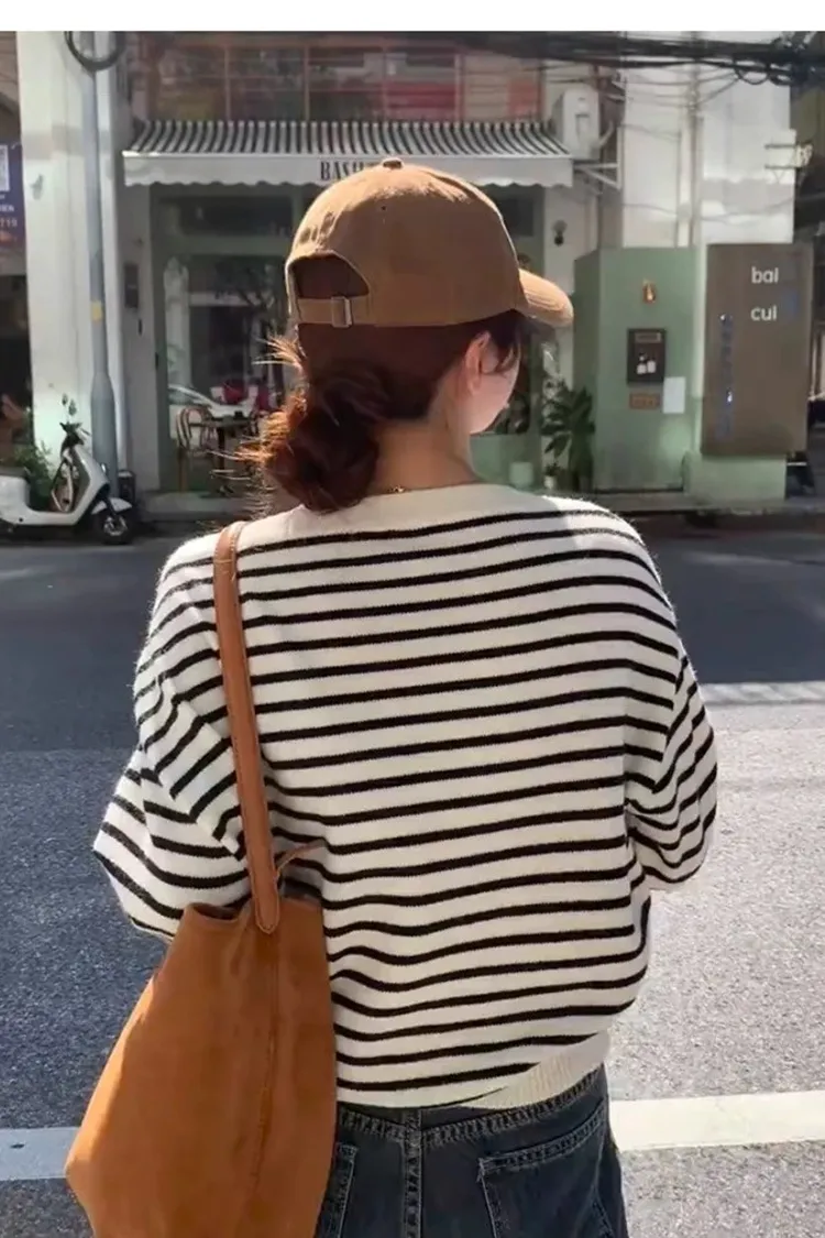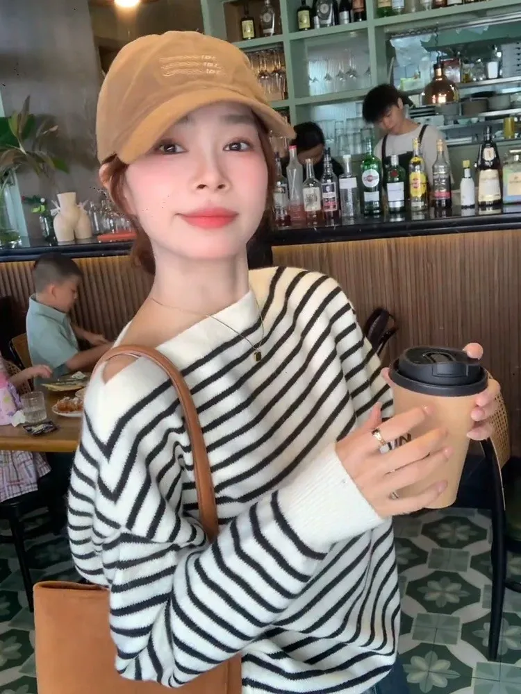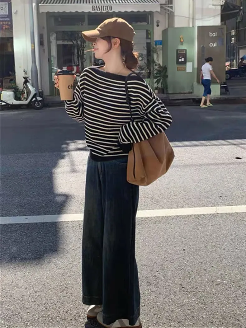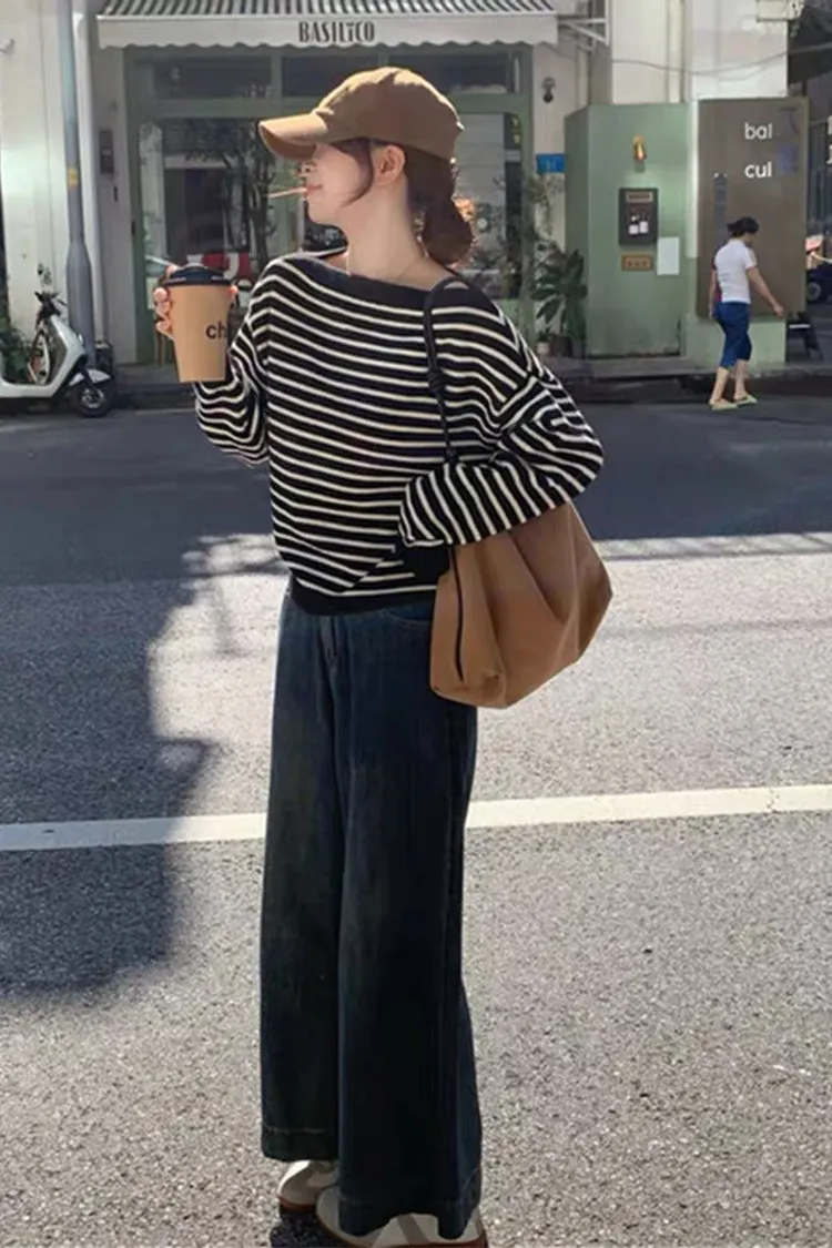 慵懶感一字領黑白條紋長袖針織上衣