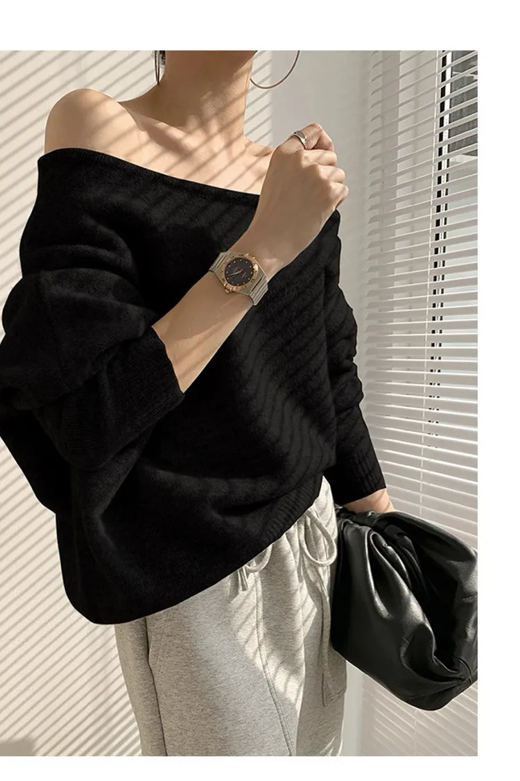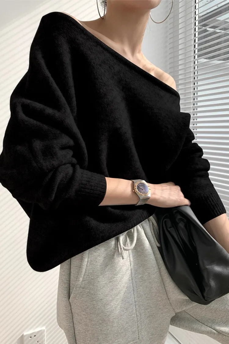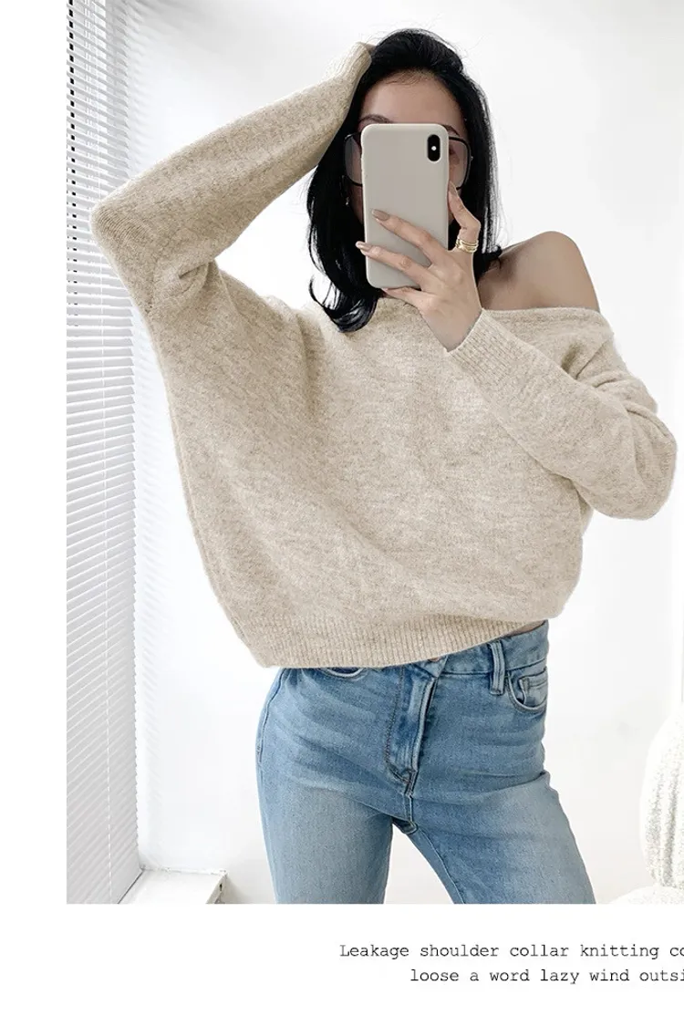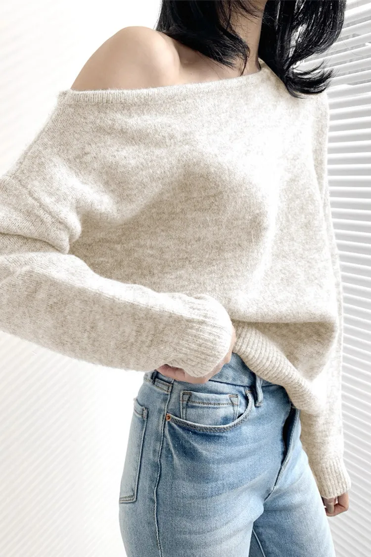 法式優雅慵懶斜肩針織上衣