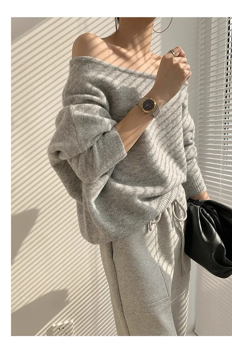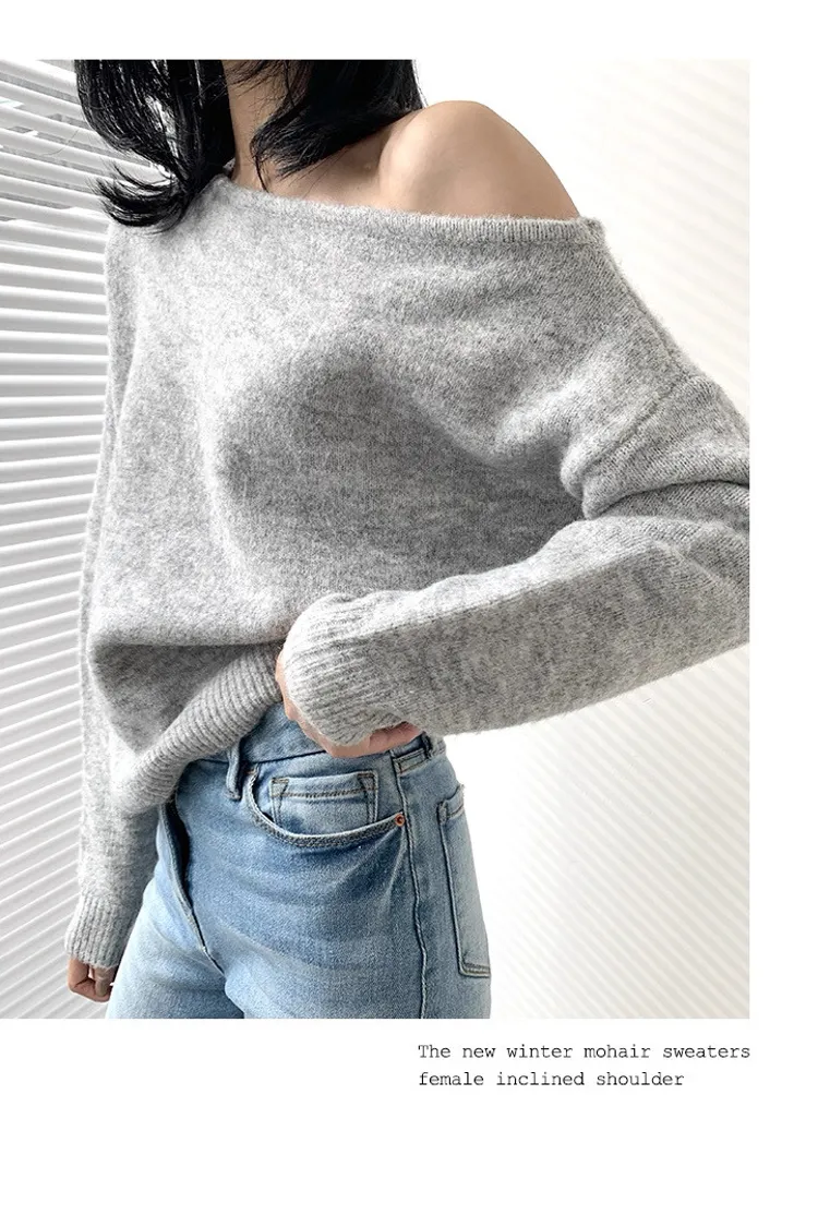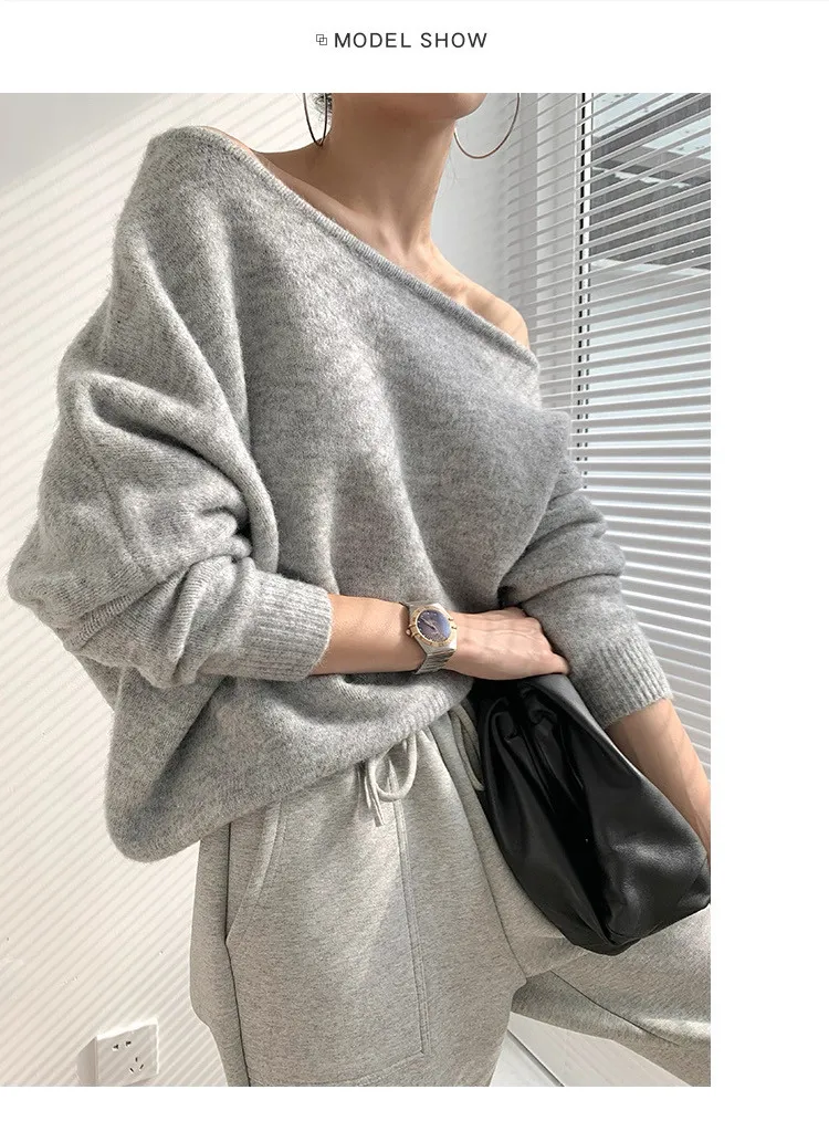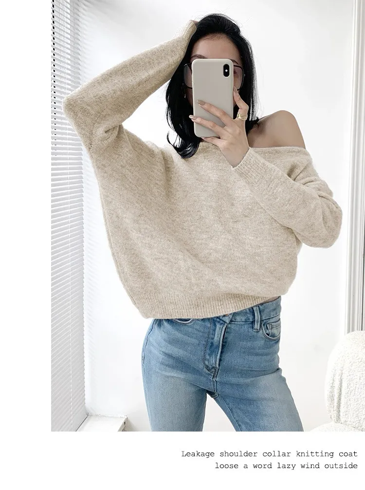 法式優雅慵懶斜肩針織上衣