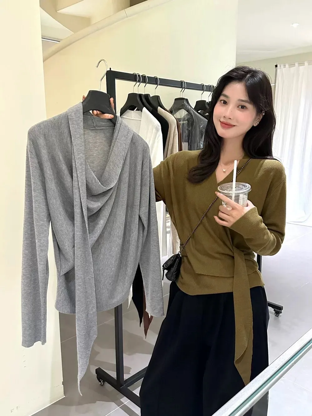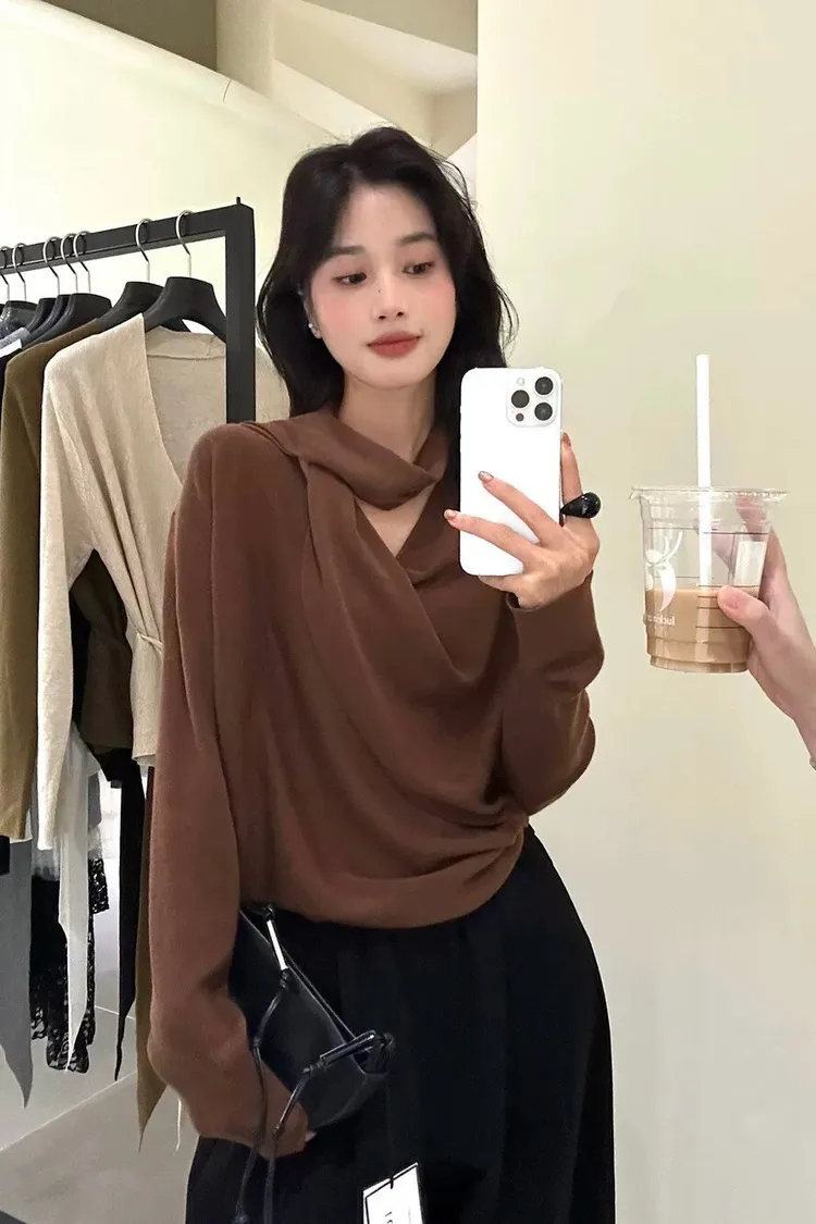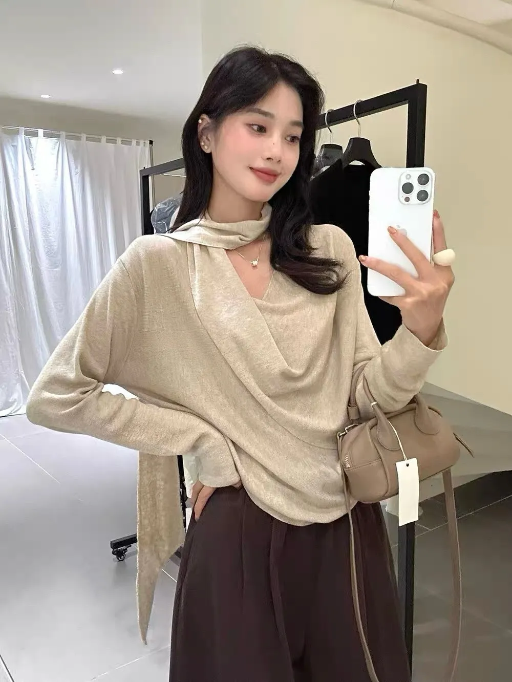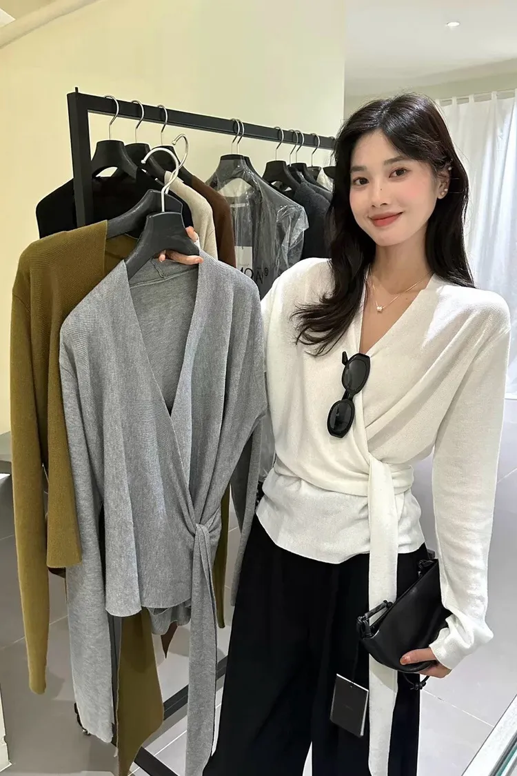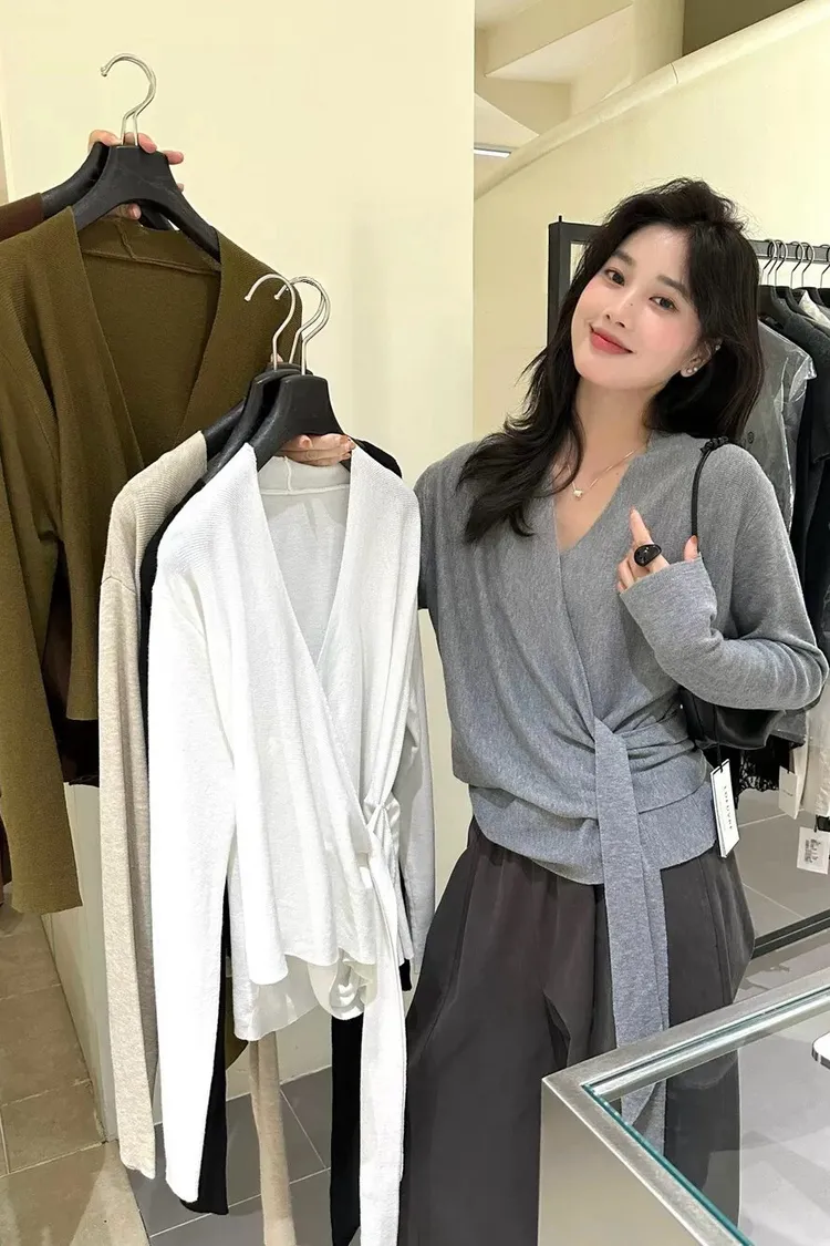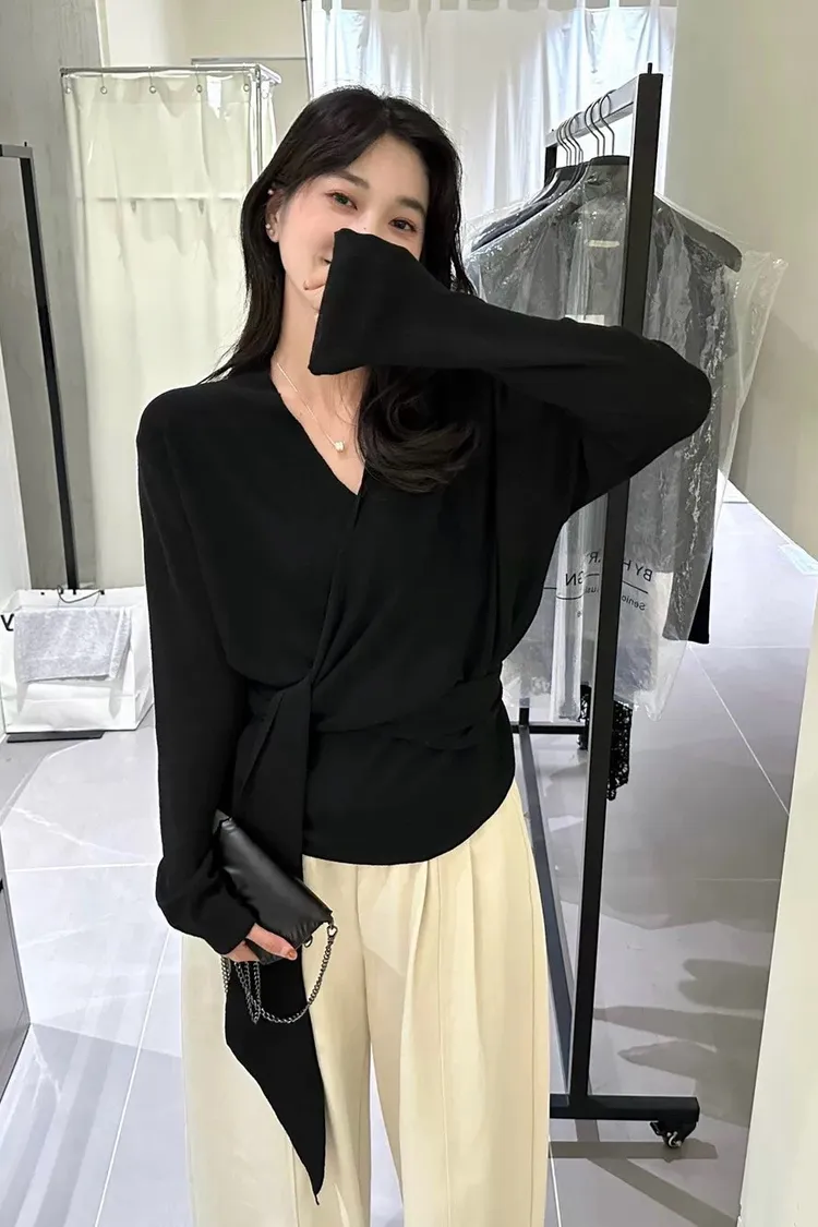秋季鬆弛感兩穿飄帶v領針織上衣