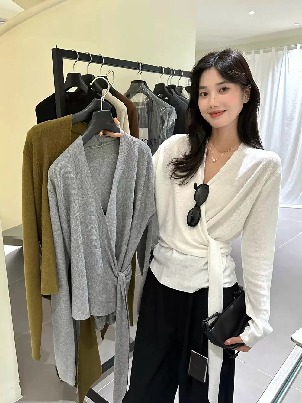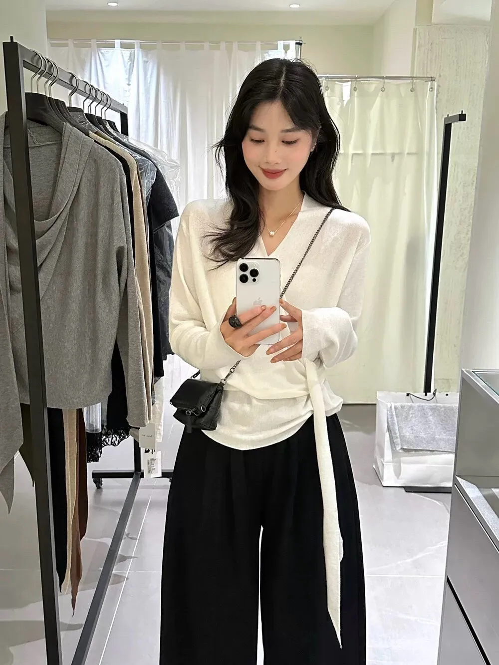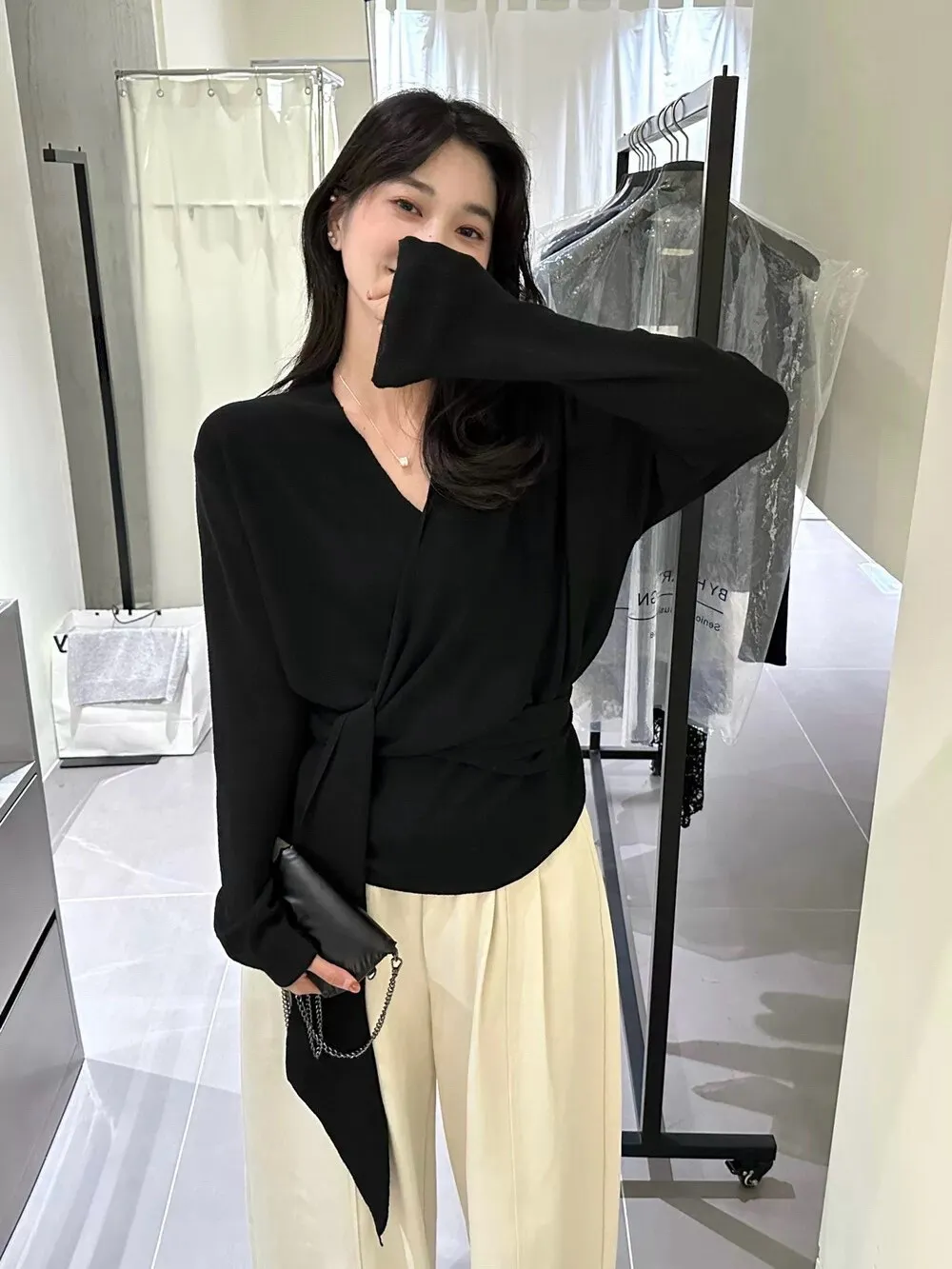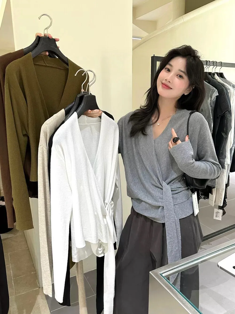 秋季鬆弛感兩穿飄帶v領針織上衣