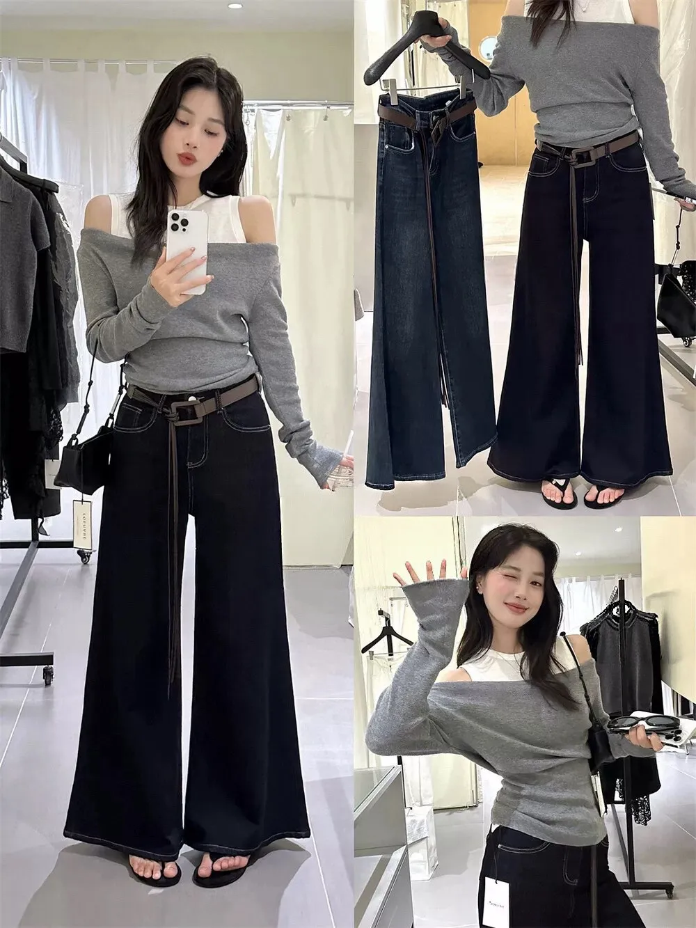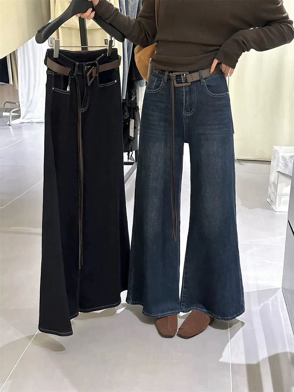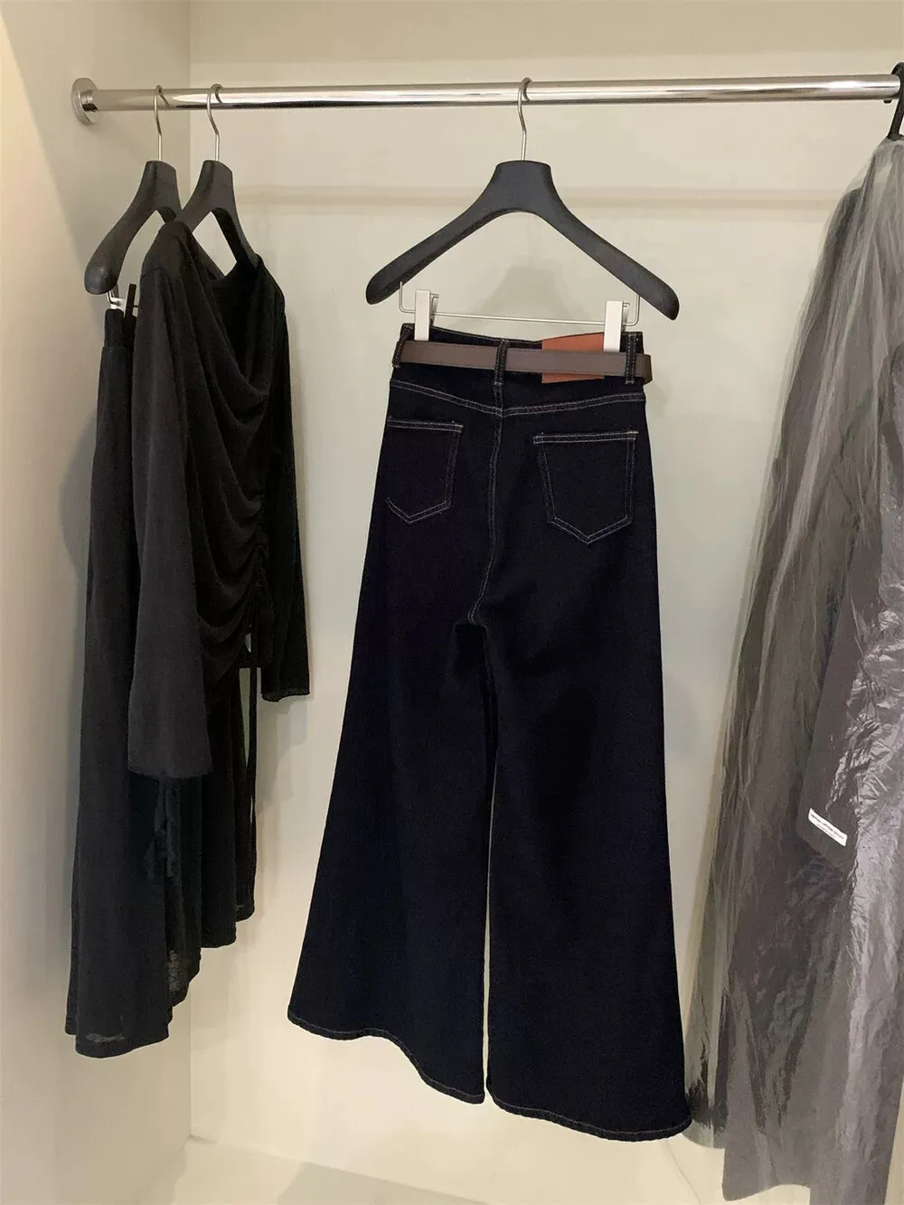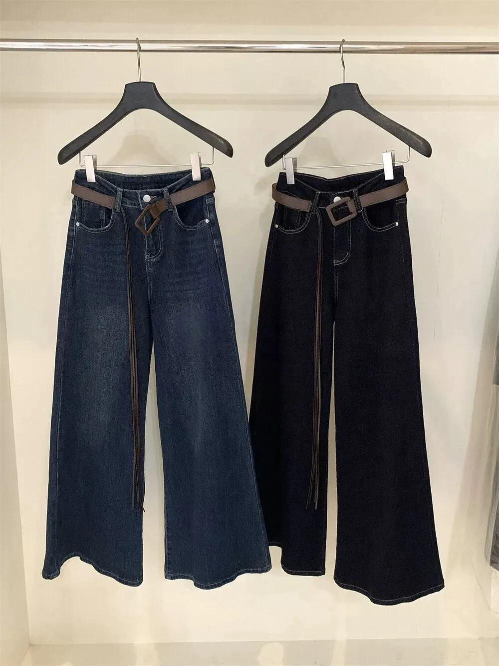 高腰顯瘦直筒微喇叭牛仔長褲(附腰帶)