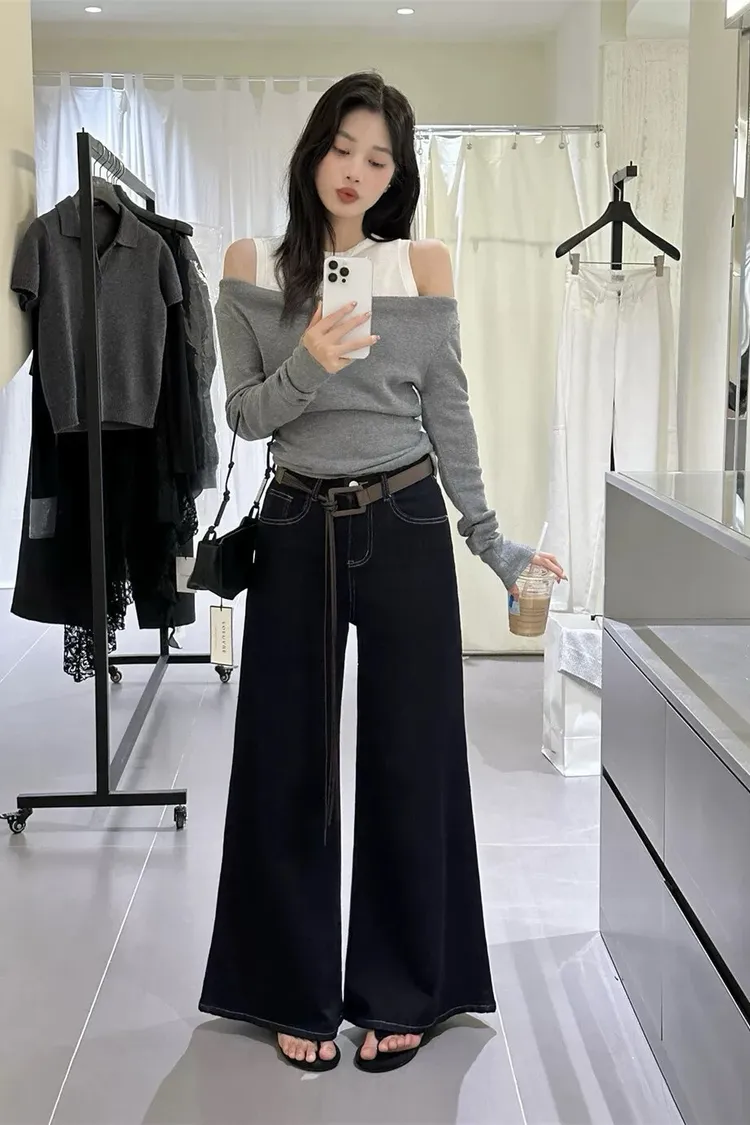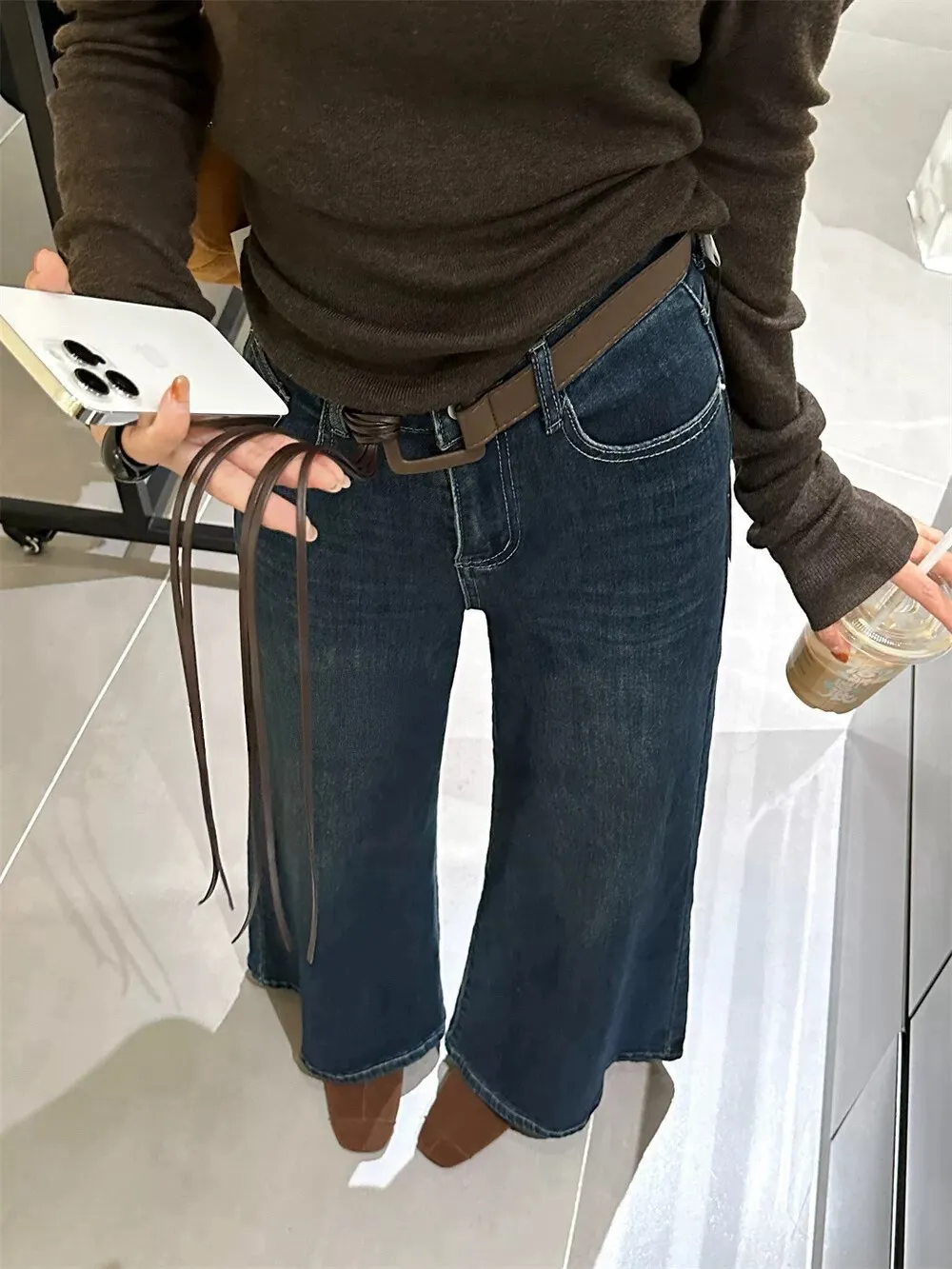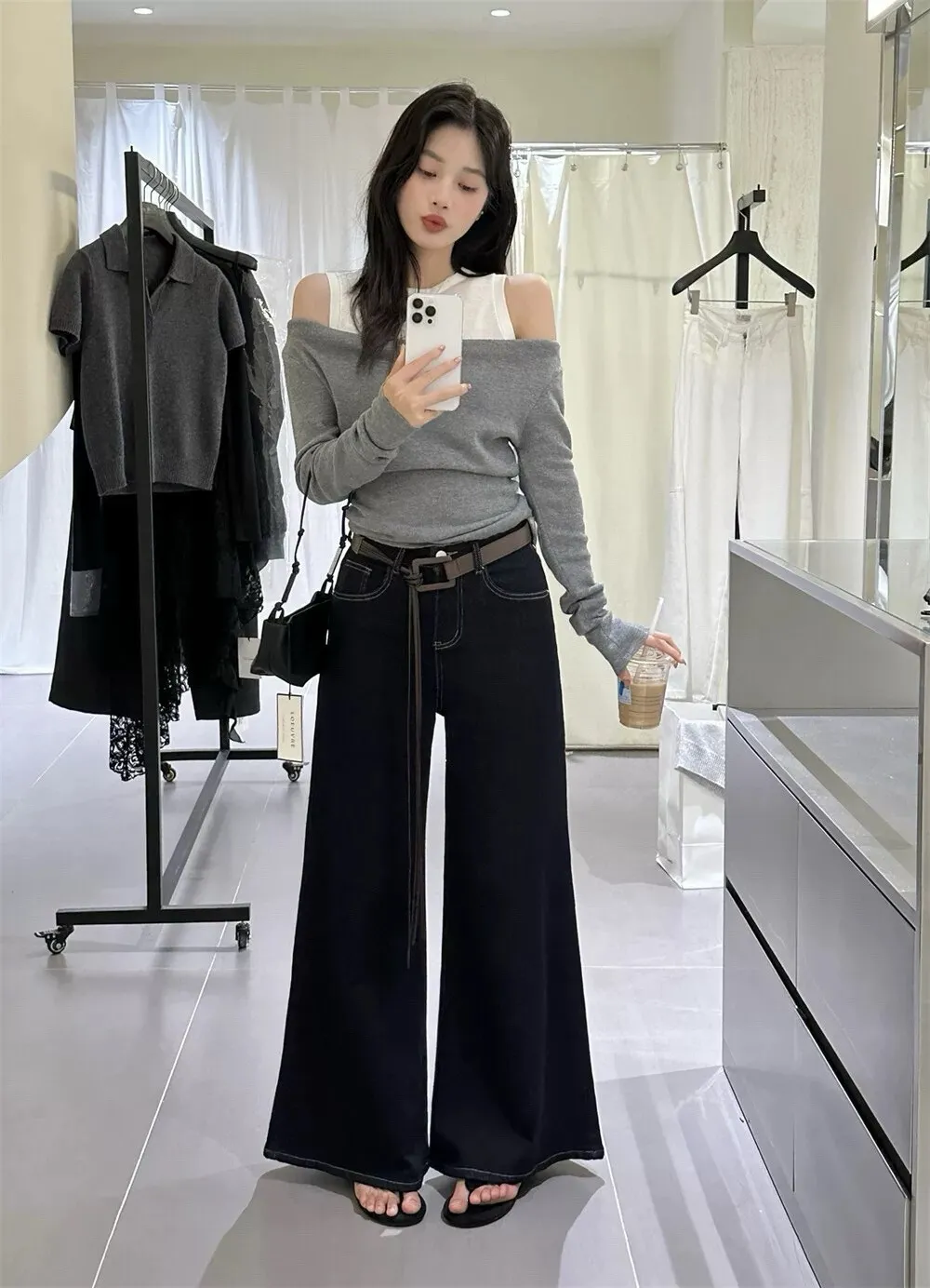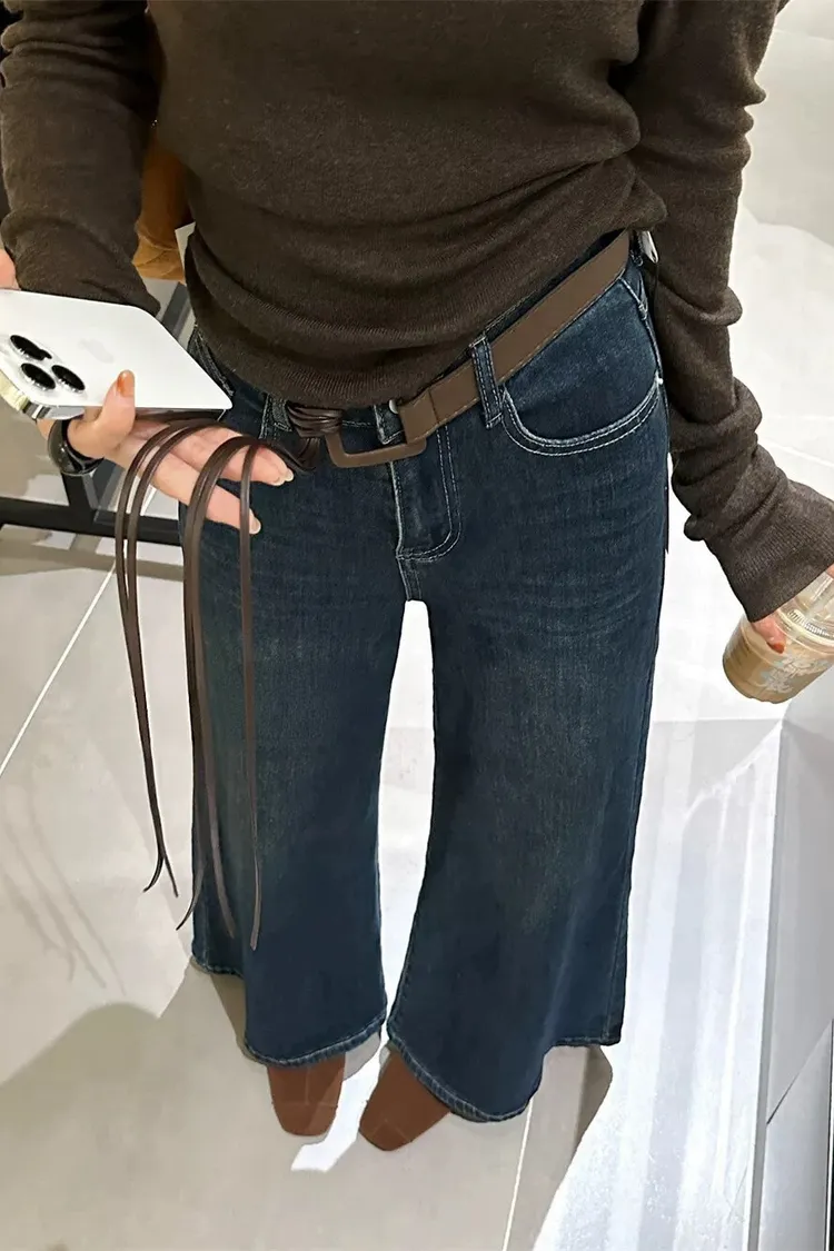高腰顯瘦直筒微喇叭牛仔長褲(附腰帶)