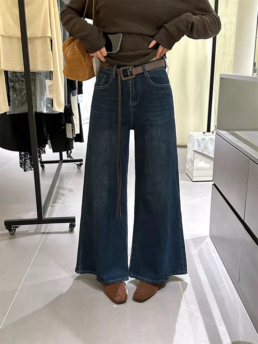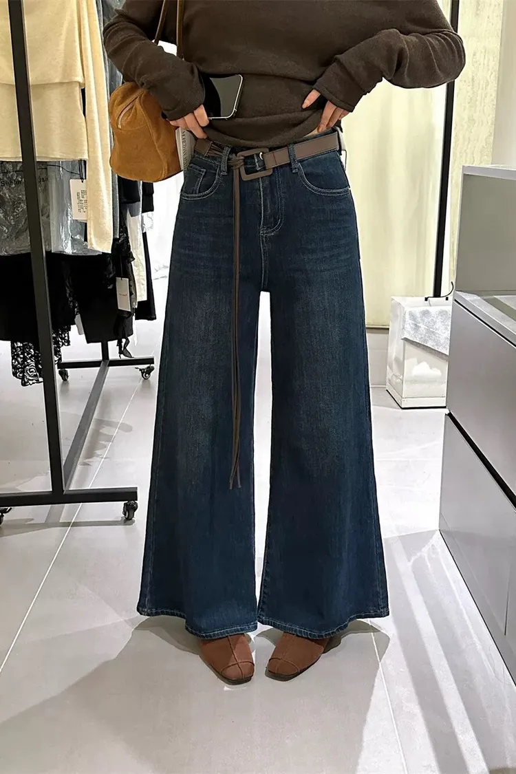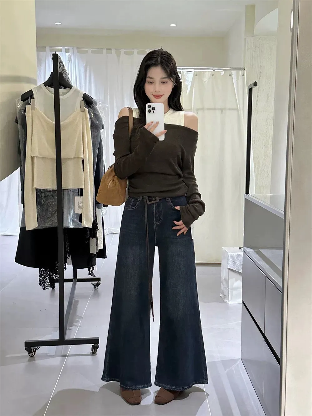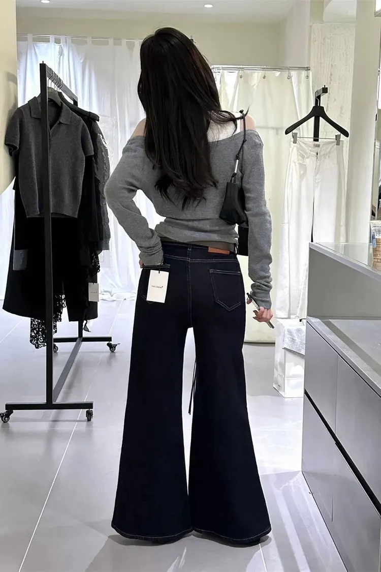 高腰顯瘦直筒微喇叭牛仔長褲(附腰帶)