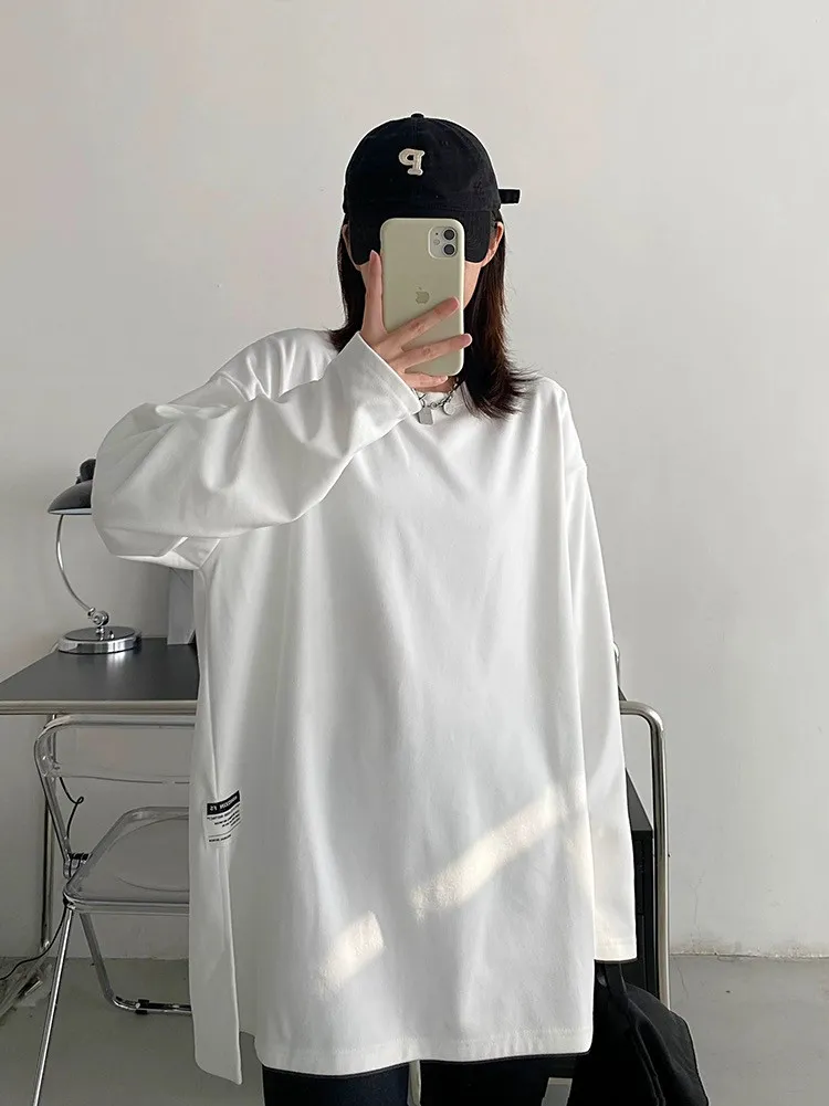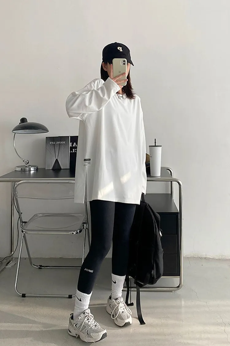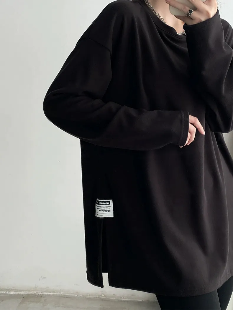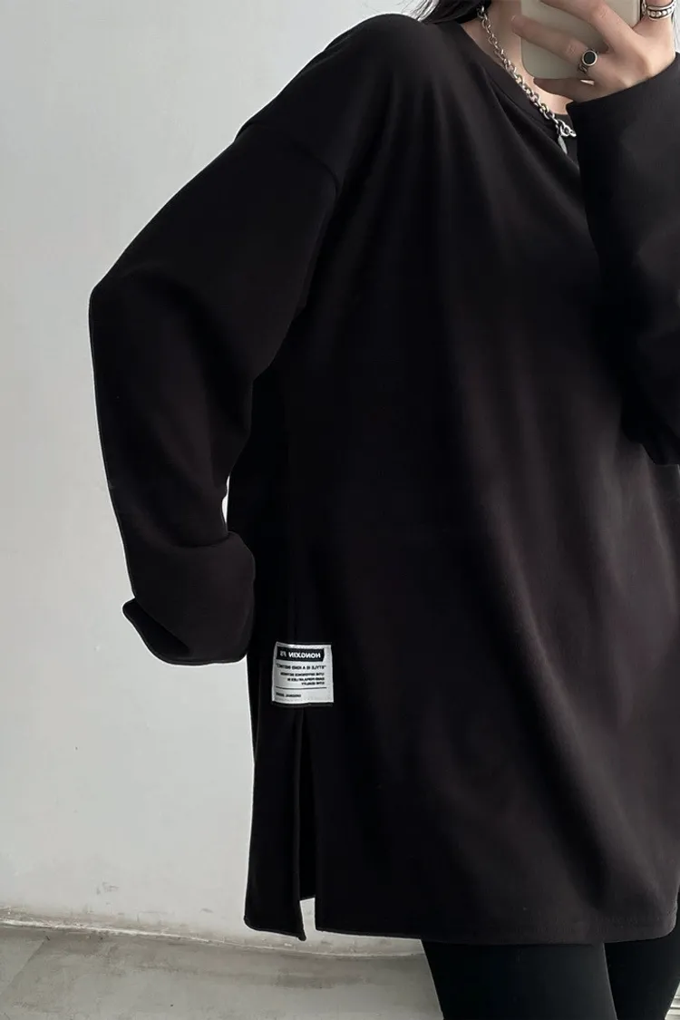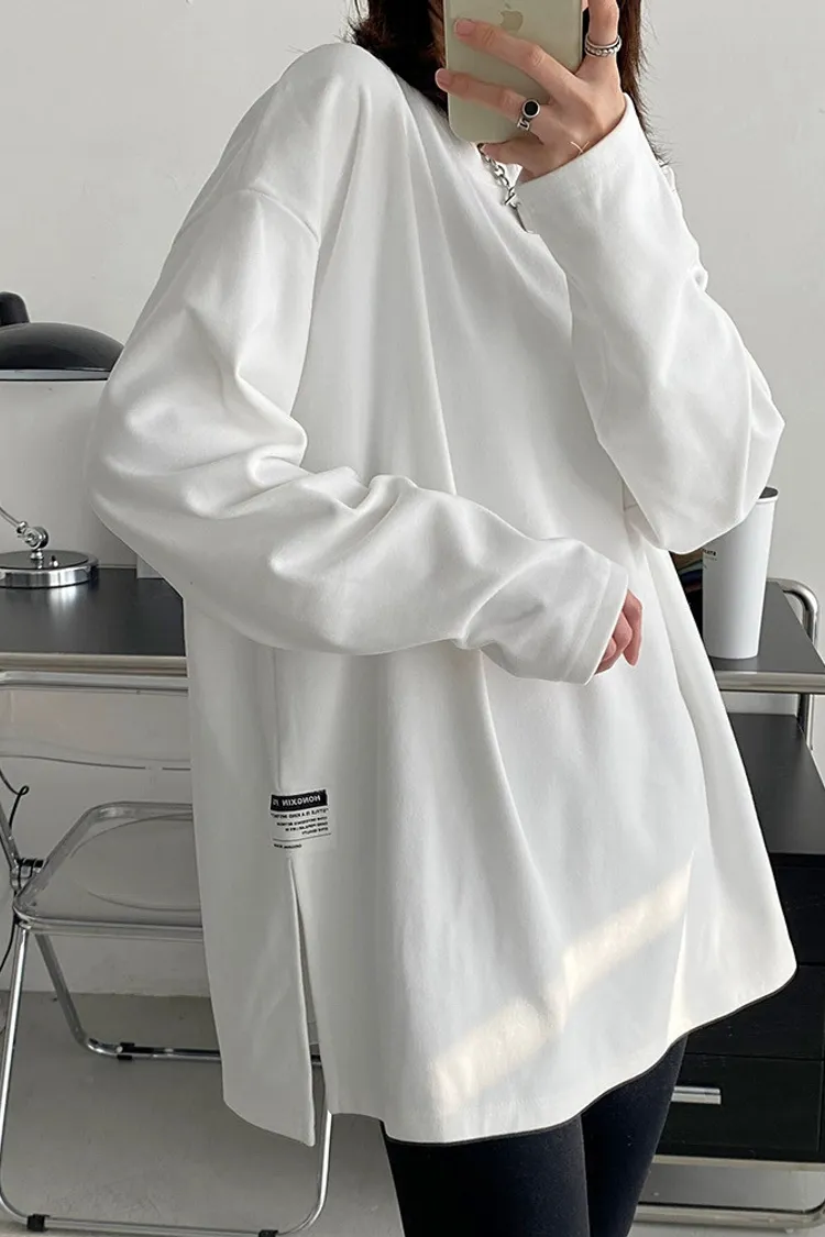 純棉德絨純色側邊標籤開岔長袖內搭T