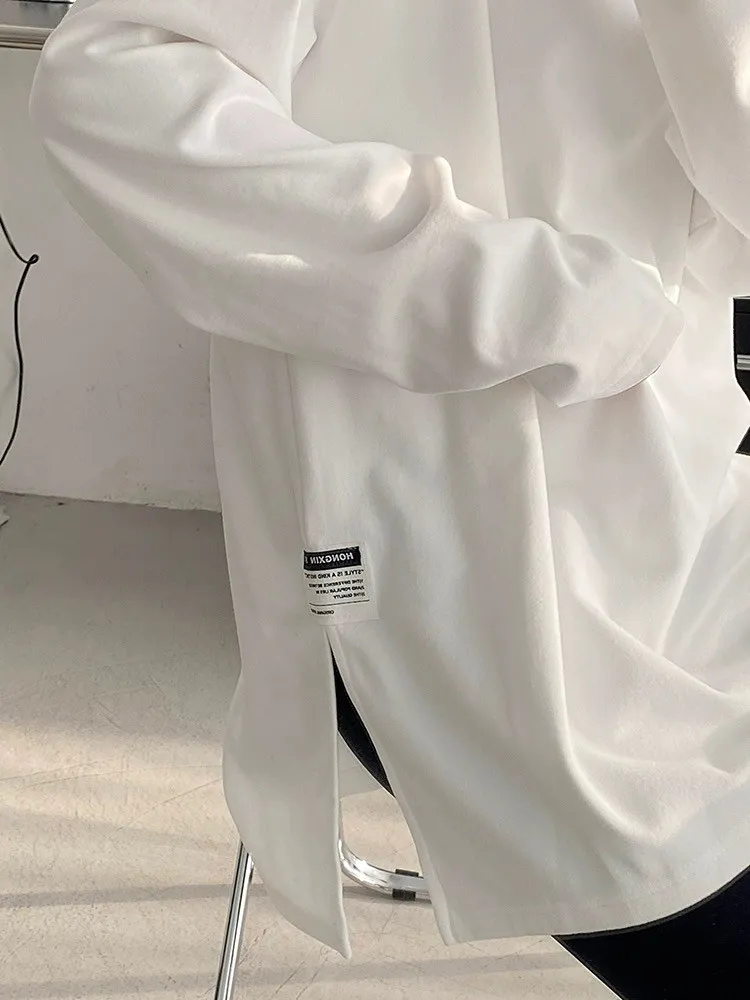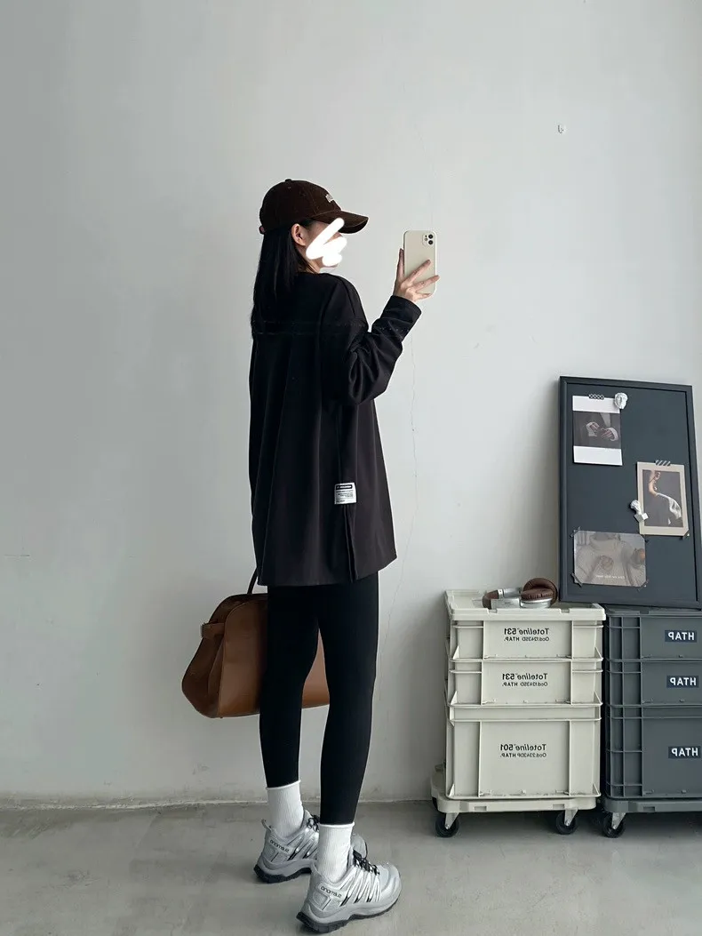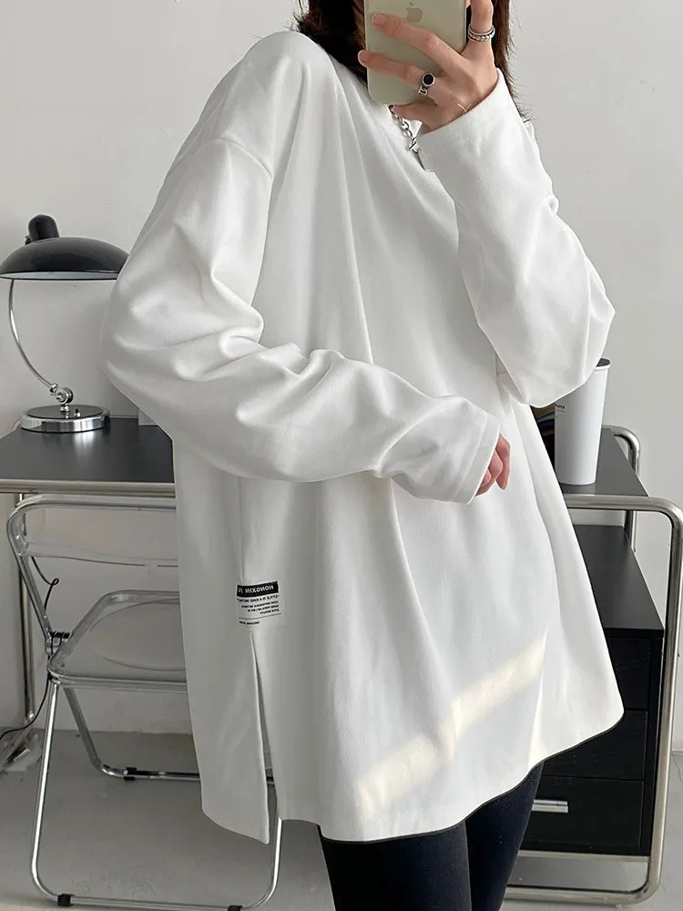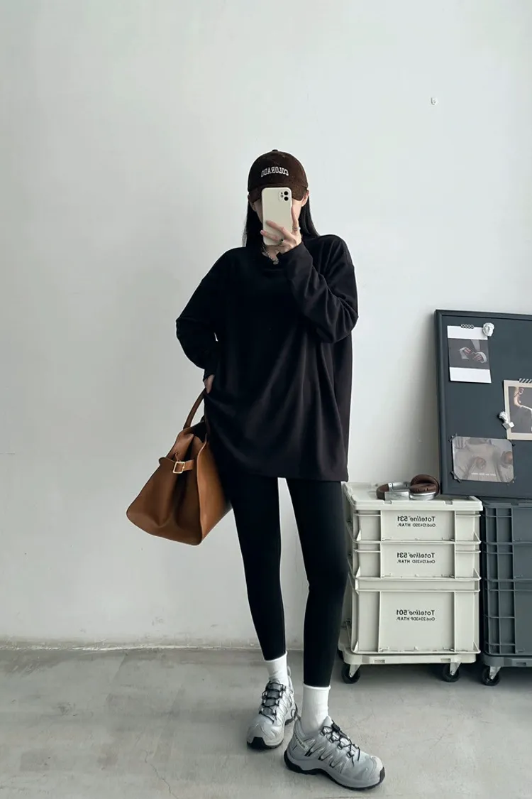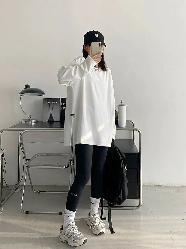 純棉德絨純色側邊標籤開岔長袖內搭T