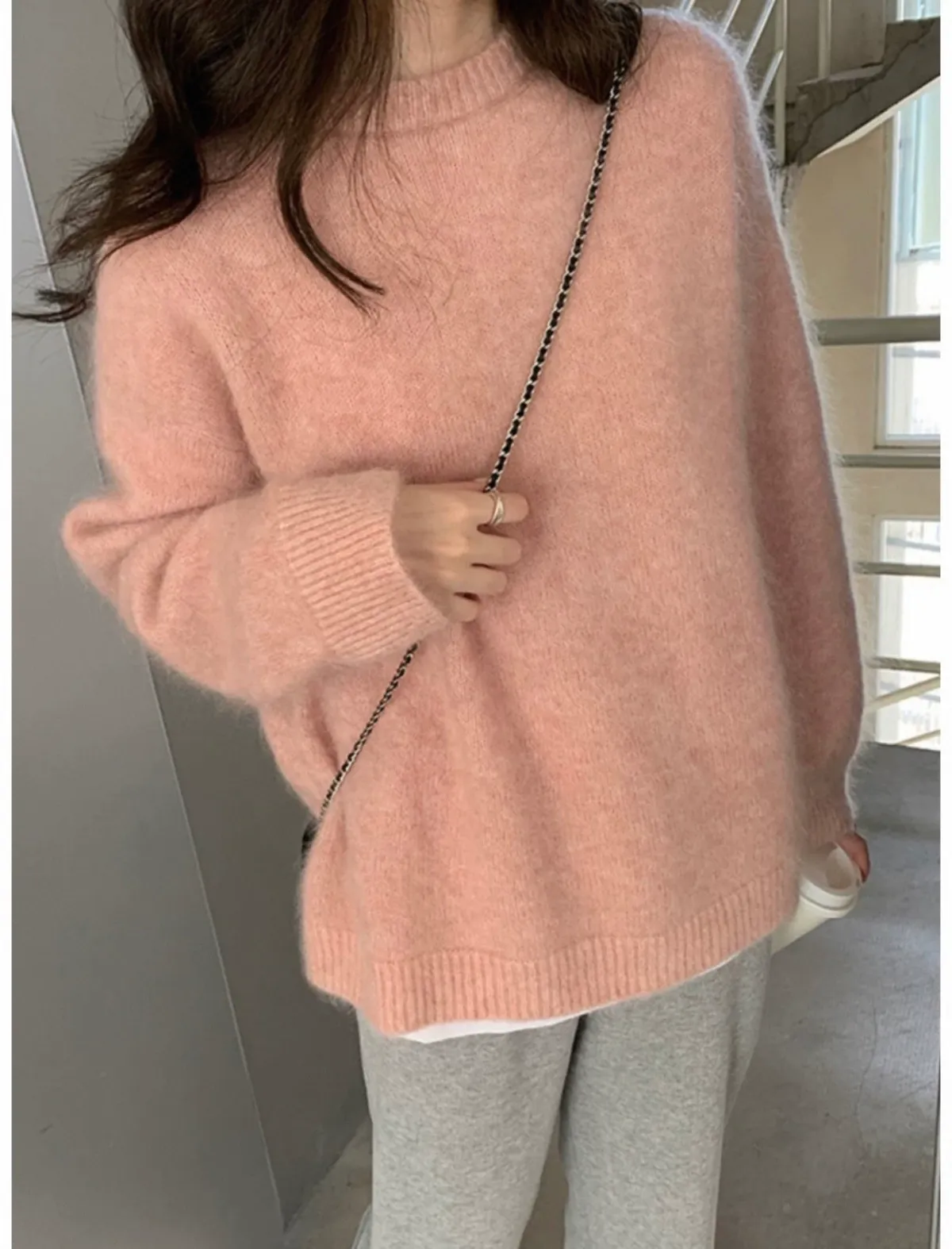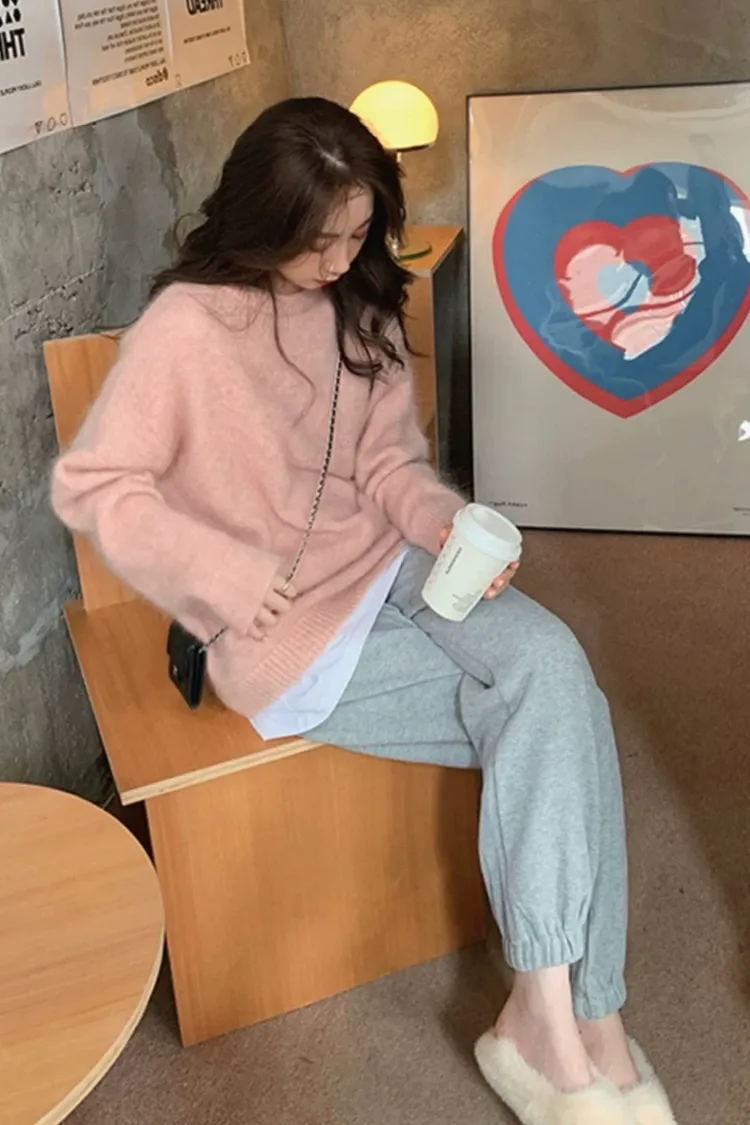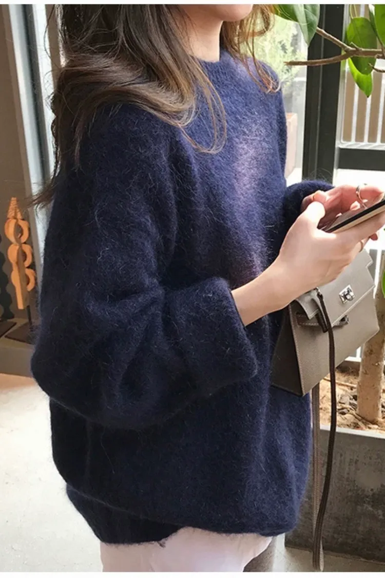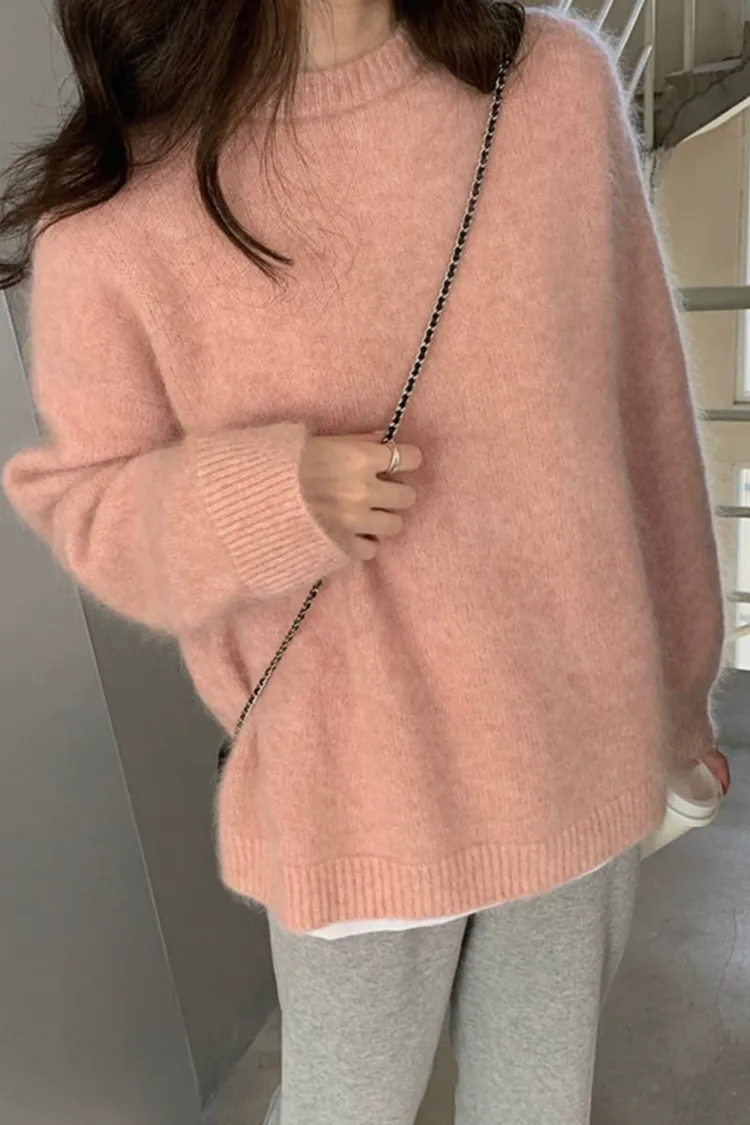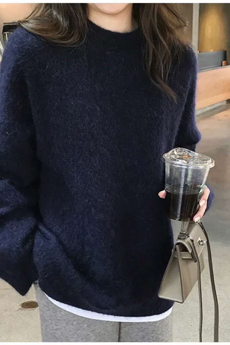 純色馬海毛軟糯慵懶感圓領針織毛衣