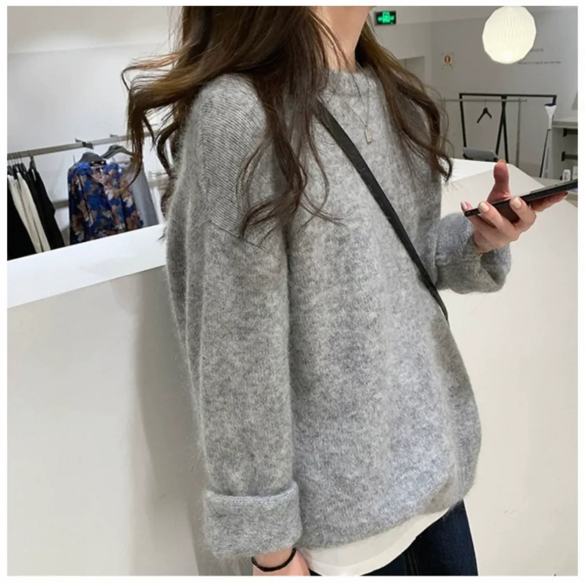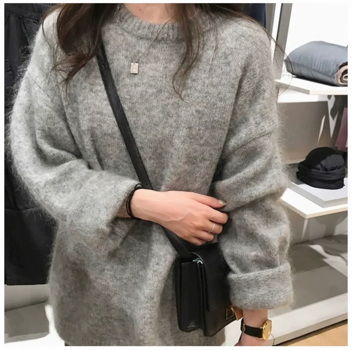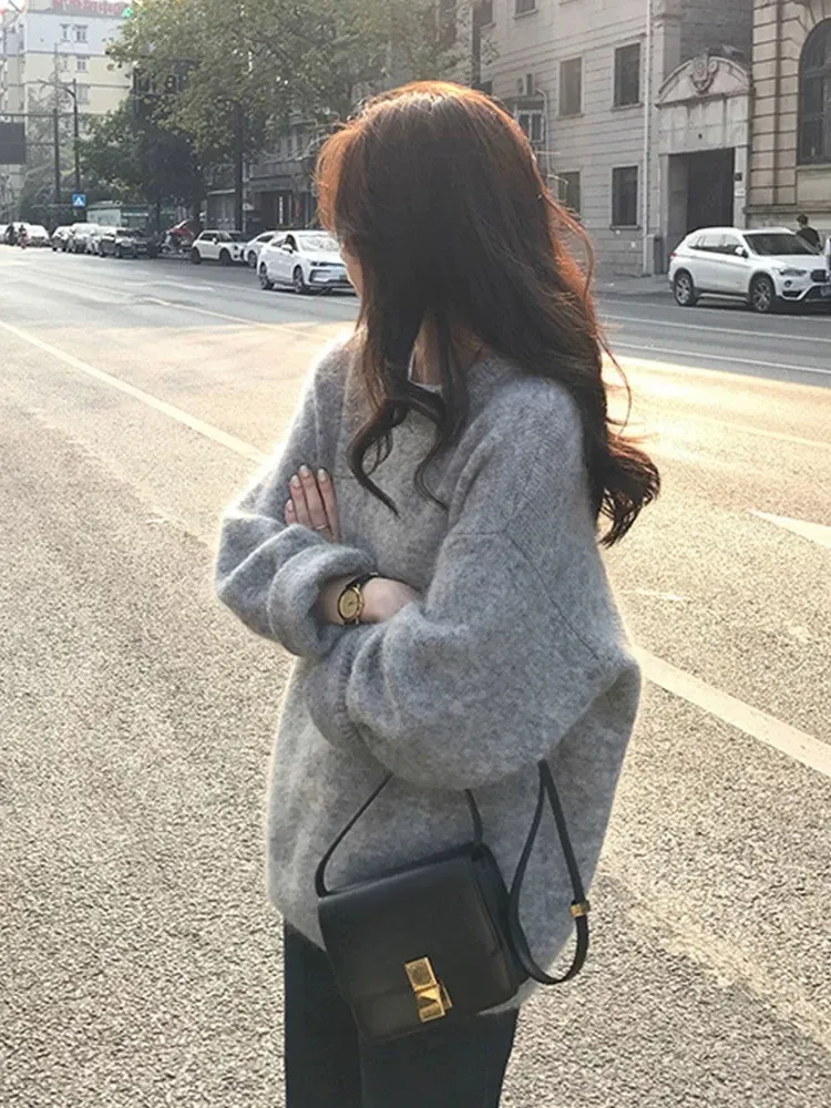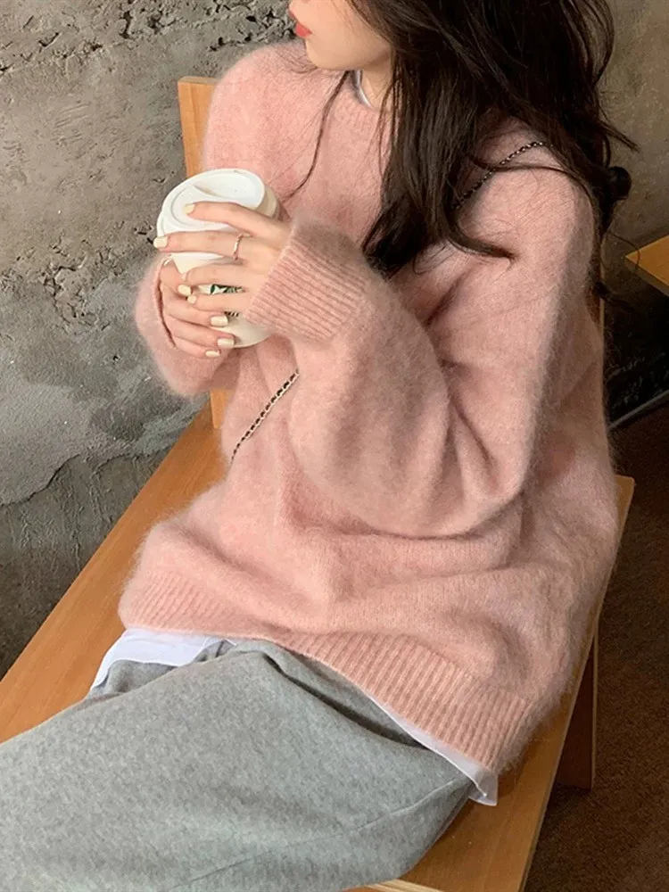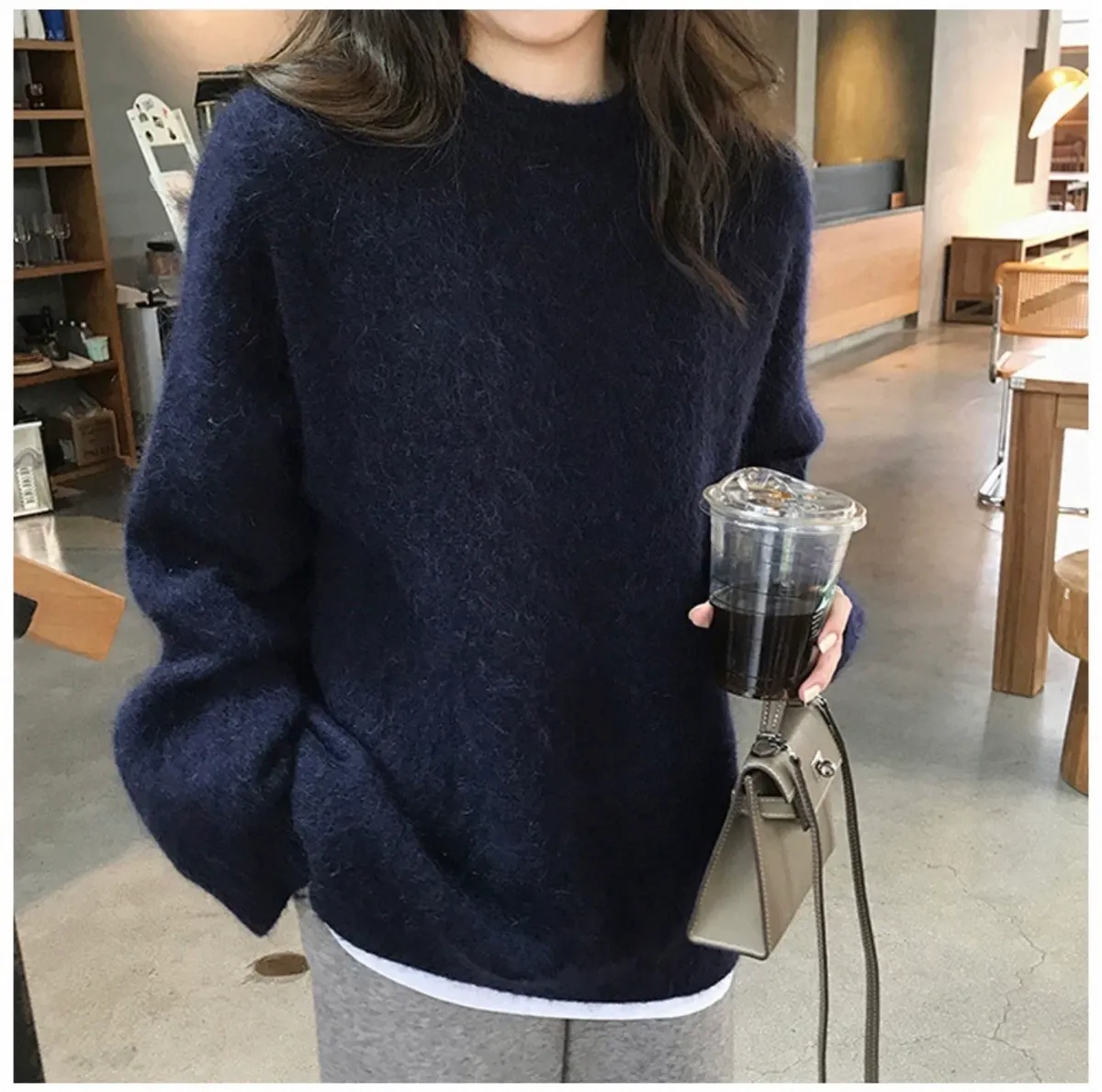 純色馬海毛軟糯慵懶感圓領針織毛衣