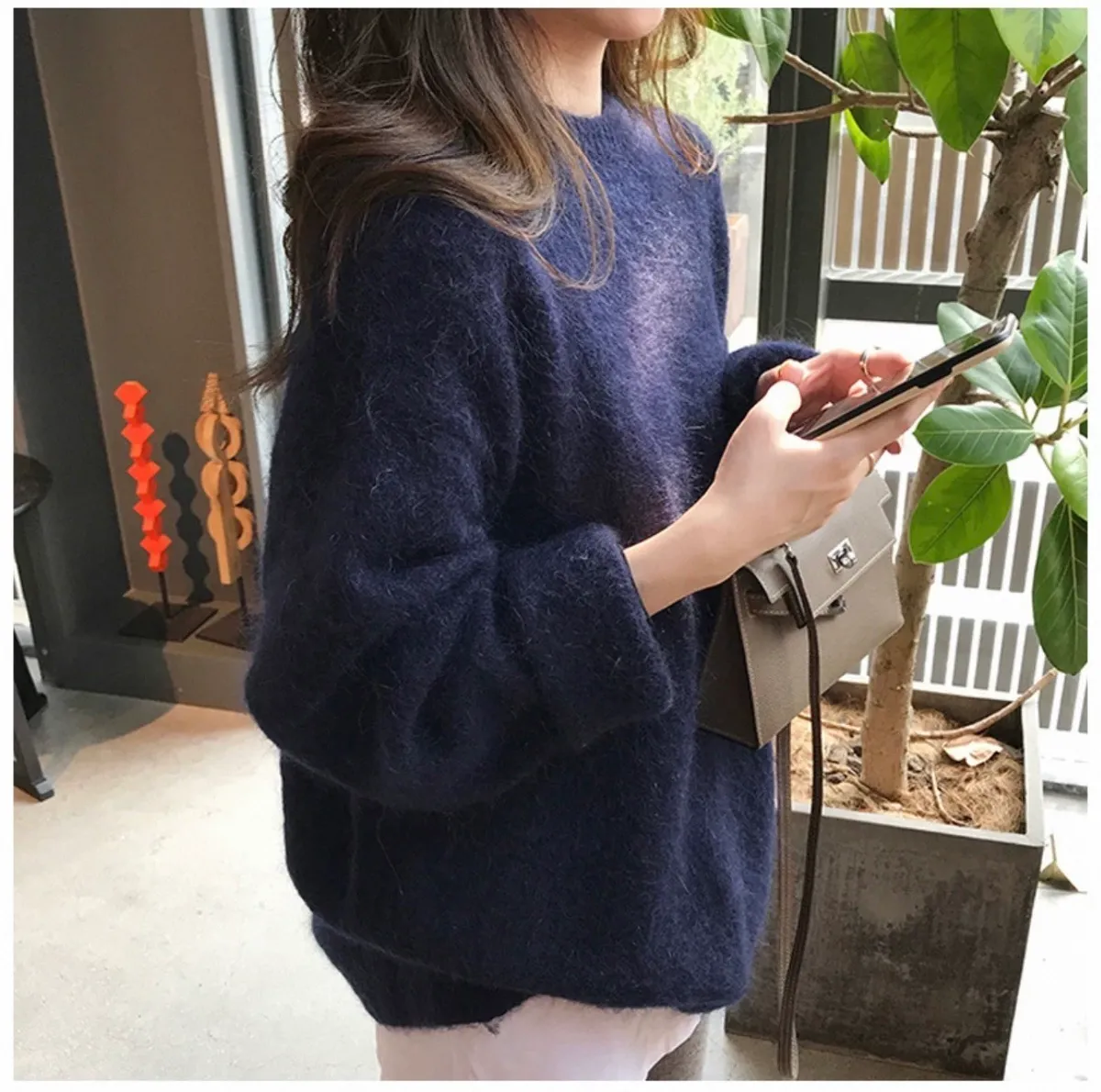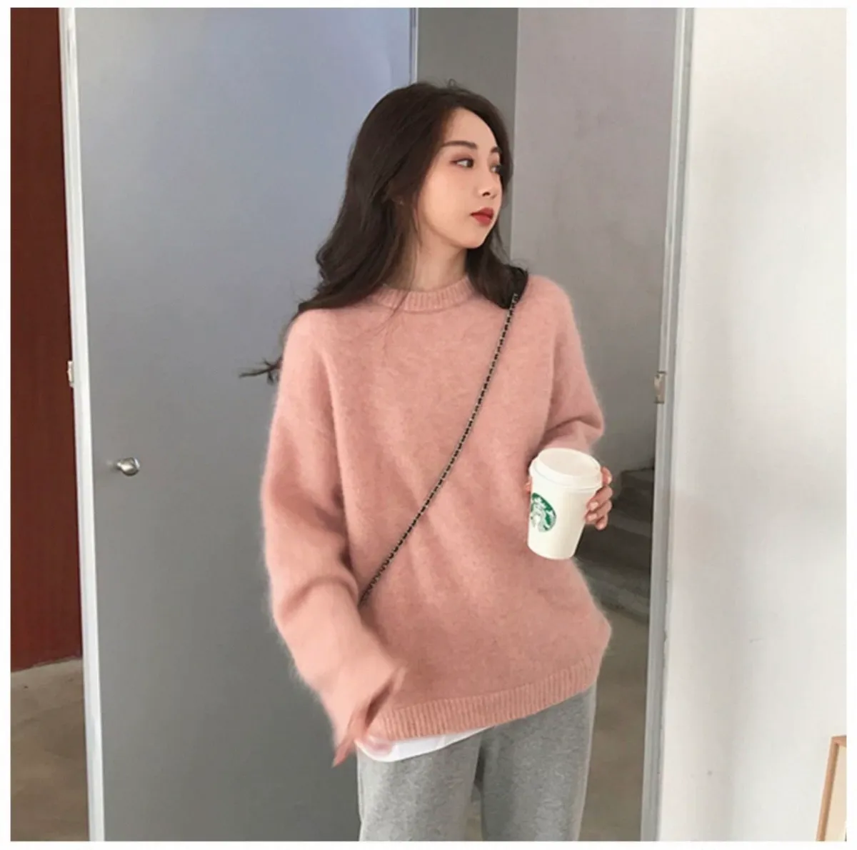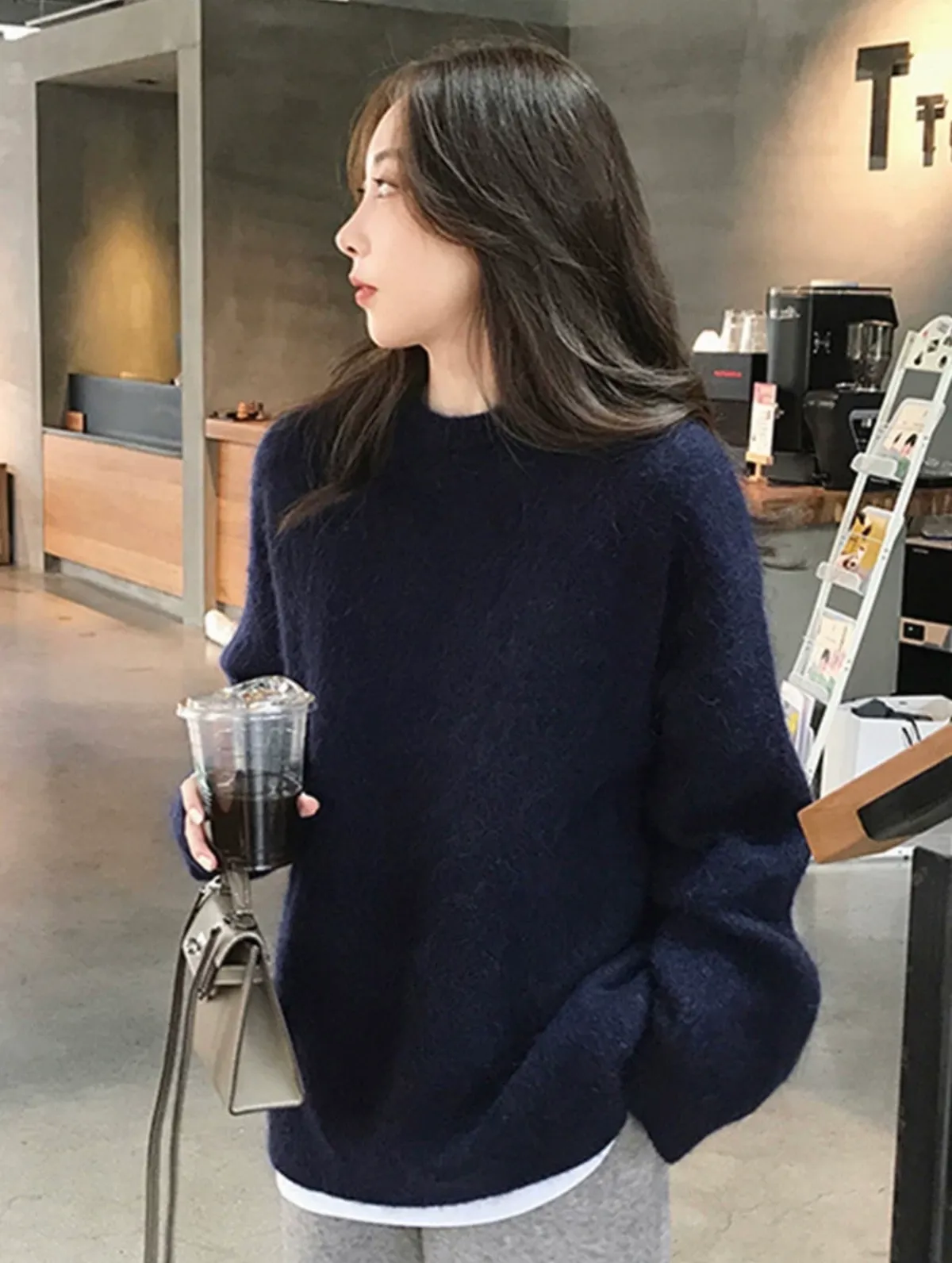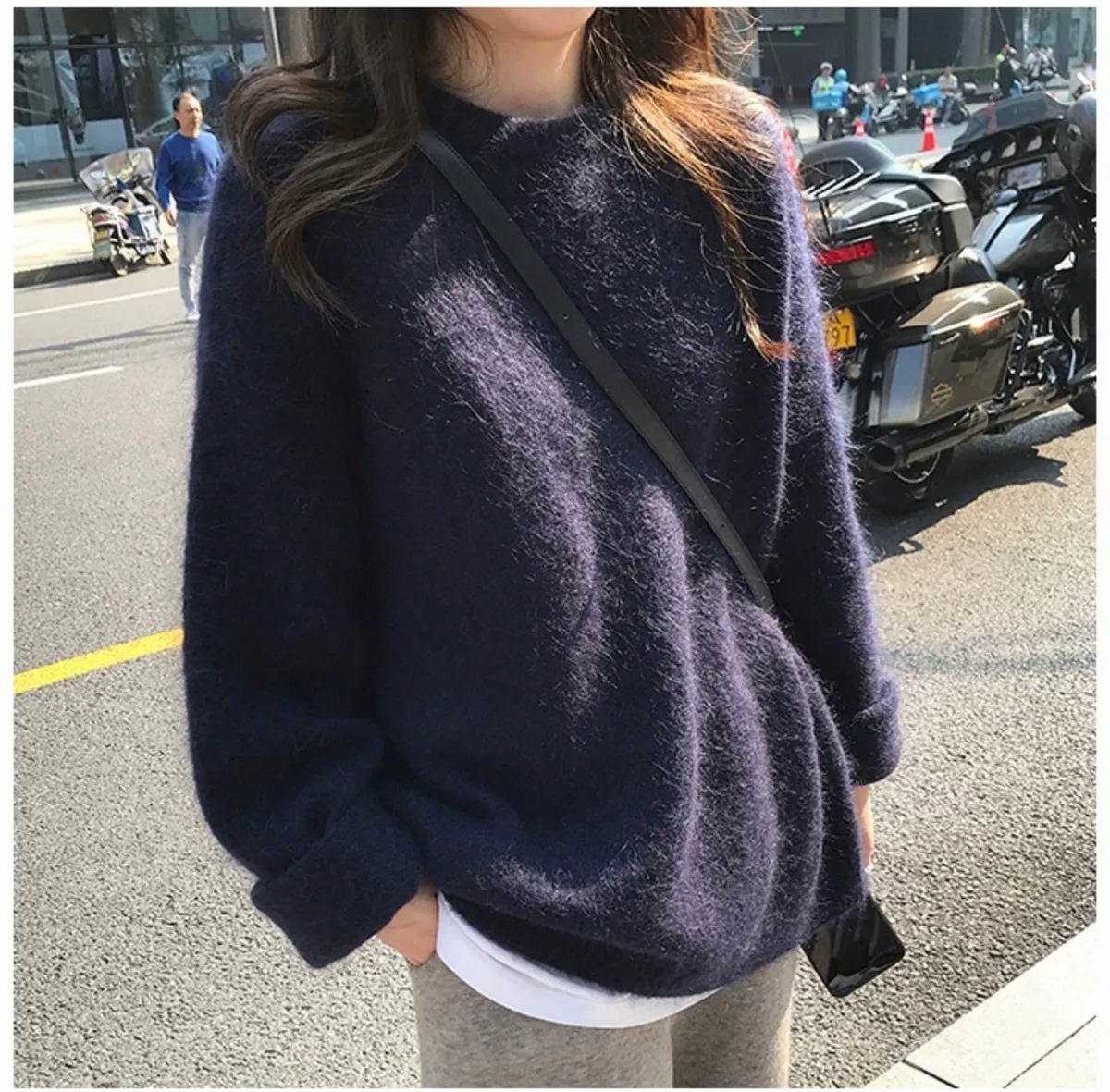 純色馬海毛軟糯慵懶感圓領針織毛衣