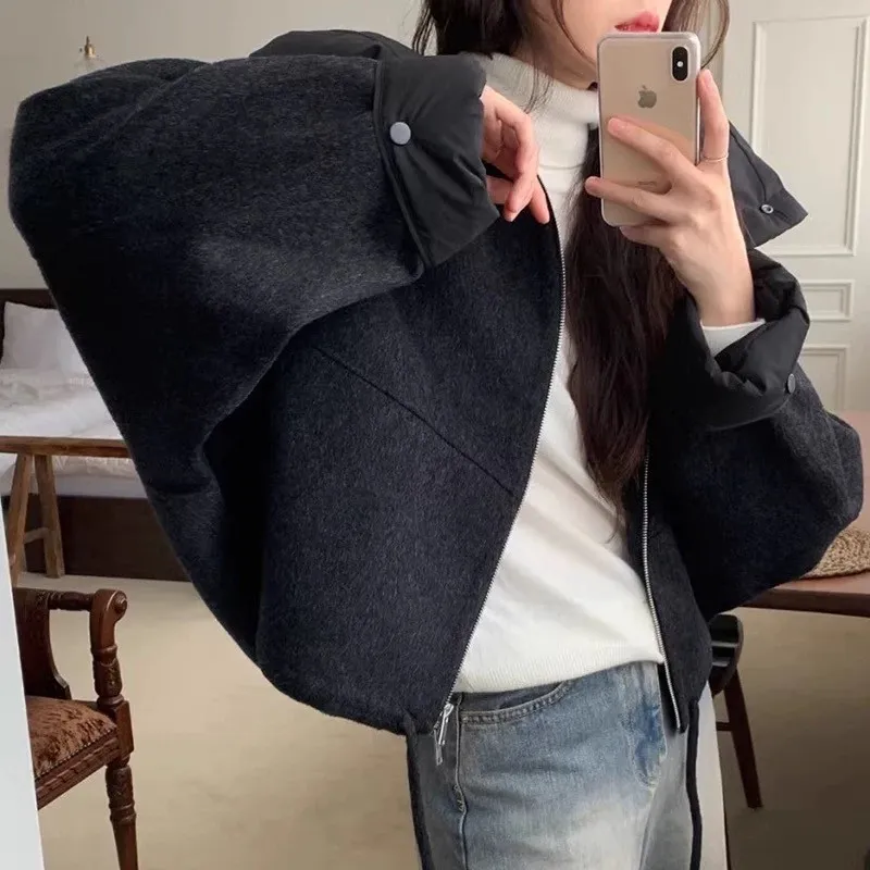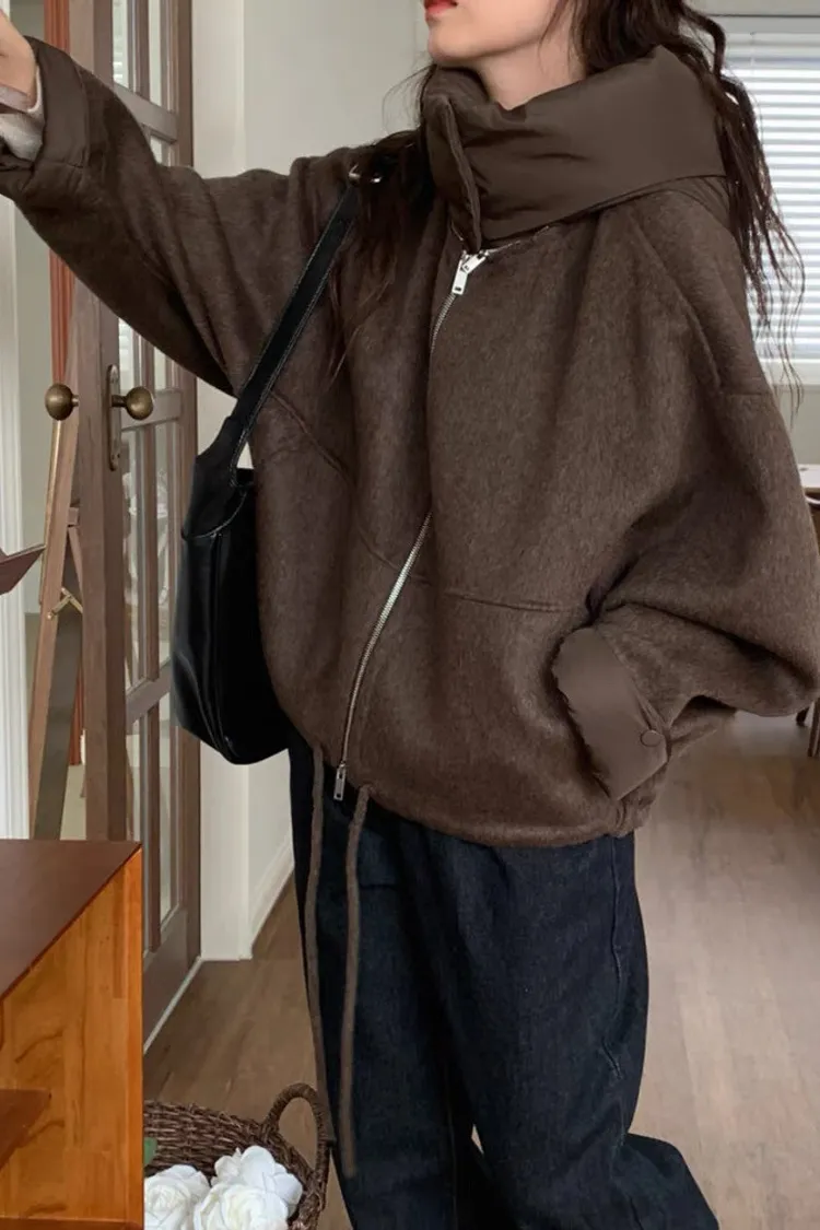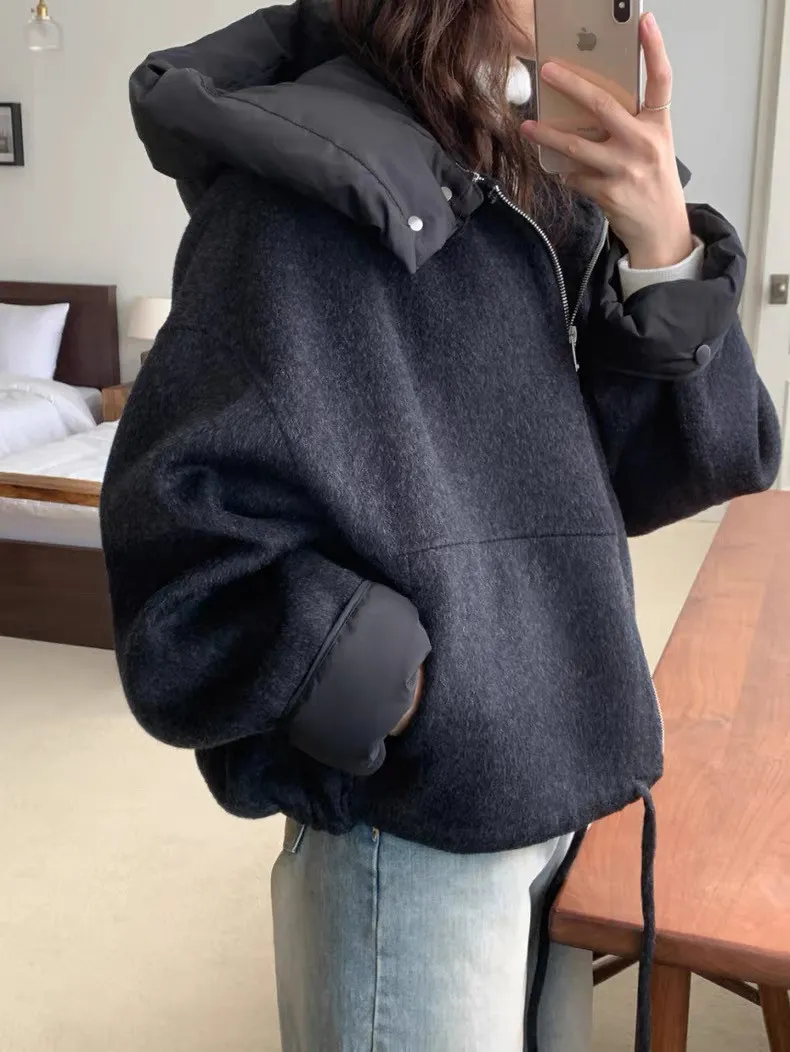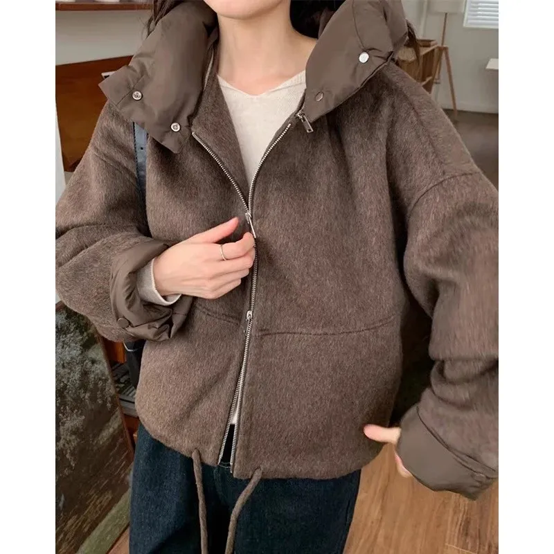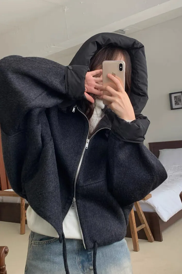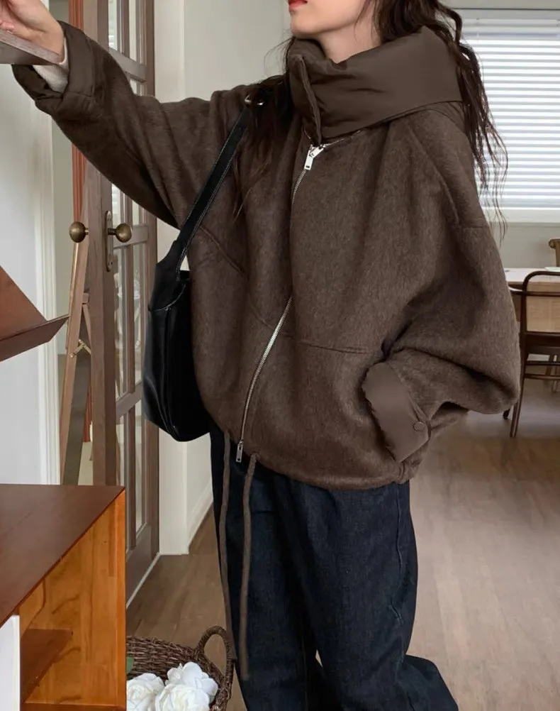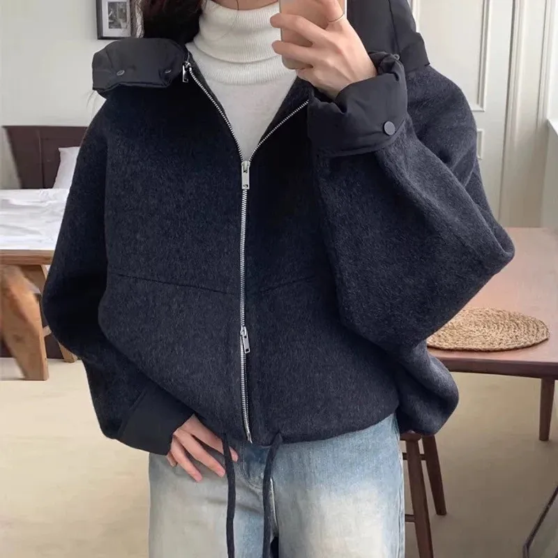 秋冬小眾設計寬鬆感大領毛呢連帽外套