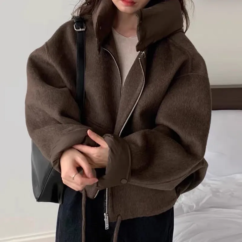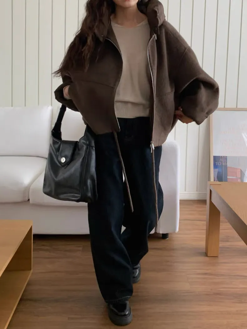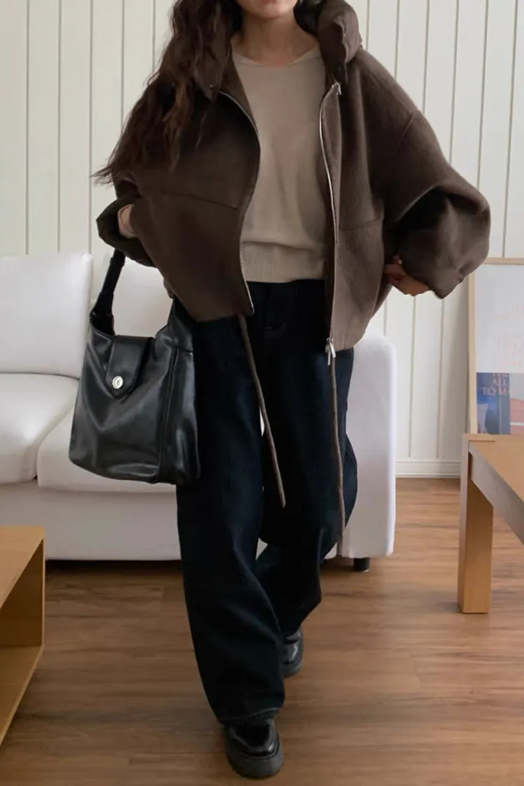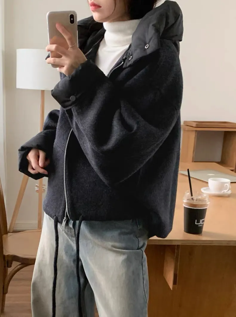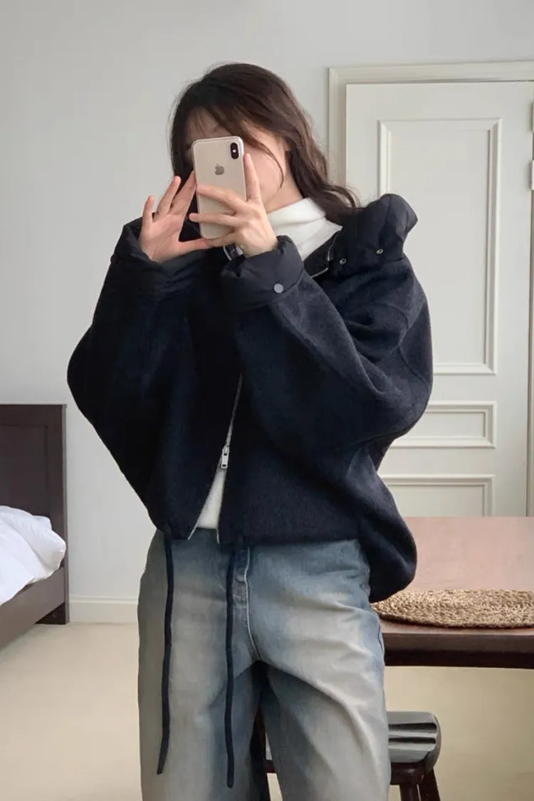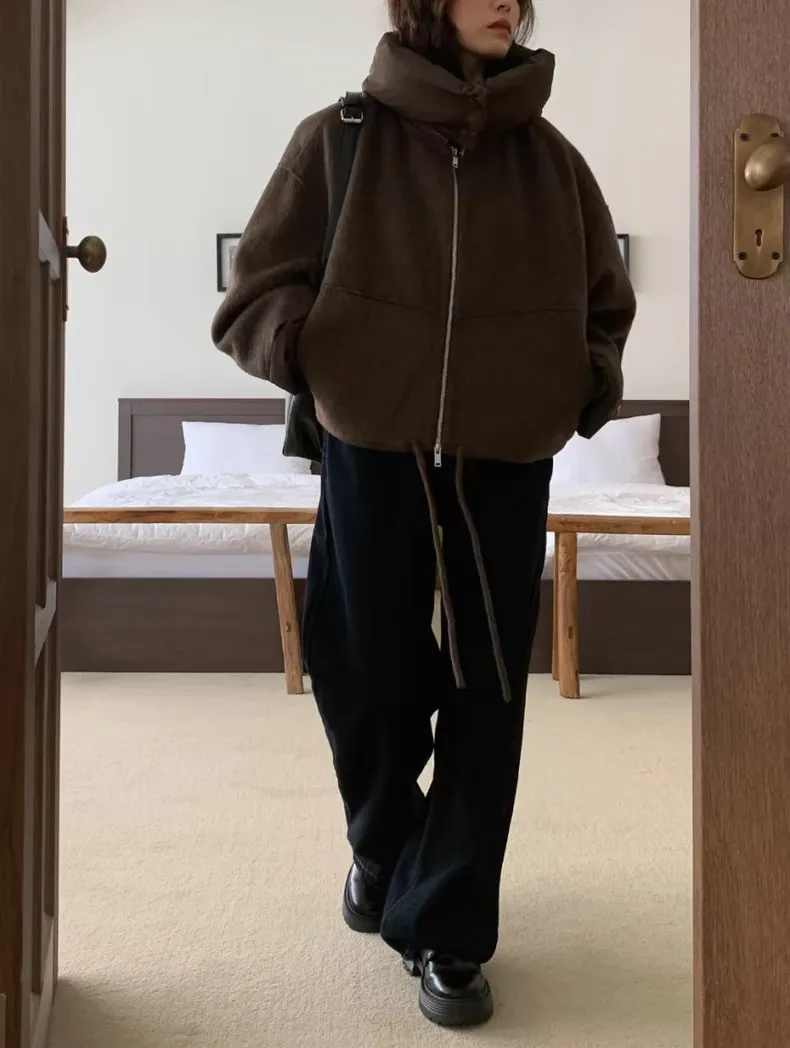 秋冬小眾設計寬鬆感大領毛呢連帽外套