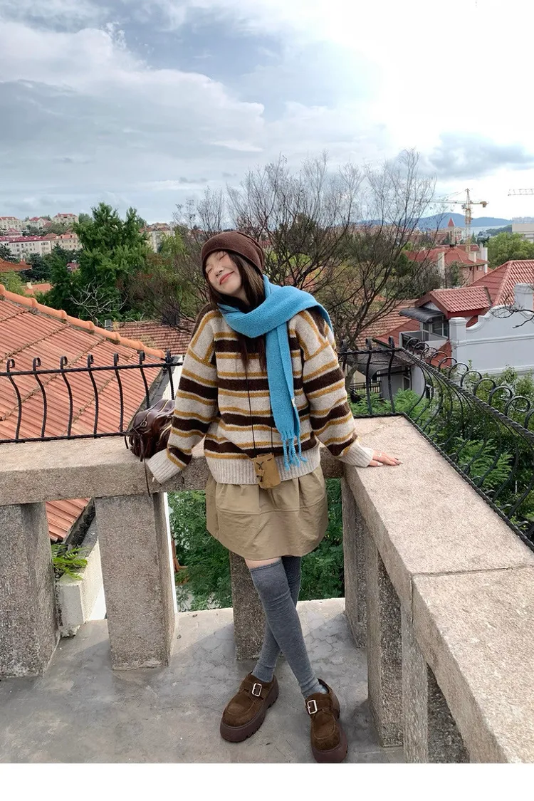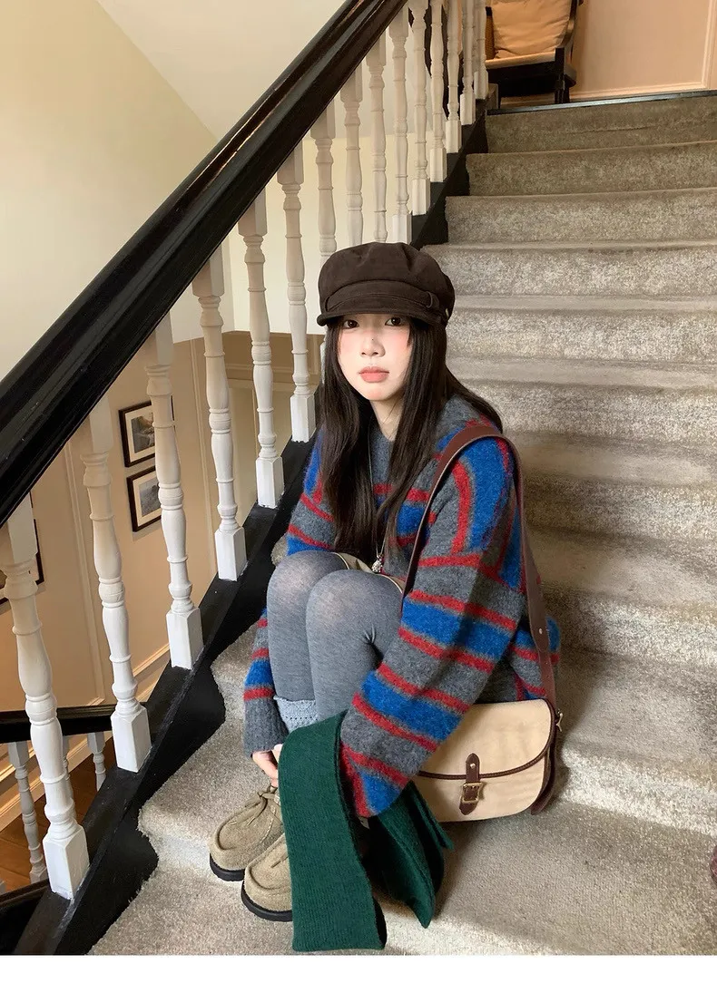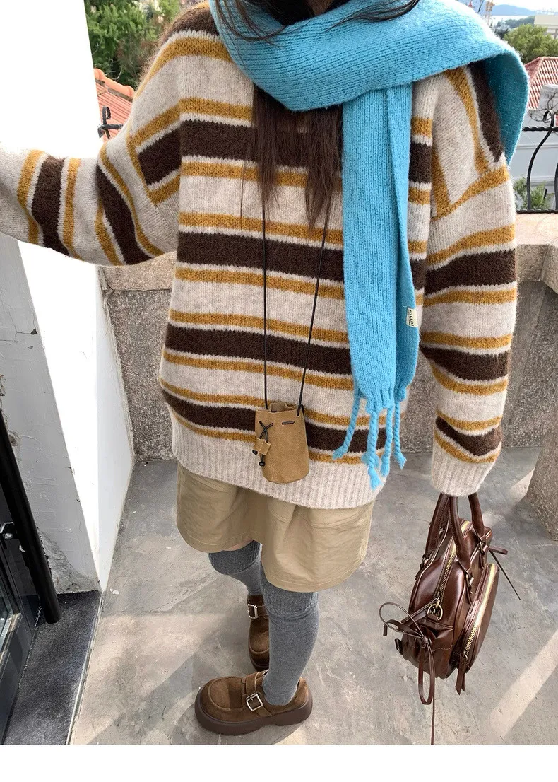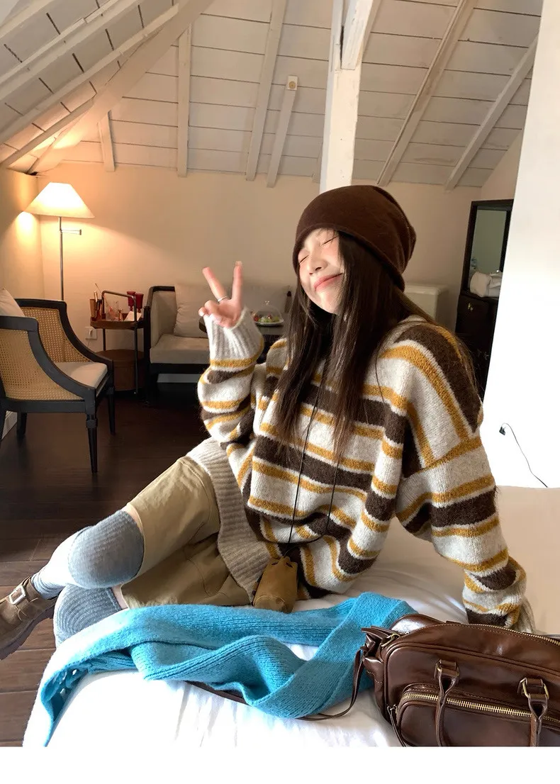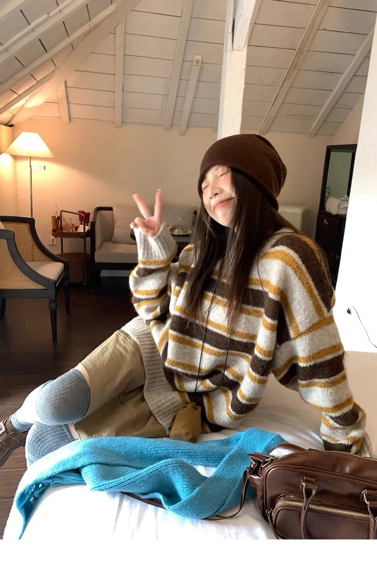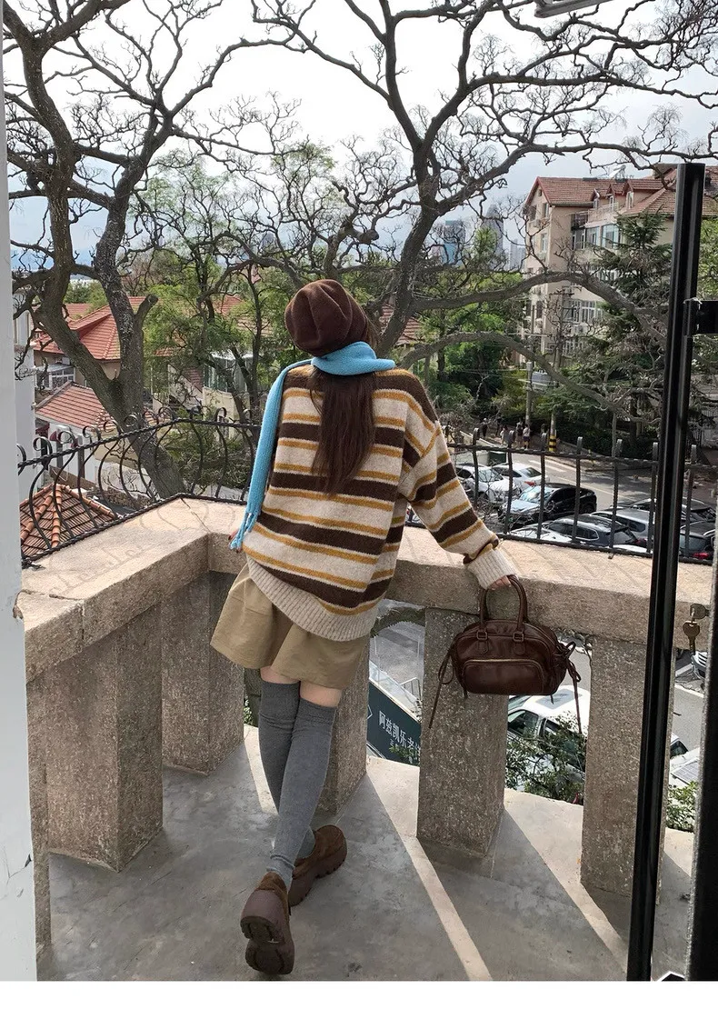 復古色調撞色條紋圓領針織毛衣