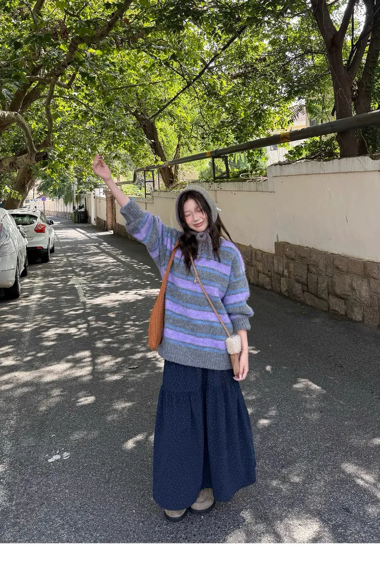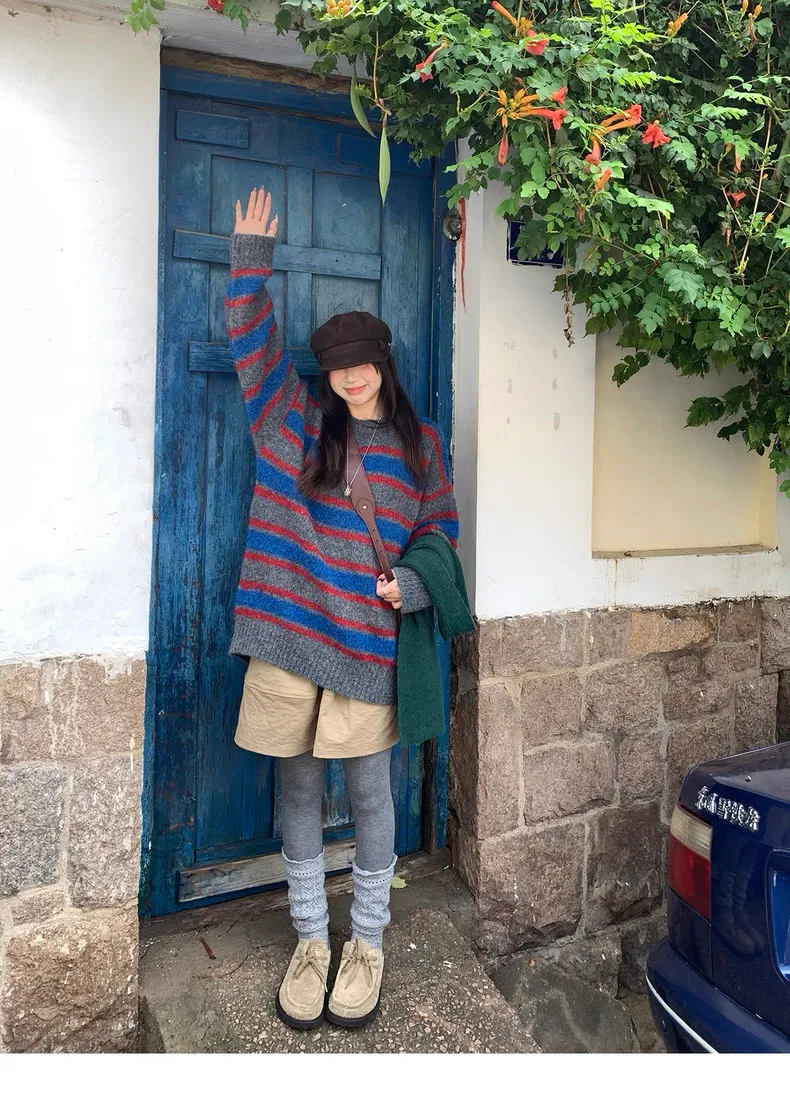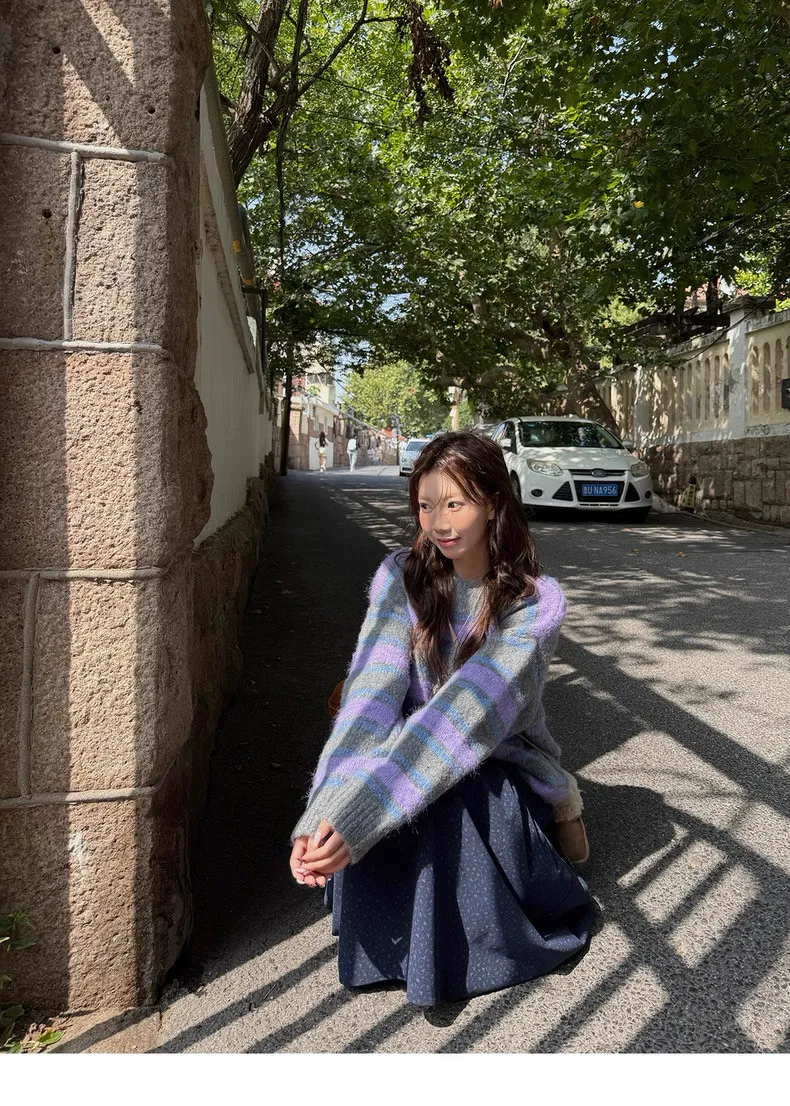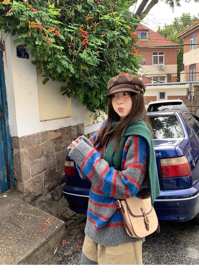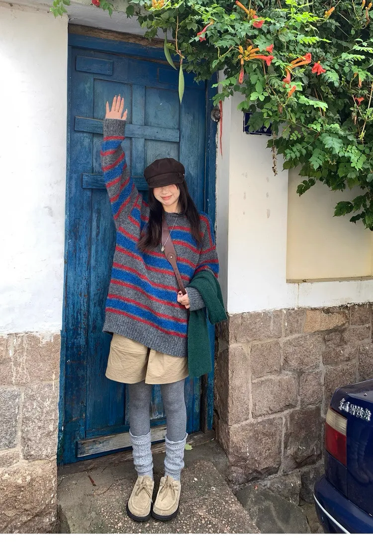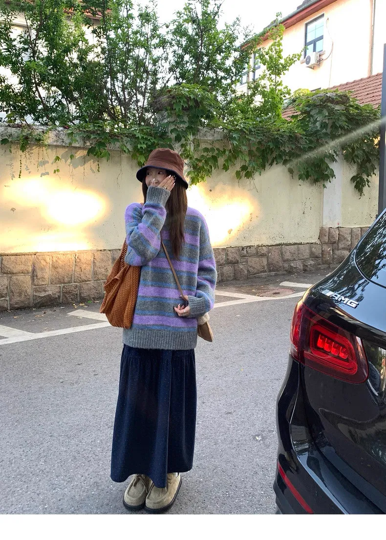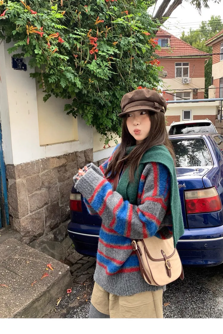 復古色調撞色條紋圓領針織毛衣