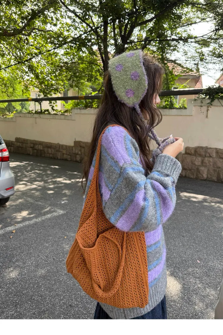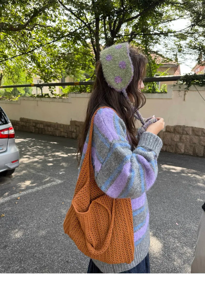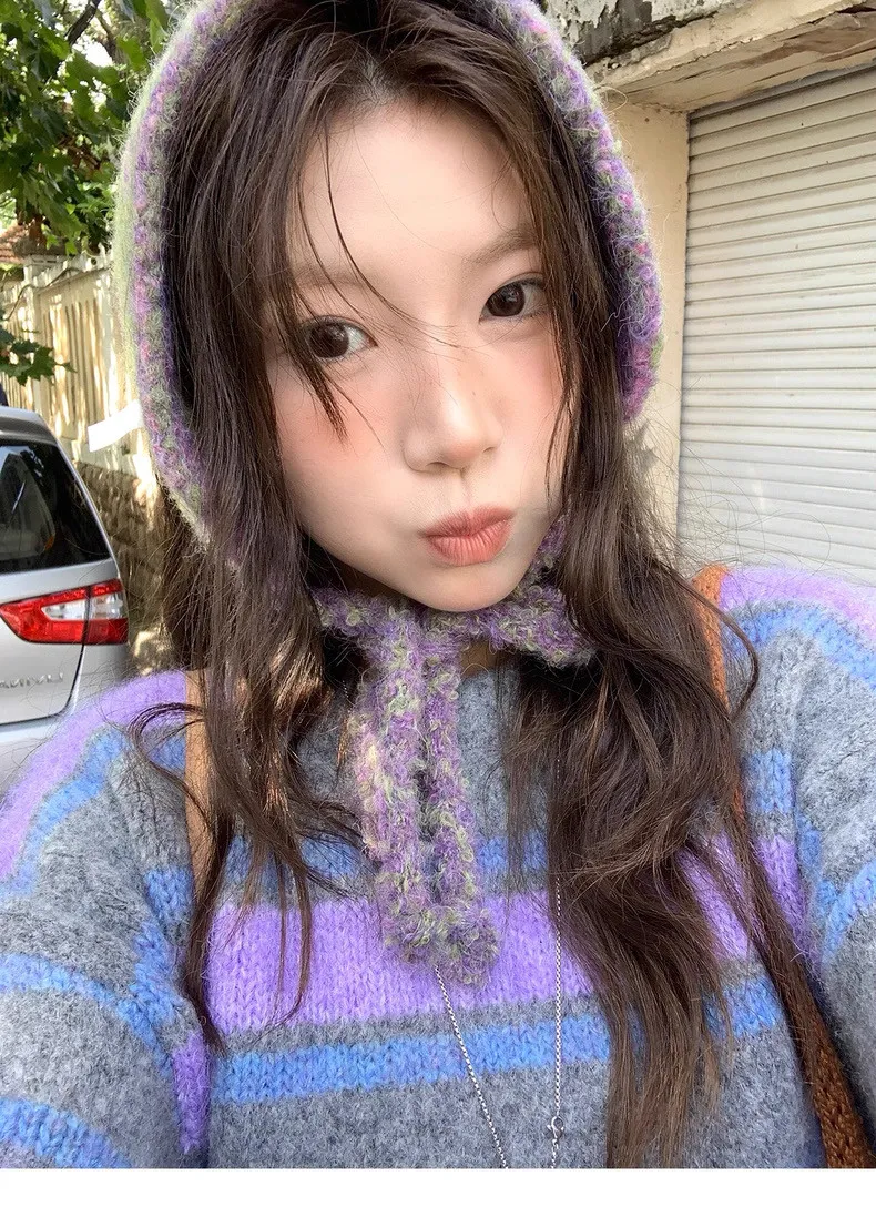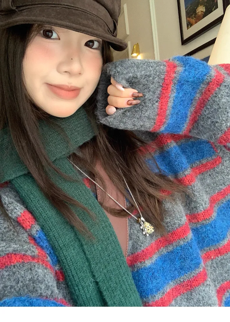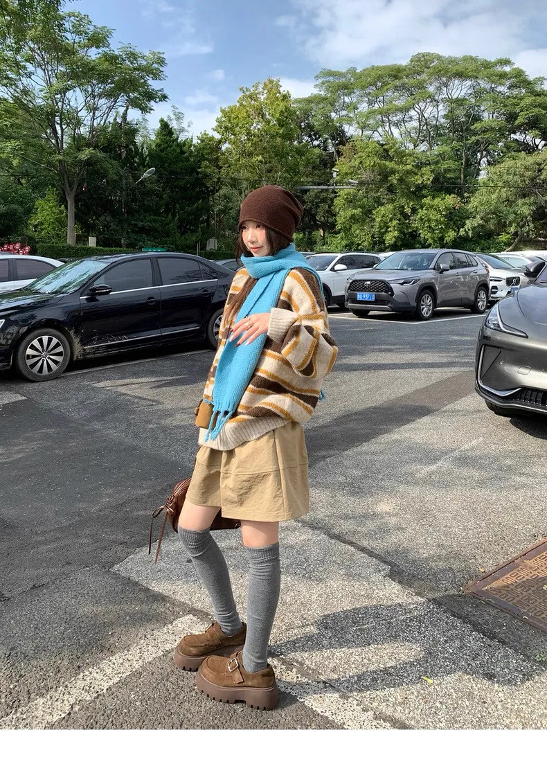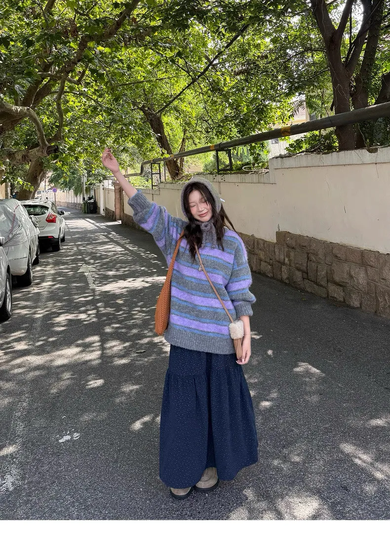 復古色調撞色條紋圓領針織毛衣