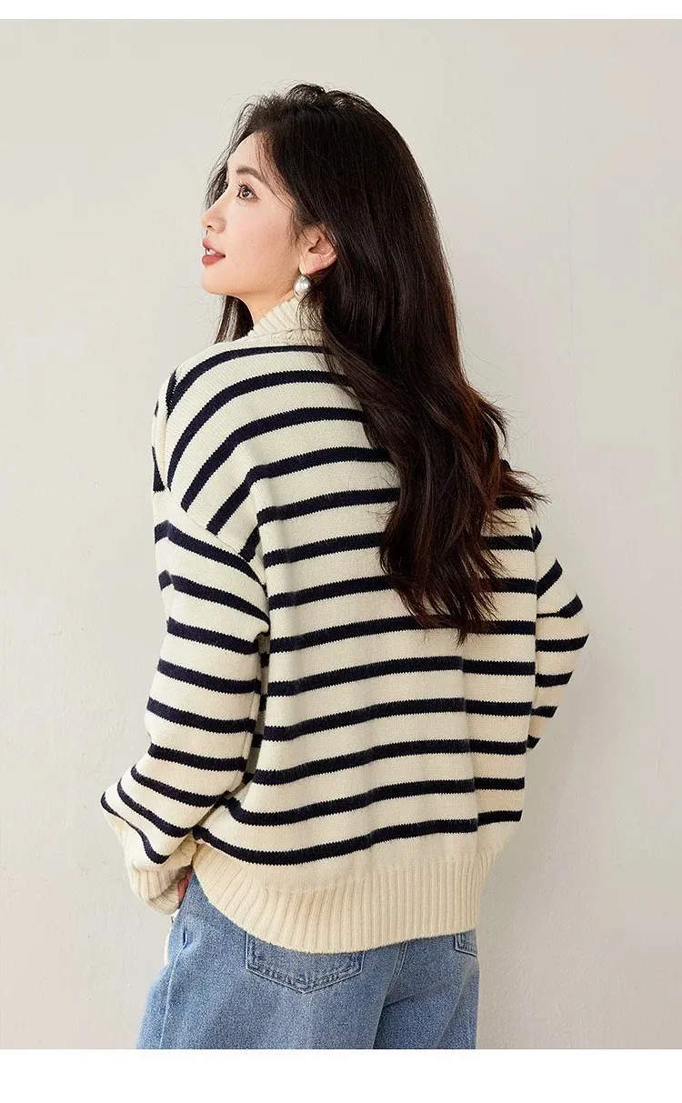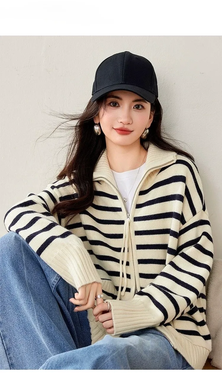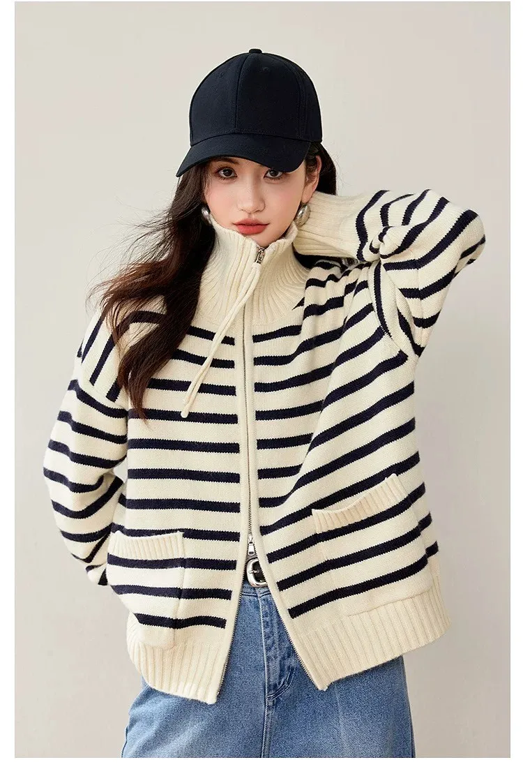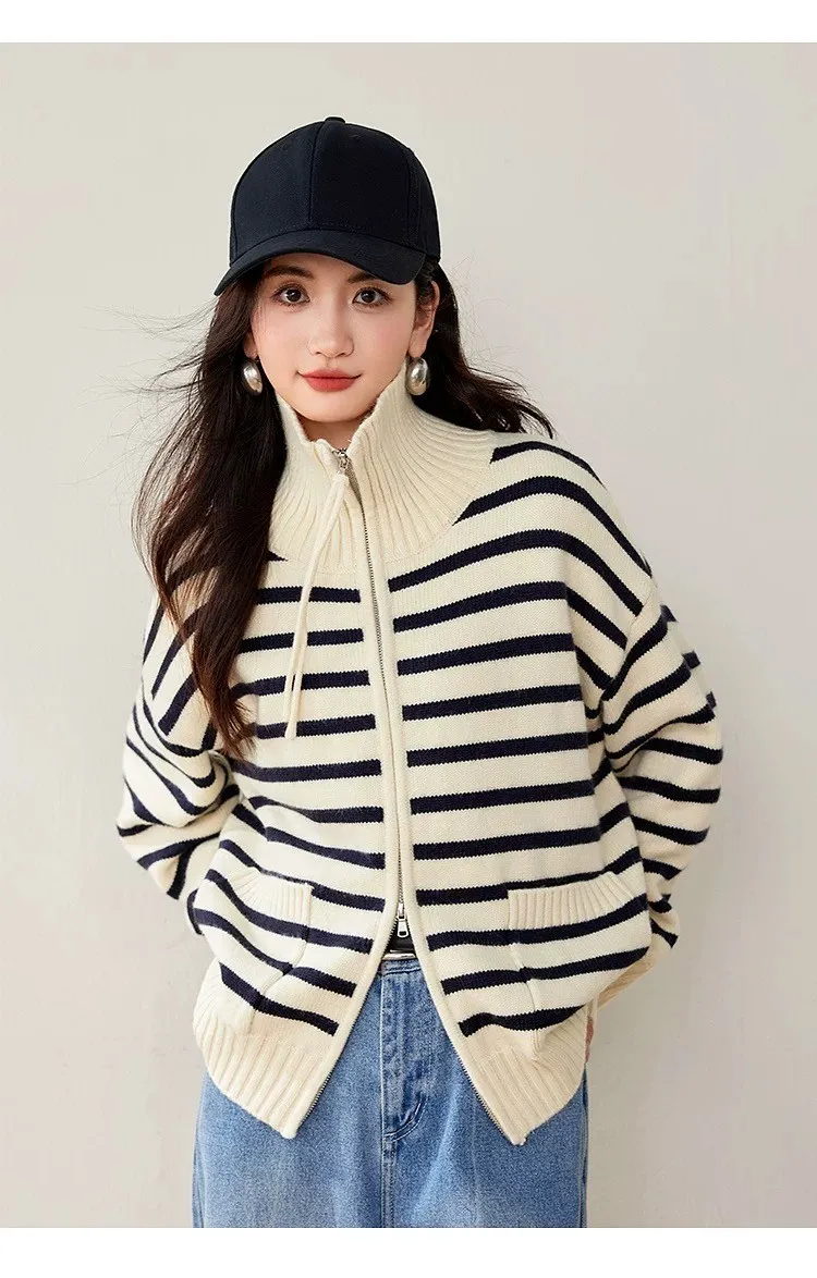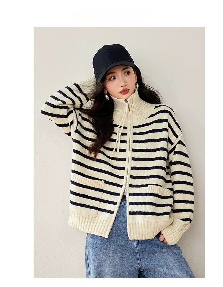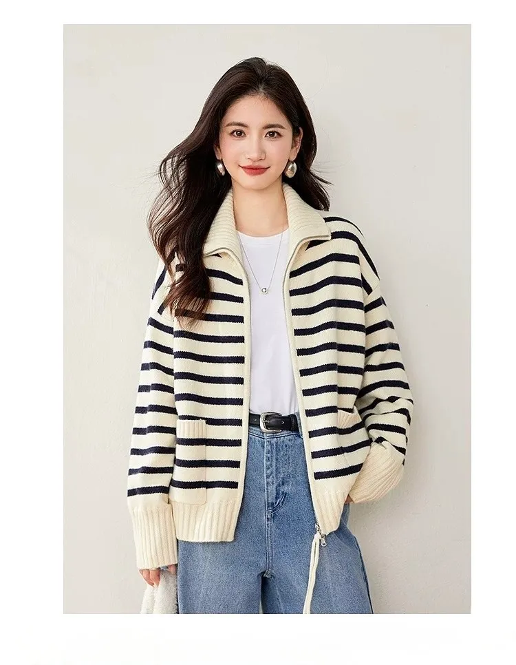 雙口袋條紋雙向拉線翻領針織外套