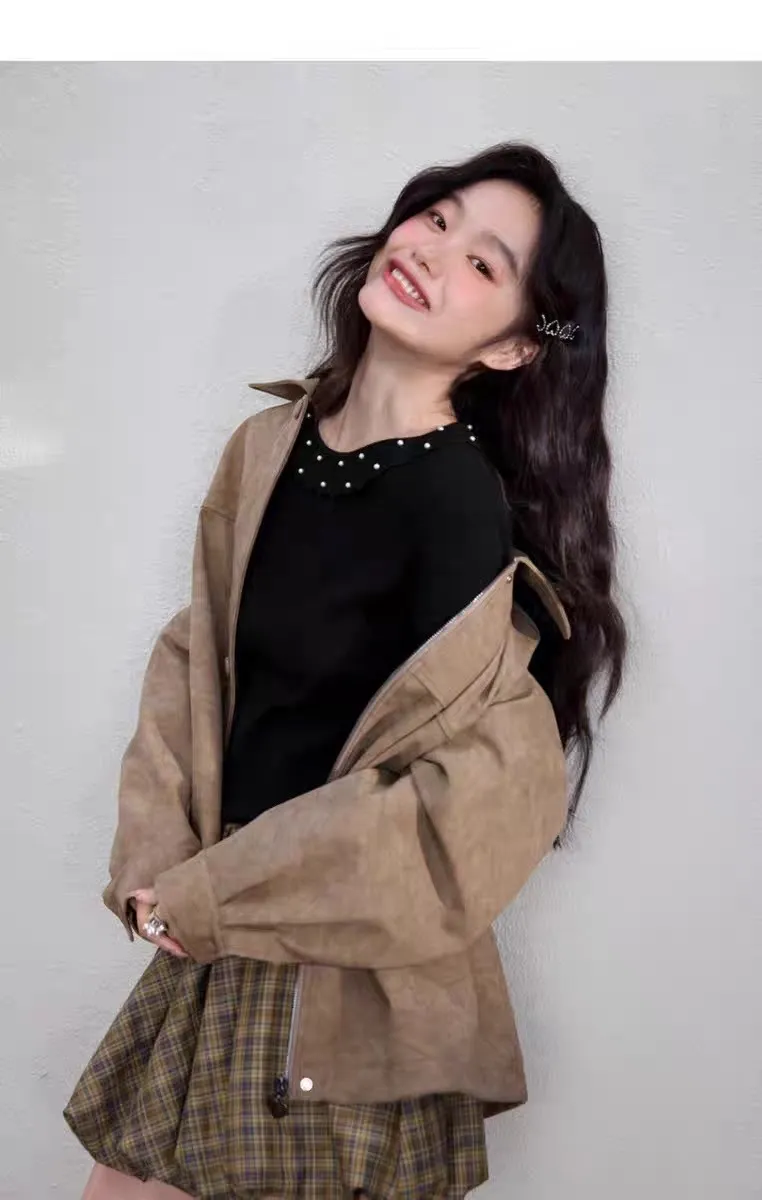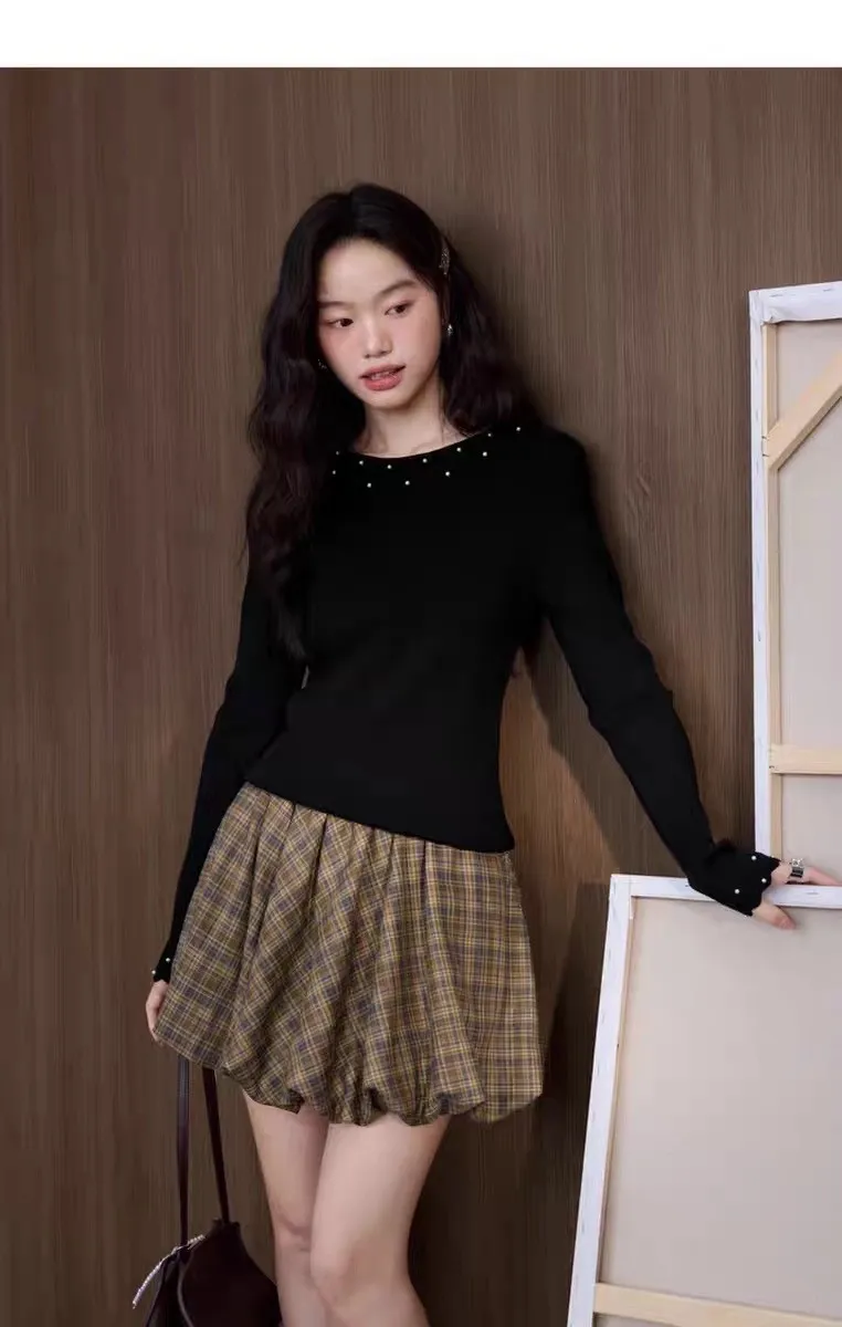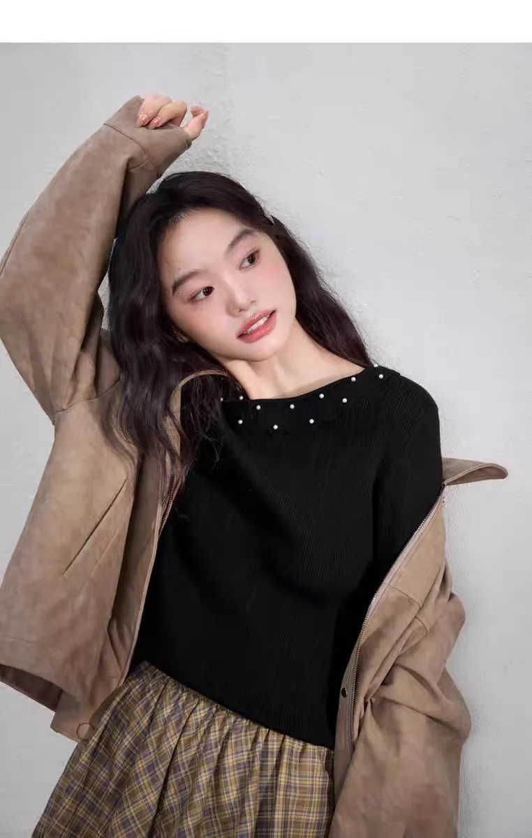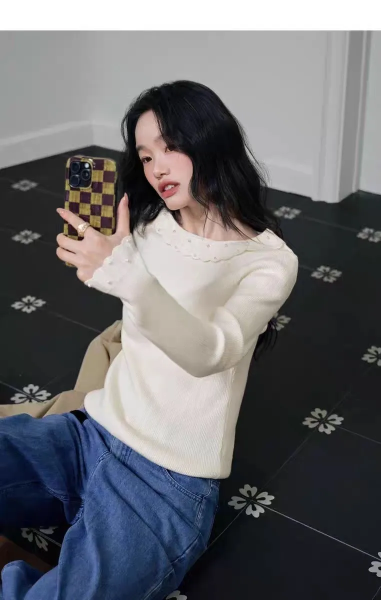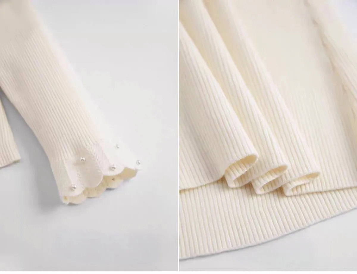 冬日暖暖木耳邊小珍珠裝飾針織打底衫