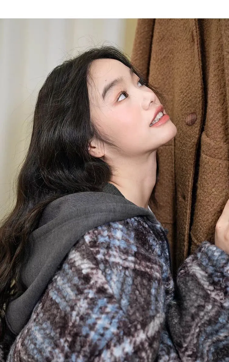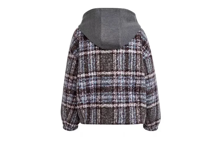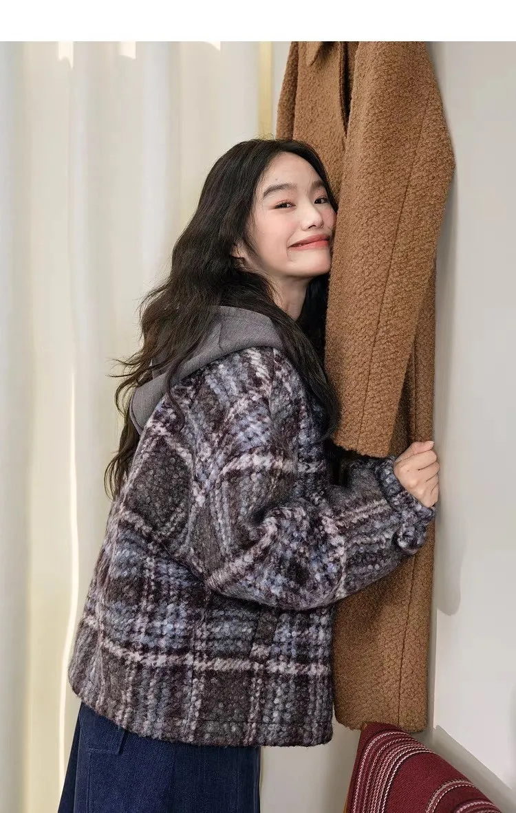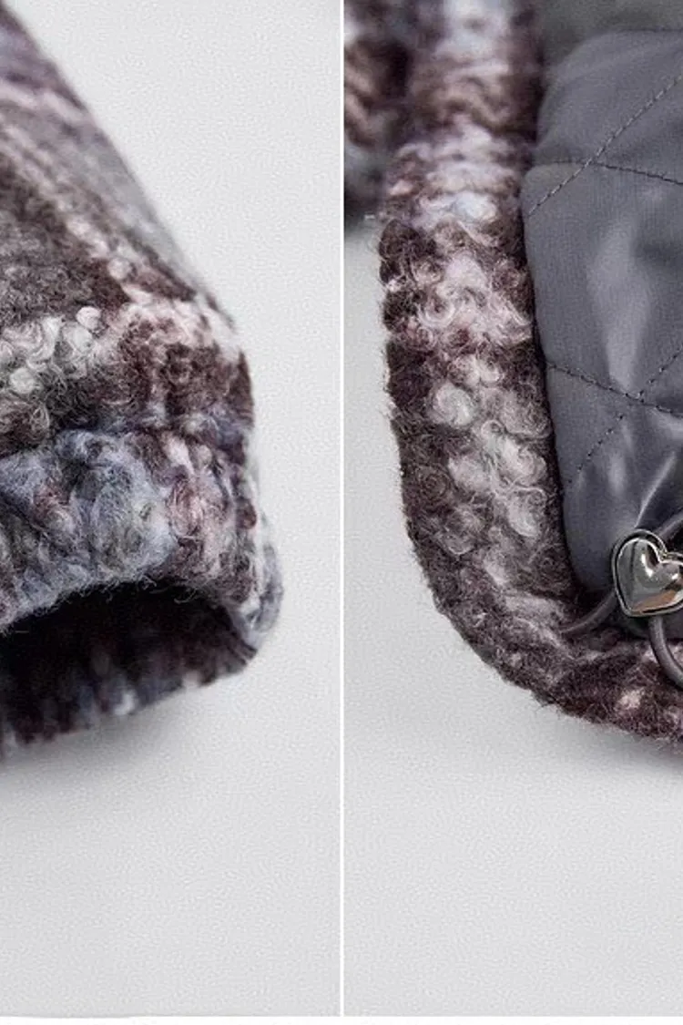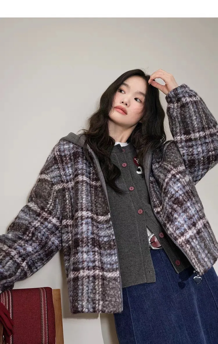 暖冬格紋拼接連帽愛心釦仿羊羔絨鋪棉外套