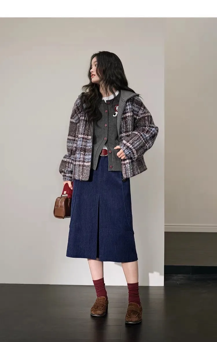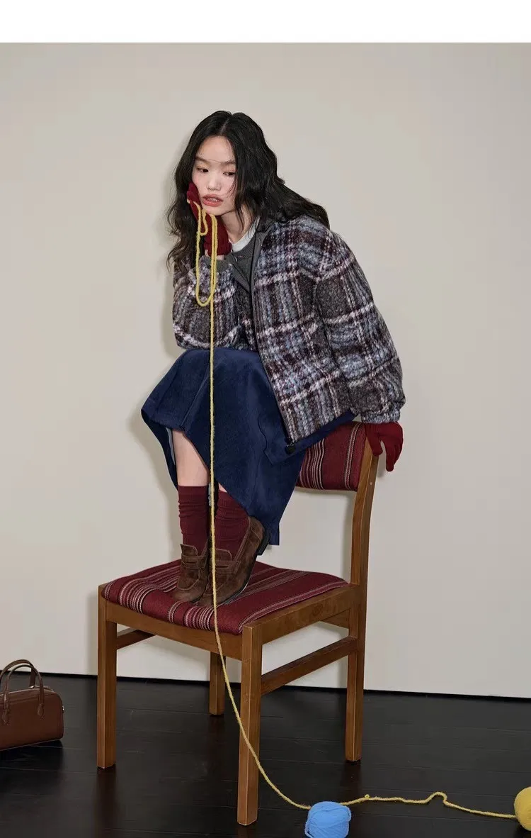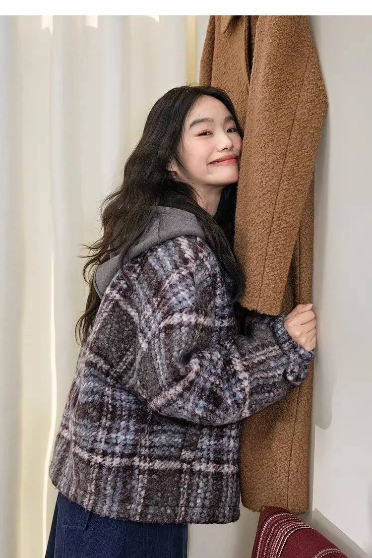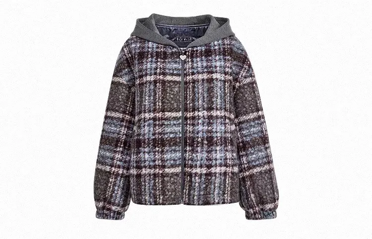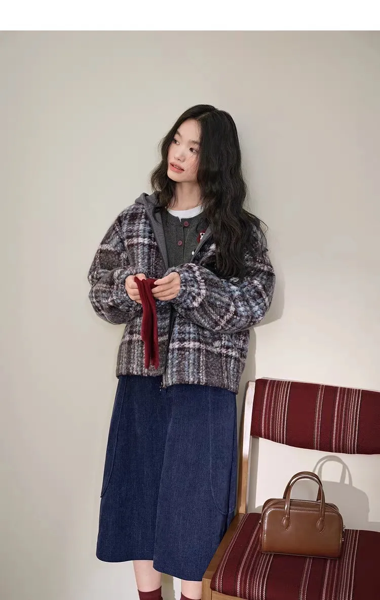 暖冬格紋拼接連帽愛心釦仿羊羔絨鋪棉外套
